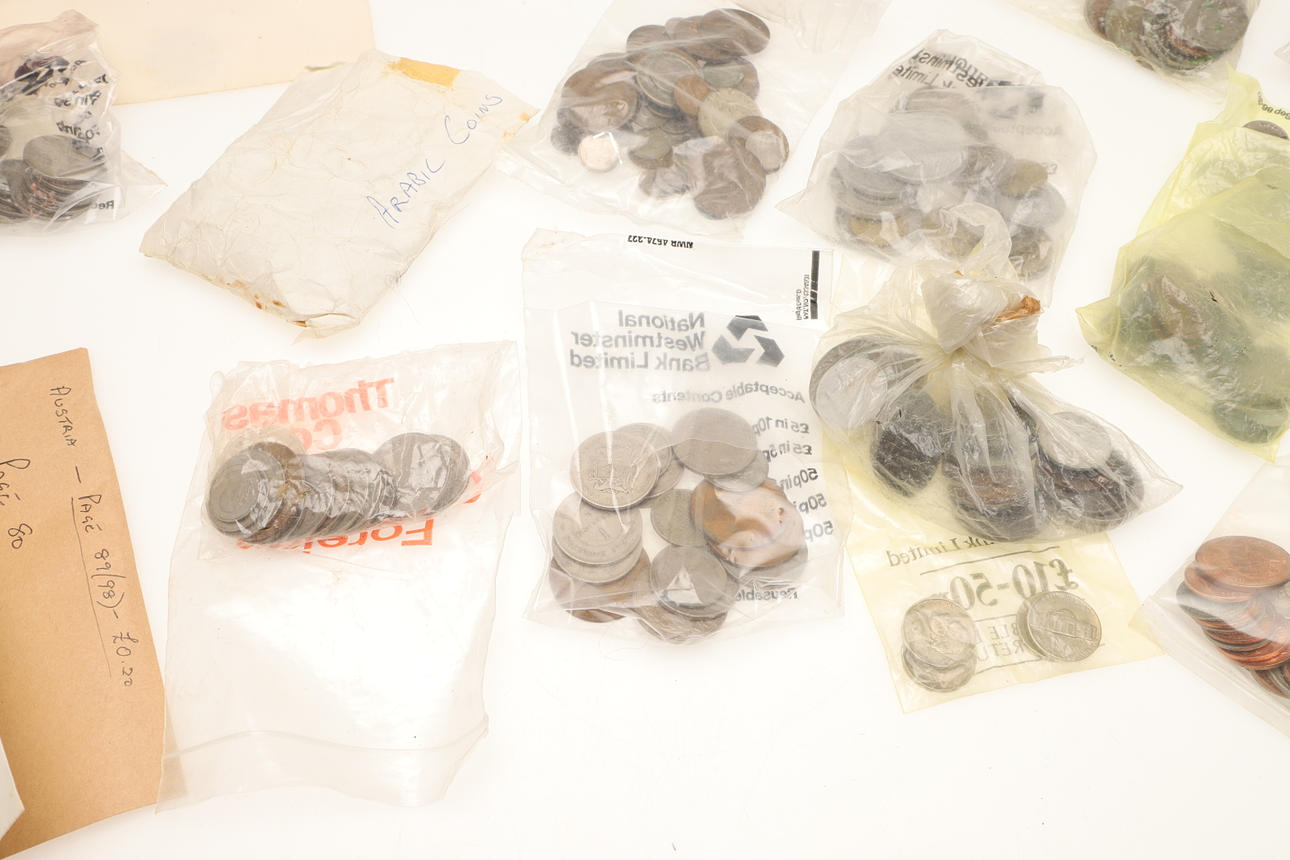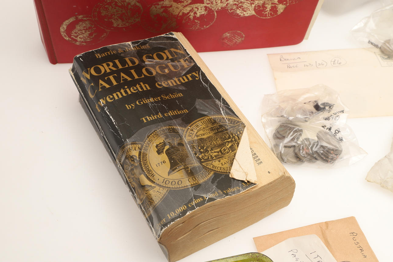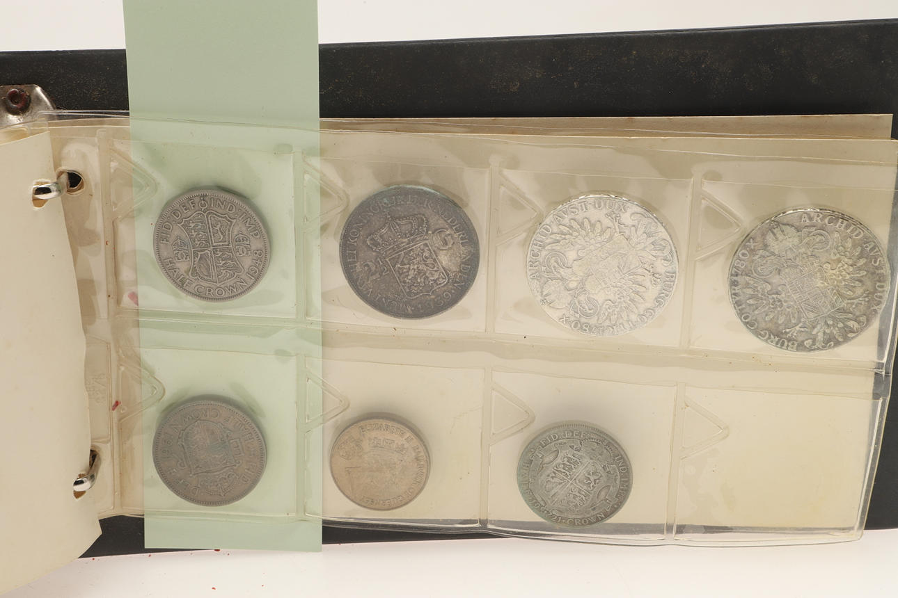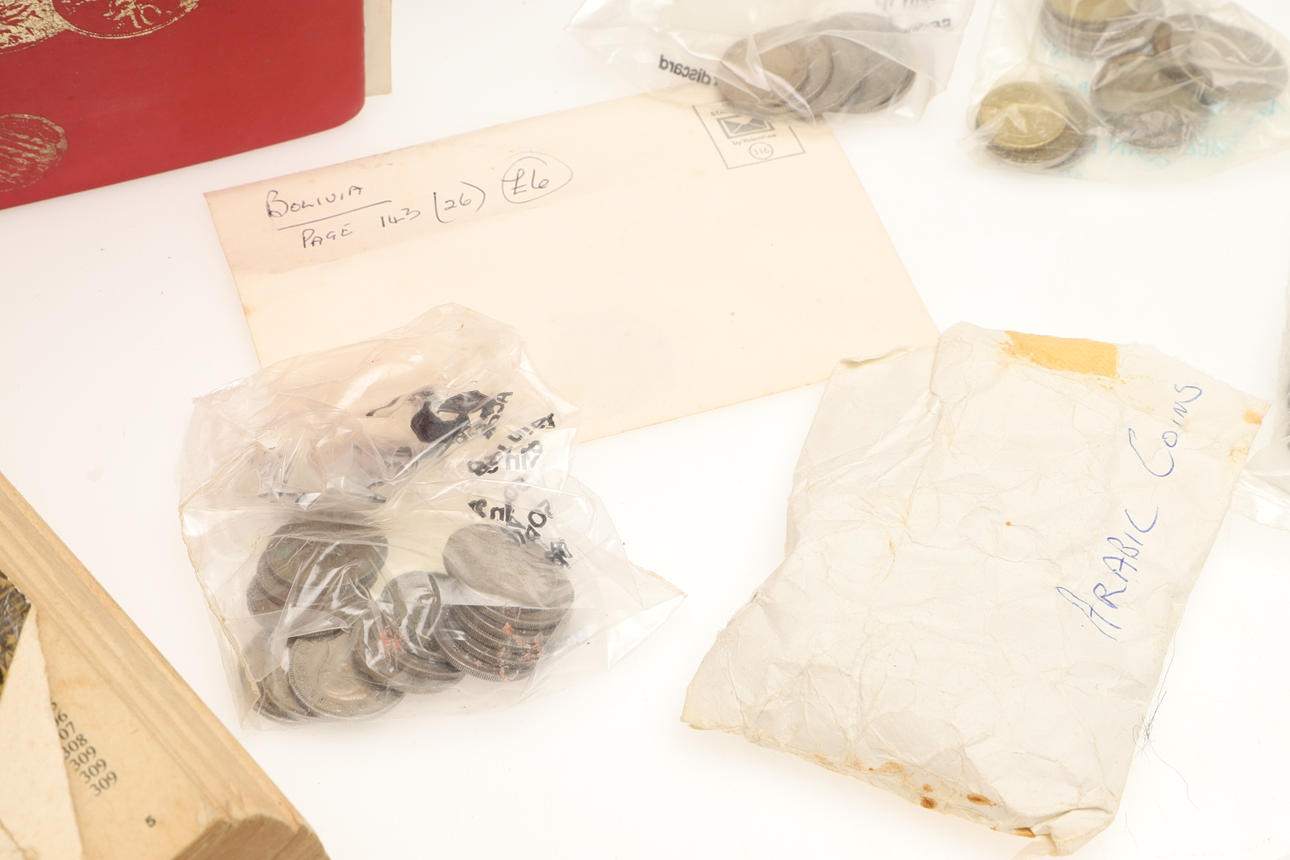 Suuri sekoitettu erä, joka sisältää albumin, jossa on erilaisia kolikoita, mukaan lukien Alankomaat 1939 2 1/2 guldenia, Maria Theresa thaler (x2), Florineja jne., ja erilaisia irtonaisia maailmankolikoita, kolikoiden viitekirjoja jne.