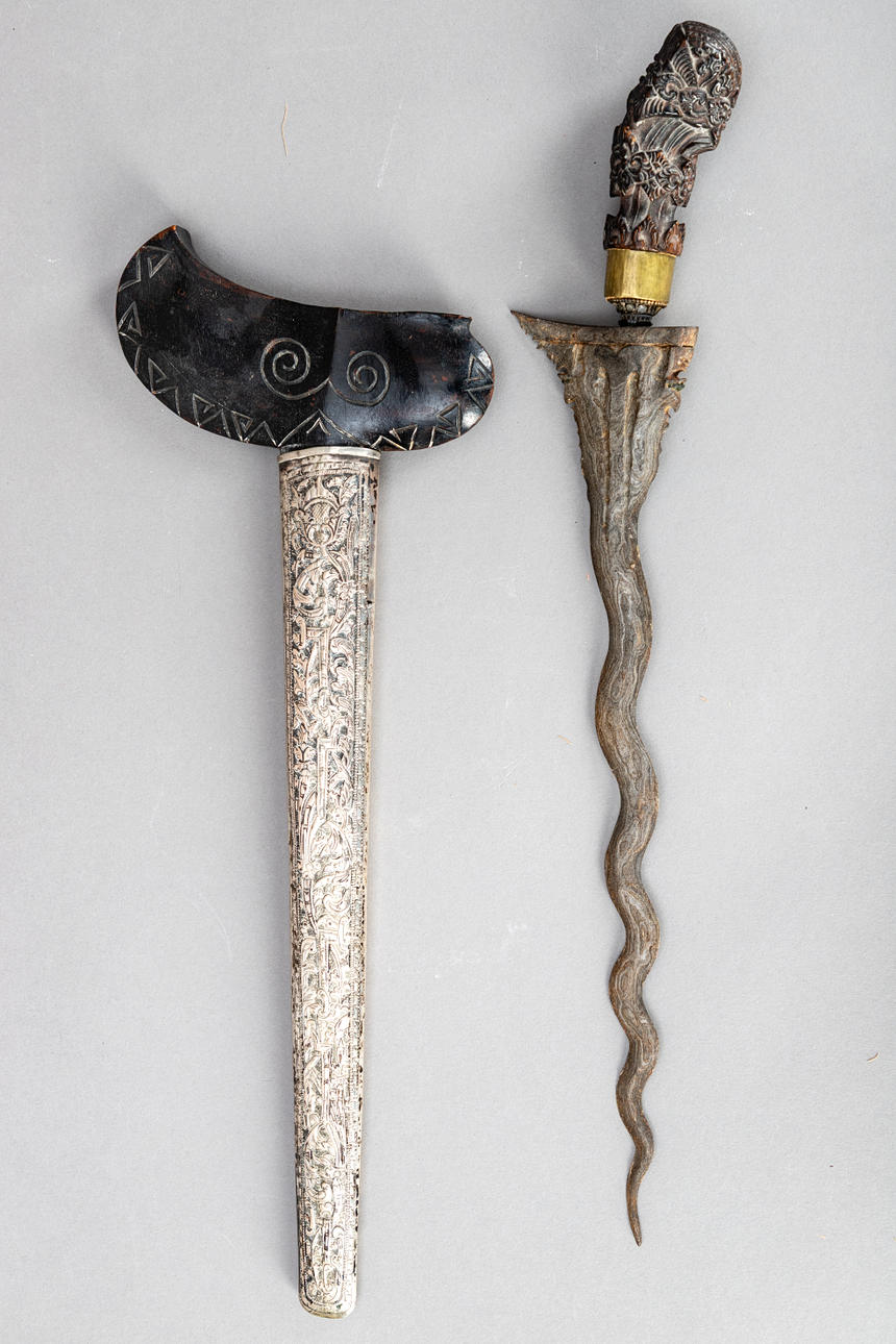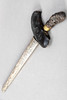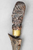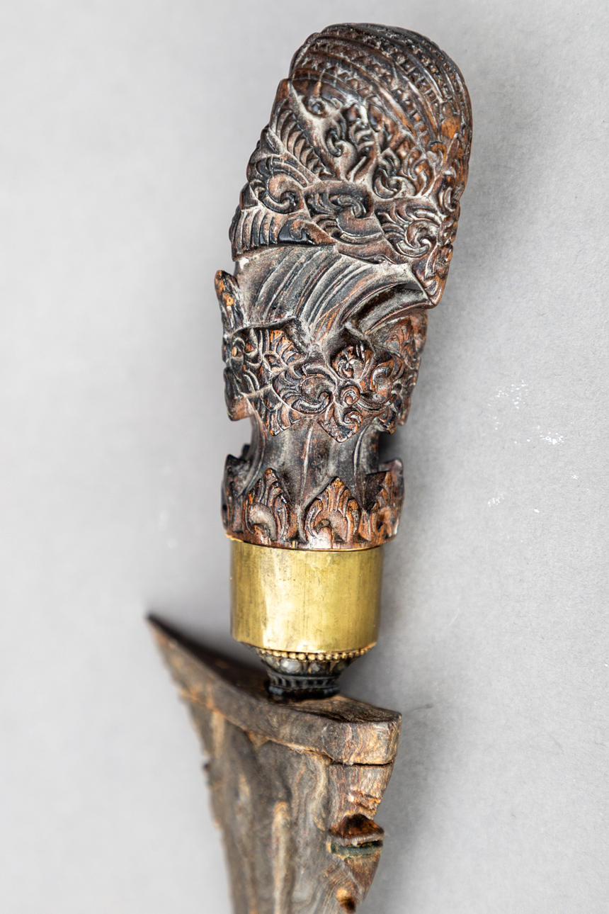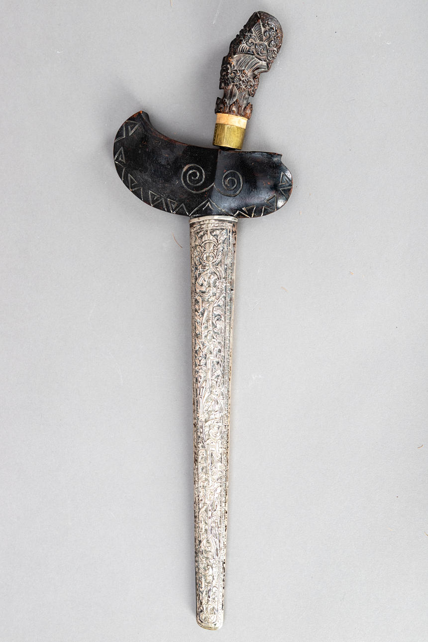 Teräs- ja nikkeliterä, pamor ja 11 luk, kahva veistettyä puuta. Hopeaan kaiverrettu puinen tuppi. L. n. 50 cm.