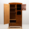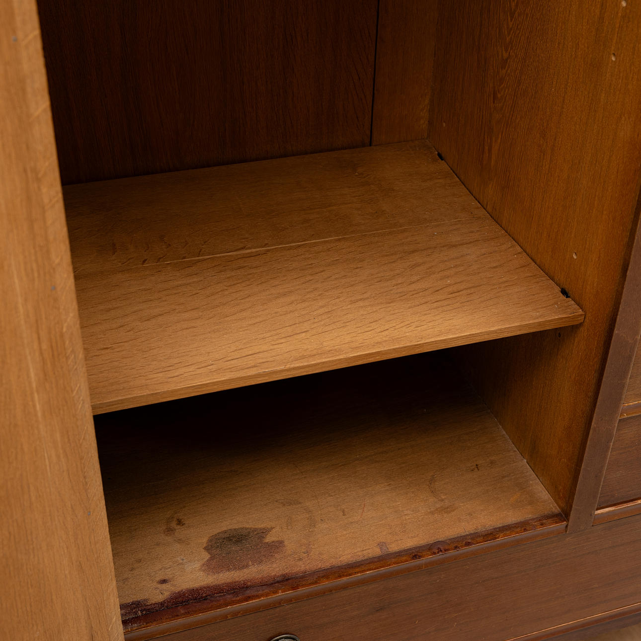 Lukittava ovi peilillä, 3 takahyllyä, lukittava ovi, 1 takahylly, 1 lokero, 6 lukittavaa laatikkoa, yksi suurempi.