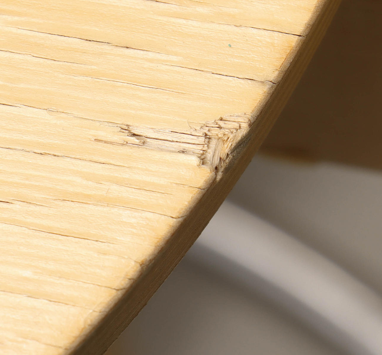 Kuluminen, naarmuuntumisjäljet, maalin menetys ja halkeamien muodostuminen. Pieniä viilunaukkoja.