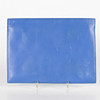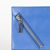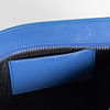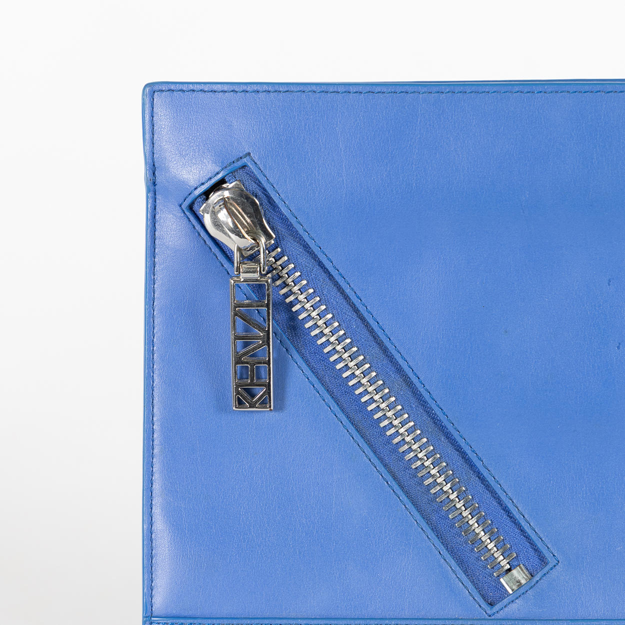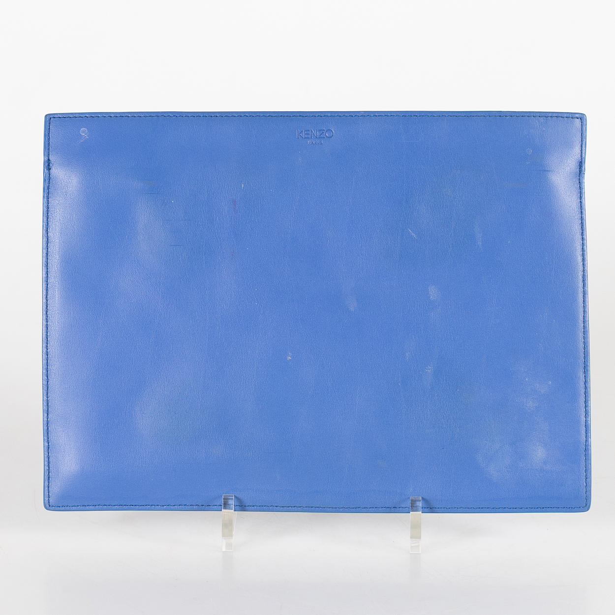Sinistä nahkaa valkoisilla metallilla yksityiskohdilla. Sisällä vuorattu avoin lokero kortteja varten. Kaksi pinta-asennettua lokeroa karkeilla vetoketjuilla. Merkitty KENZO. Noin 30 x 22 cm.