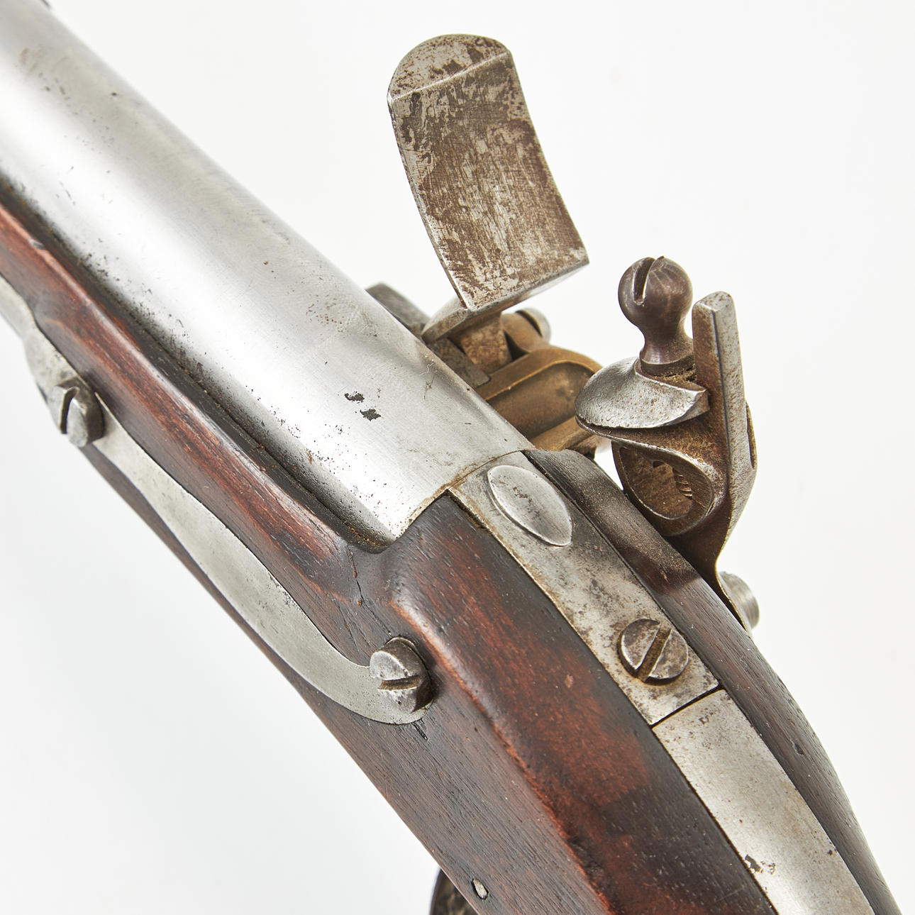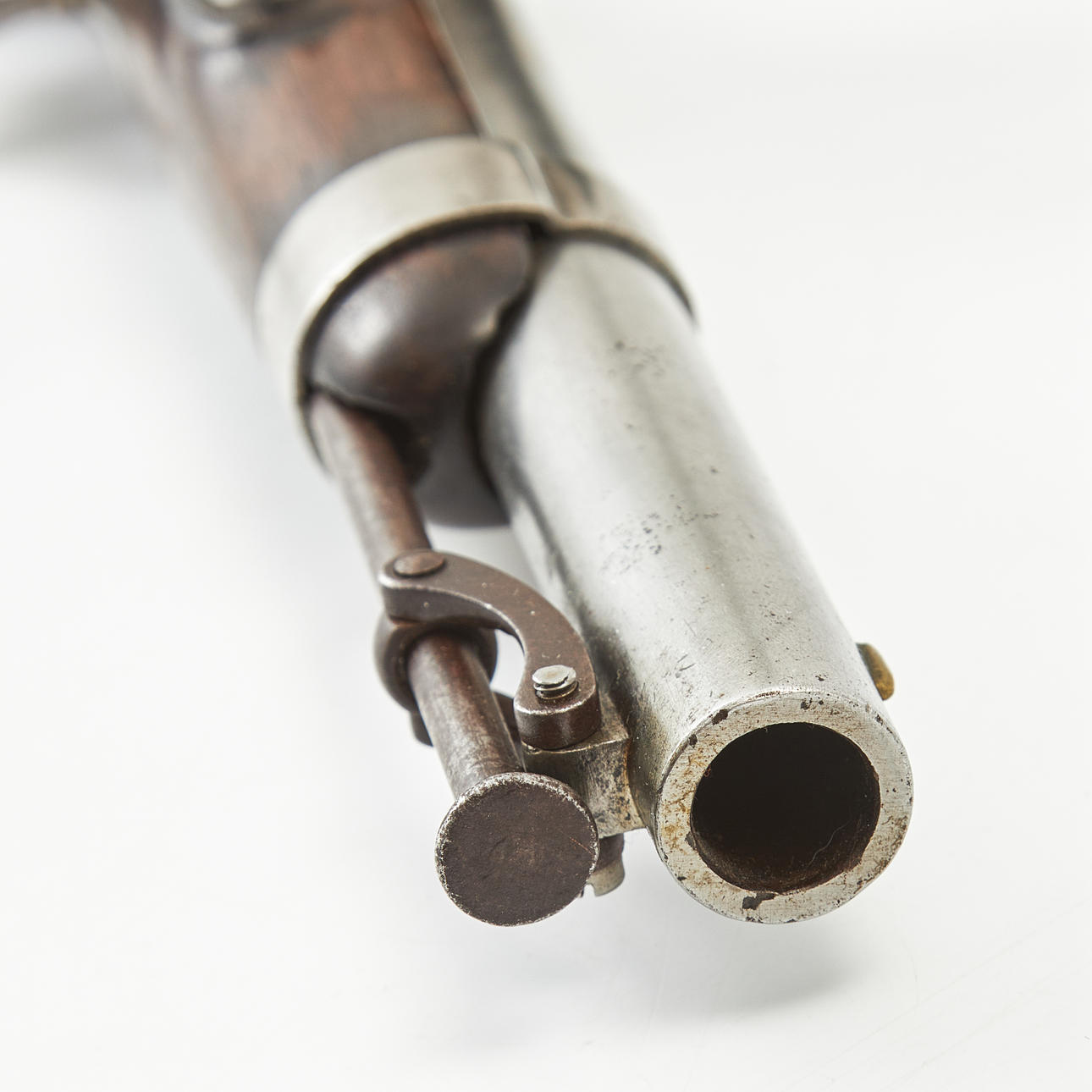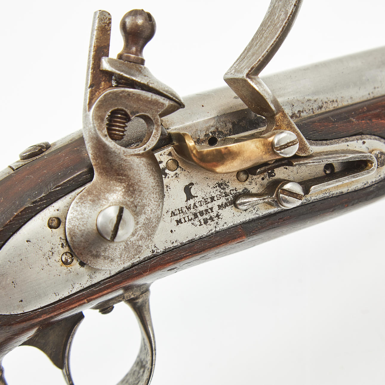 Lukkolevy merkitty A H WATERS MILBURY MAS 1844. Lippuvarsi hankassa, rautakiinnikkeet, tarkastusleima piipussa, pituus n. 35,5 cm.