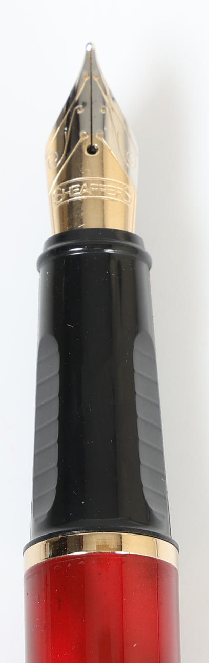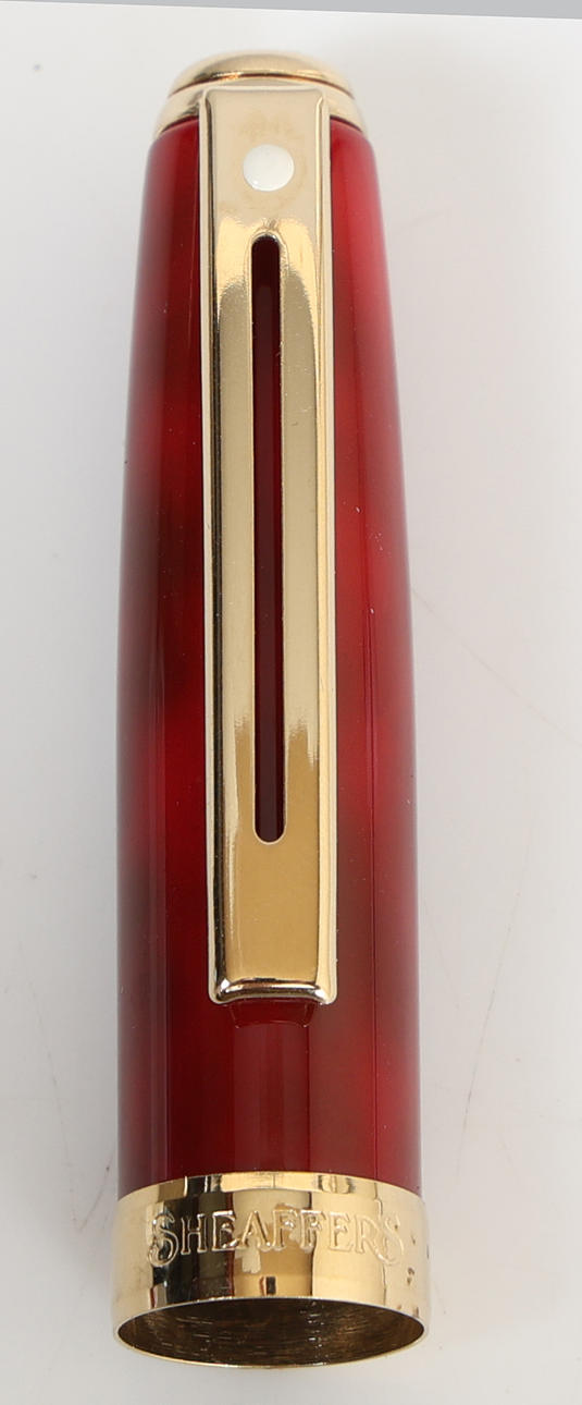 Siinä on kiiltävä viininpunainen marmoroitu lakattu runko, kullattu reunus, taskuklipsi Sheaffer-valkoisella pisteellä, nauha ”Sheaffer”, patruuna/muunnin, jossa on käyttämätön muunnin, musta kärkiosa, jossa on harjattu sivut paremman otteen takaamiseksi, kaksisävyinen kärki vierityskoristeella, painettu ”Sheaffers”, kärki on hieno tai keskikokoinen, 13,2 cm pitkä.