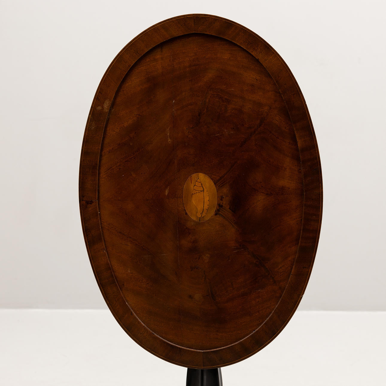Soikea viilulevy, jossa simpukankuorikoriste intarsiassa. 2 taustalla olevaa laatikkoa. Noin 62 x 43, korkeus 72 cm.