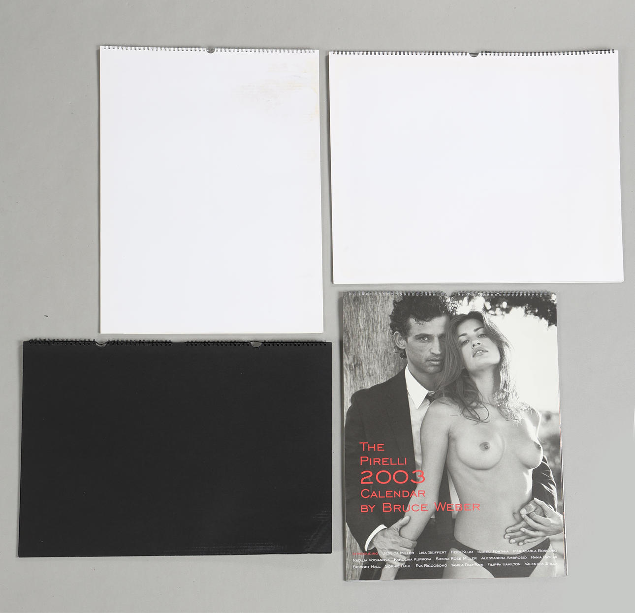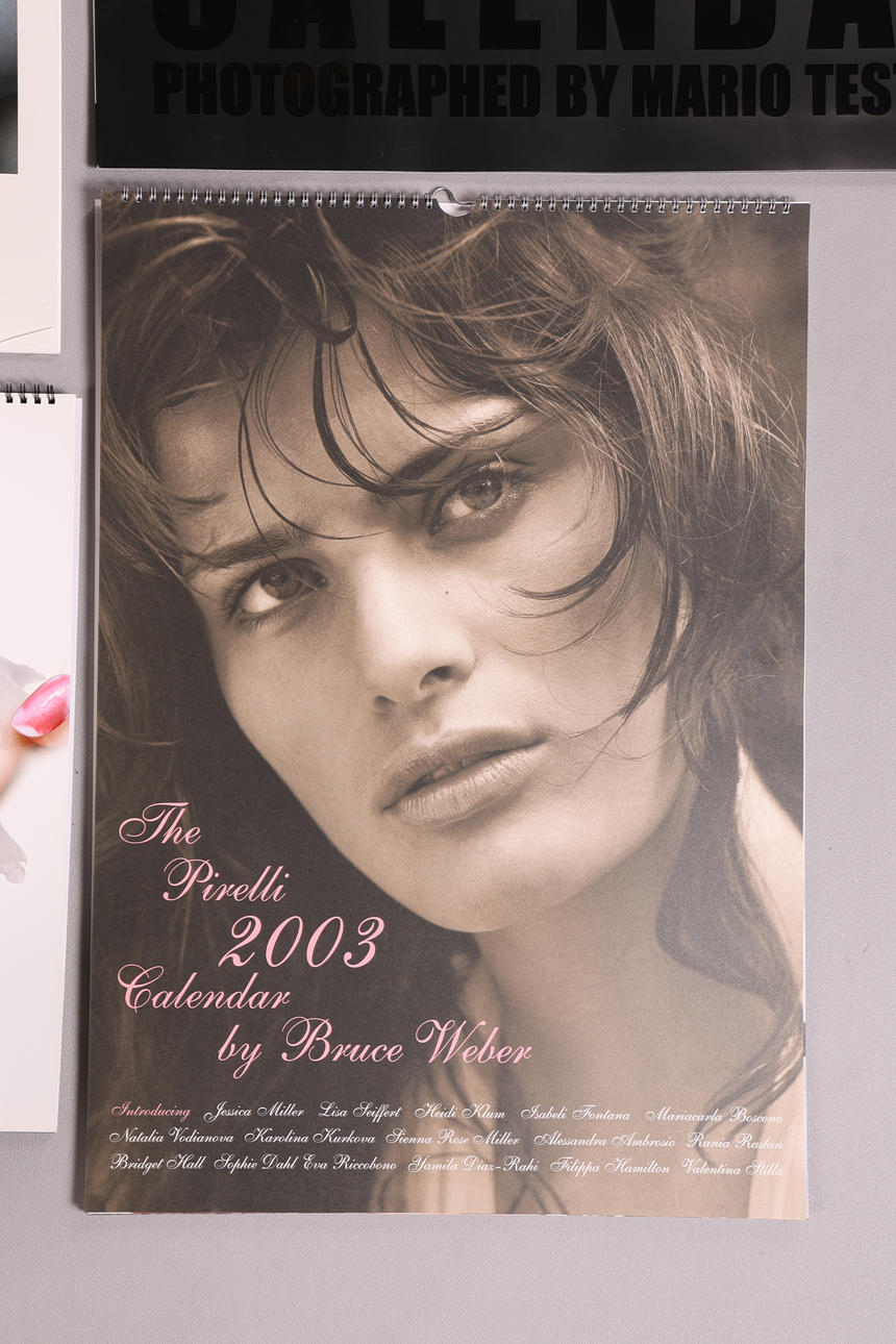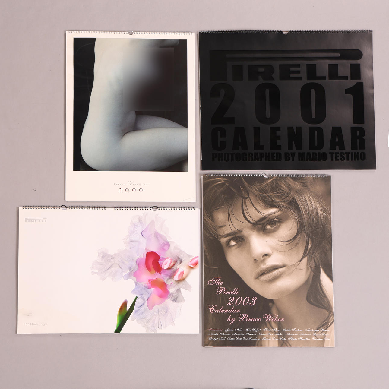 Neljä Pirelli-kalenteria mukaan lukien 2000, 2001, 2003 ja 2004 painokset, suurin laatikko mittaa 65cm x 43cm x 2cm. (4).