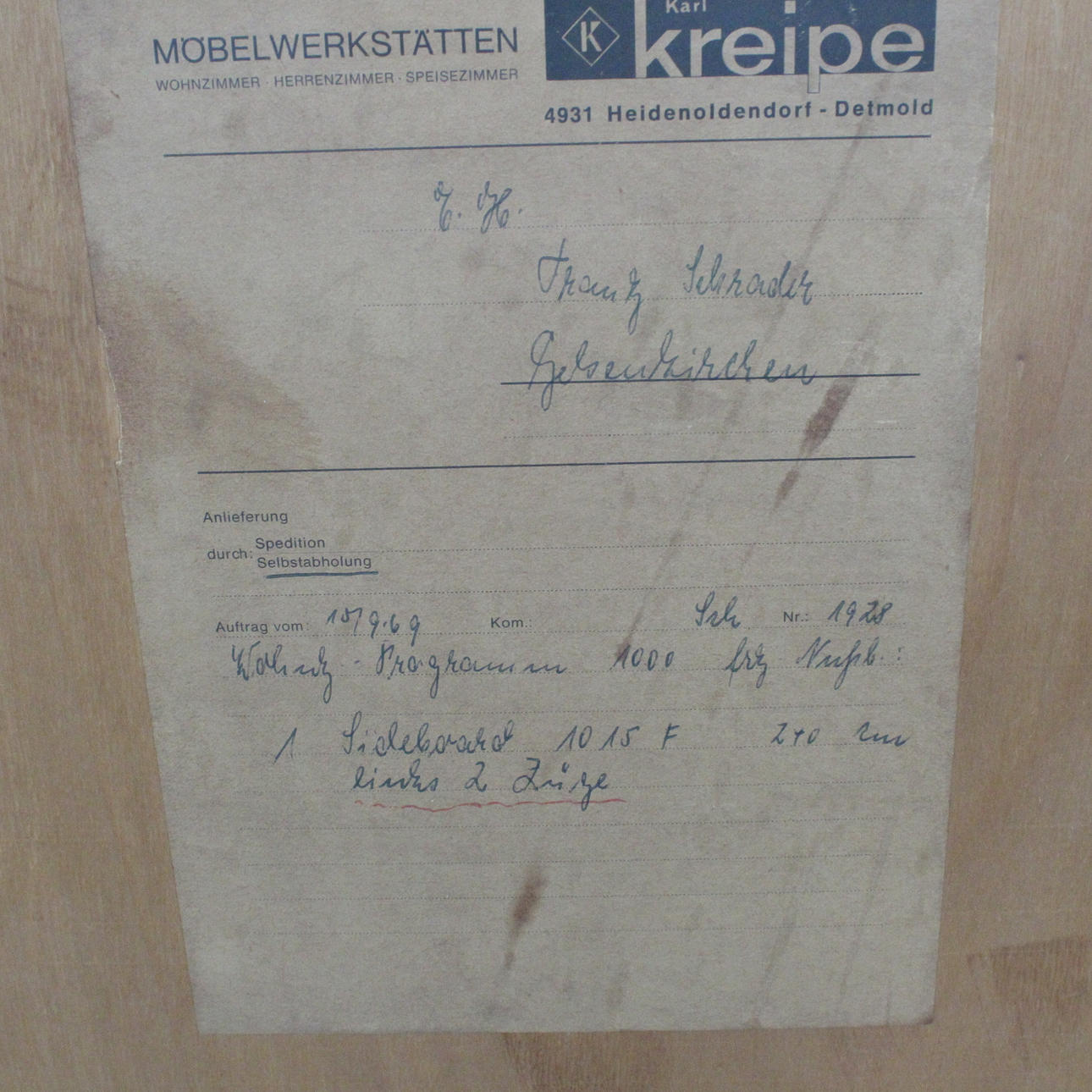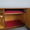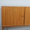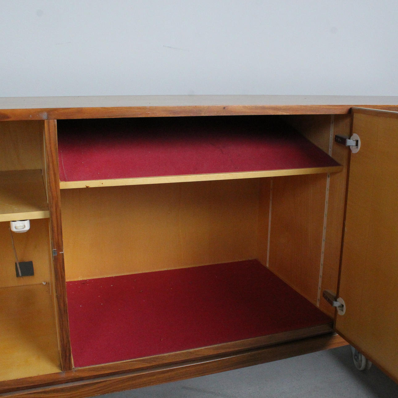 1960-luvun senkki, suorakaiteen muotoinen runko, jossa neljä lukittavaa ovea - jokaisessa ovi vasemmalla ja oikealla, kaksoisovi keskellä, neljä avainta saatavilla, varustettu hyllyillä ja laatikoilla,