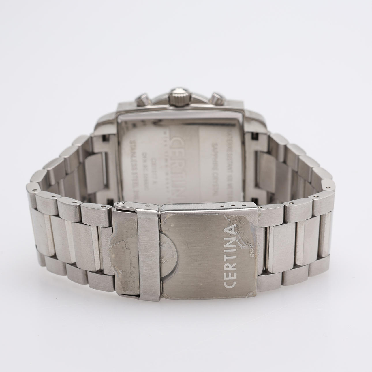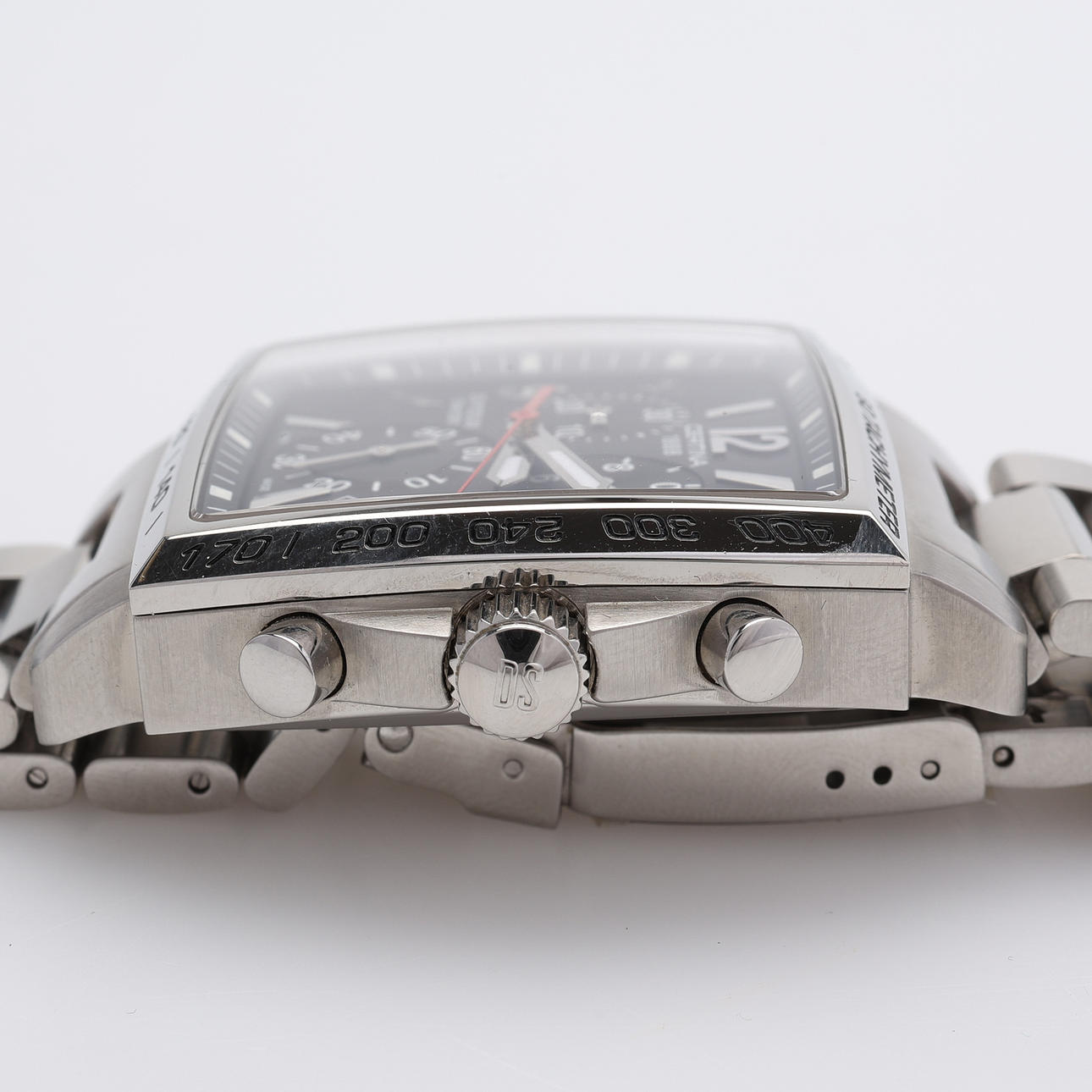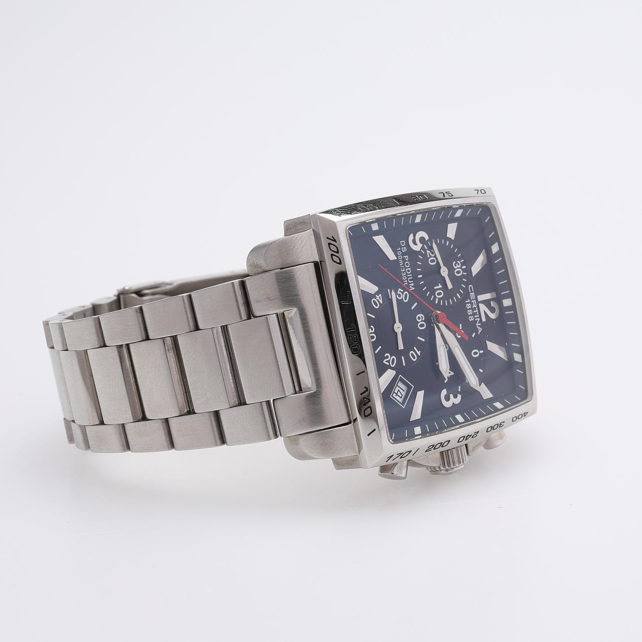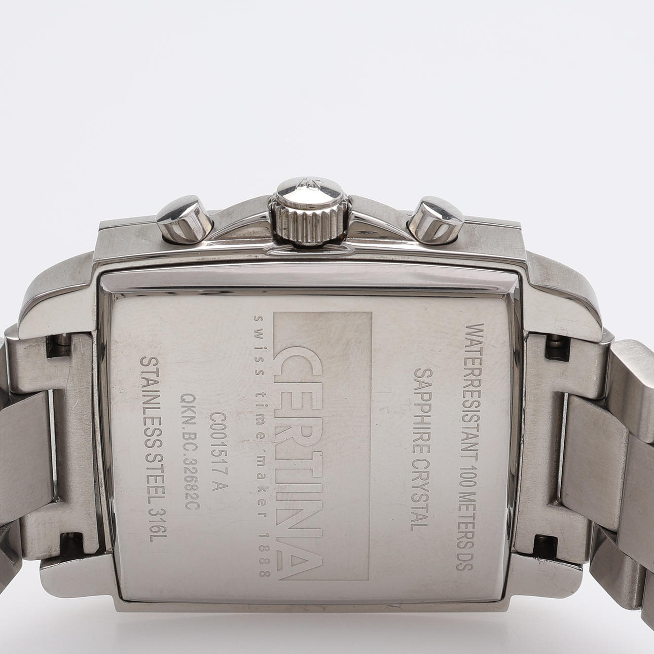 Kotelon kanssa. Kotelon koko 38x38 mm. Tapausnumero C001517A. Viite. QKN.BC.32682C. Safiirikristalli, päivämäärä, kronografi, alkuperäinen rannekoru ja taittolukko.