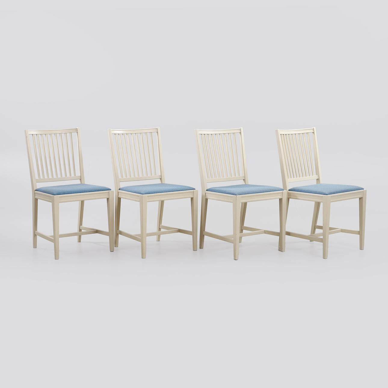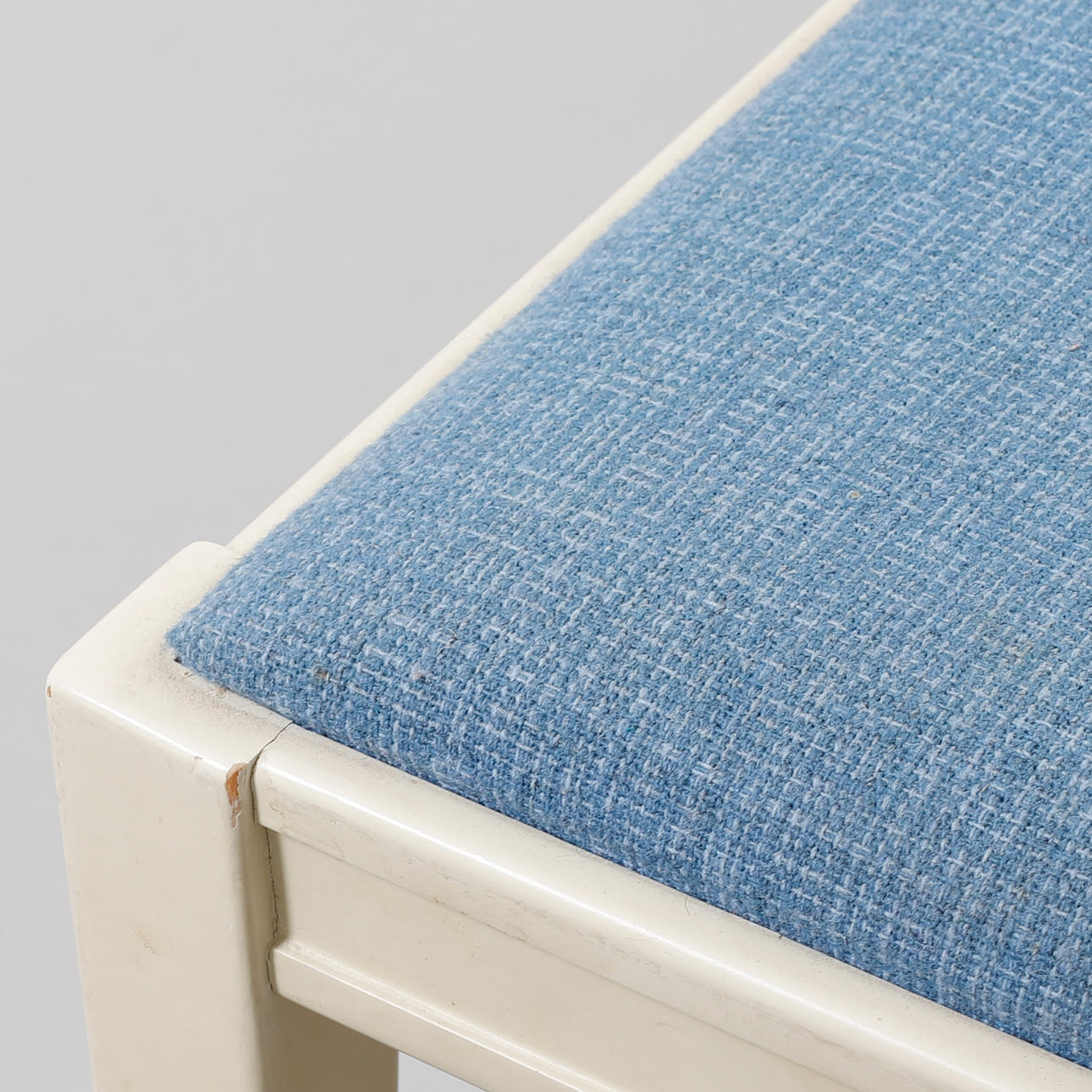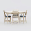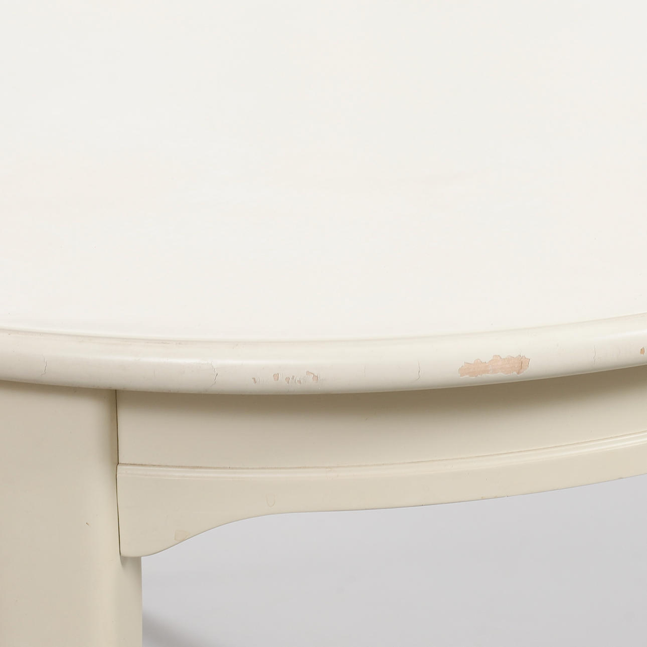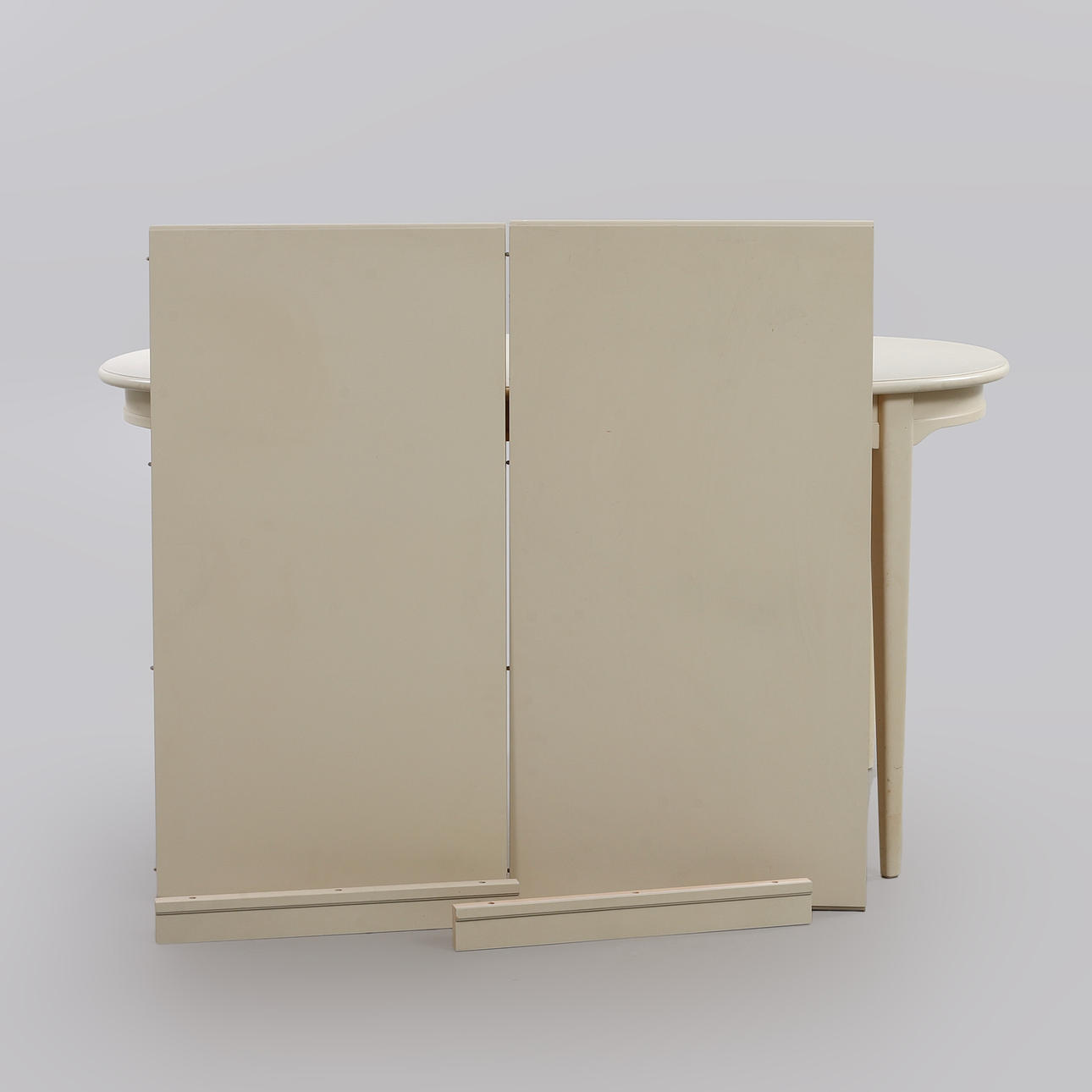 Valkoinen-harmaa lakattu. Neljä tuolia, 2 lastauslautaa ja pöytä. Pituus 130 + 50x2, leveys 80, korkeus 73 cm. Tuolit, istuinkorkeus 44, leveys 48, korkeus 85 cm.