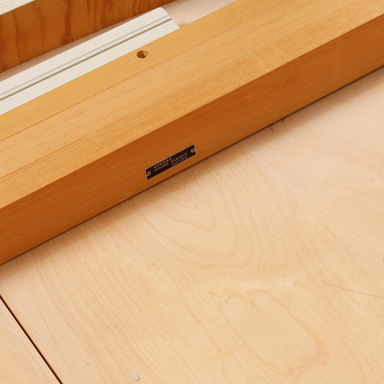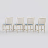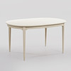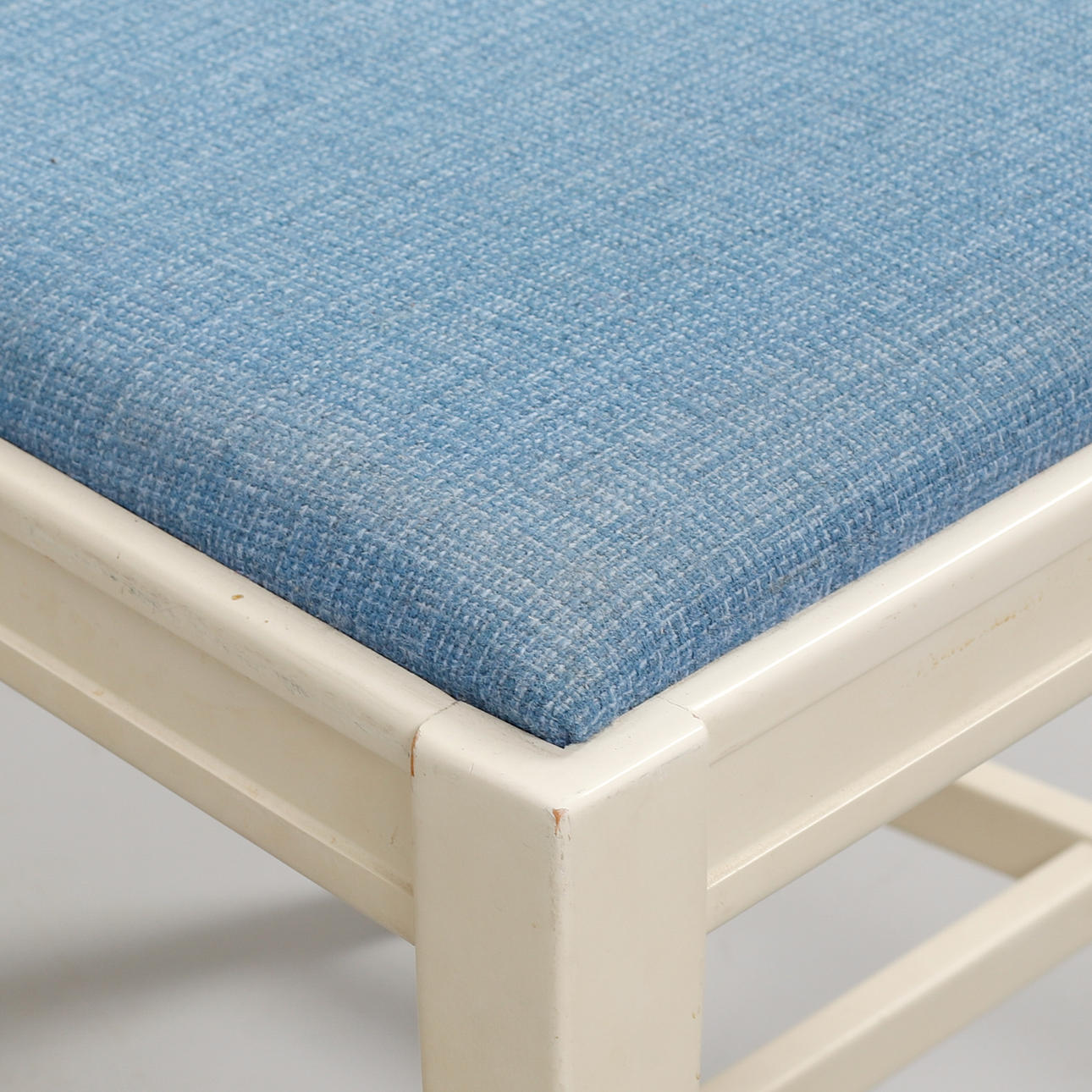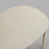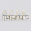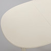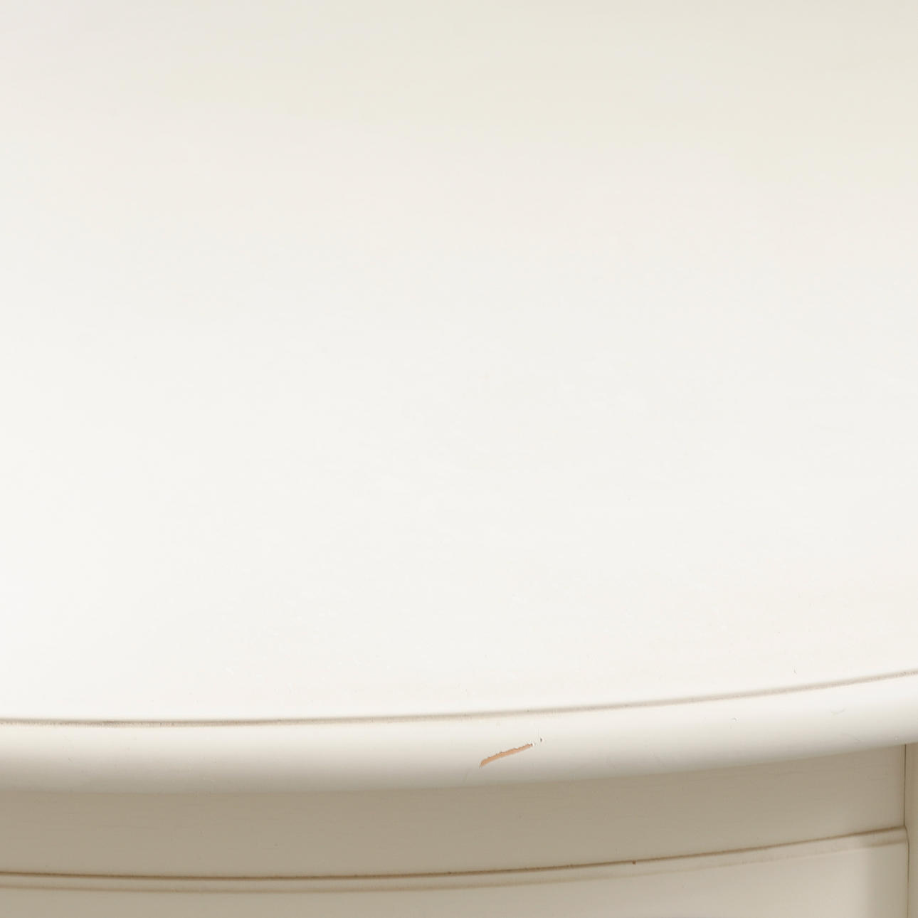 Valkoinen-harmaa lakattu. Neljä tuolia, 2 lastauslautaa ja pöytä. Pituus 130 + 50x2, leveys 80, korkeus 73 cm. Tuolit, istuinkorkeus 44, leveys 48, korkeus 85 cm.