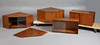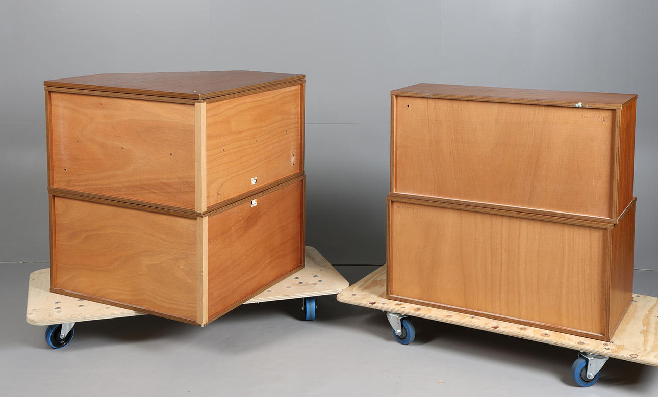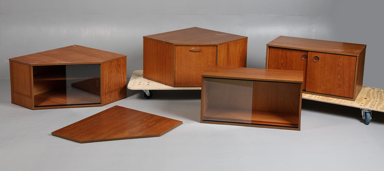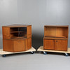 Avalonin tiikki- ja lasitettu kaksirepäinen kulmavitriini yhdessä lasitetun kirjahyllyn kanssa kaapissa, kulmayksikön korkeus on 84 cm pinottuna ja 71 cm x 71 cm, kaapin kirjahyllyn korkeus 81,5 cm, leveys 81,5 cm, syvyys 43 cm pinottuna. (4).