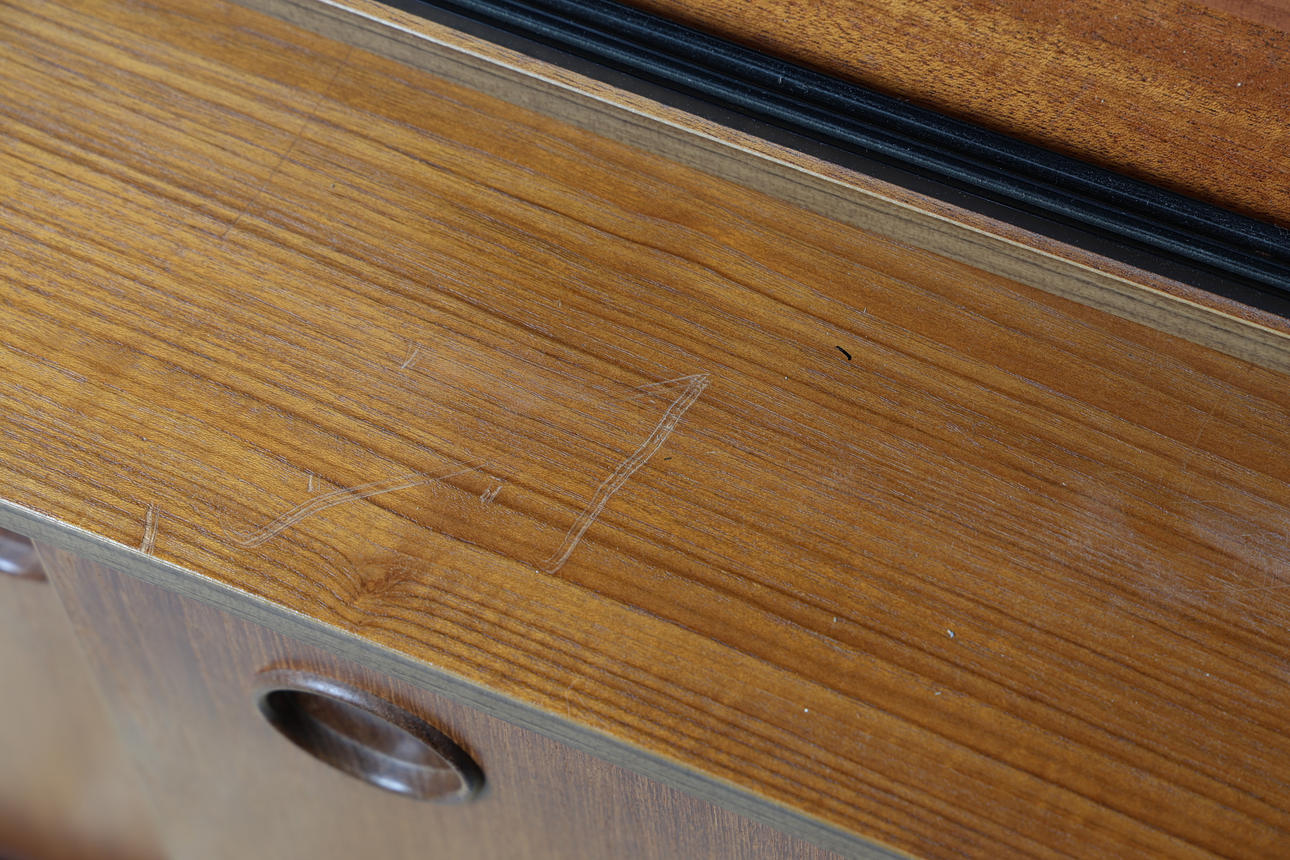 Jäljet ja kuluminen ovat suhteessa ikään, suorakulmainen merkki yläkulmayksikön vasemmalla puolella ja löysä ylälauta kulman yläkulmayksikköön, yksi hyllykiinnitys on napsahtanut lasitettuun kirjahyllyosaan, kaksi lasitettua kappaletta on merkitty Avalon, toinen ei ole.