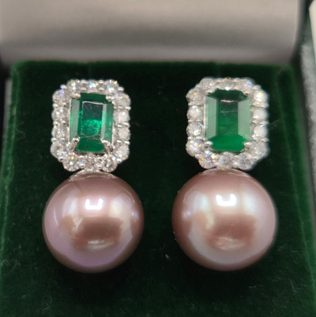 Hieno riipus, jossa timantit, rikas, tummanvihreä soikea smaragdi ja ripustettu helmi.