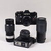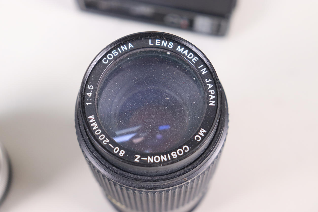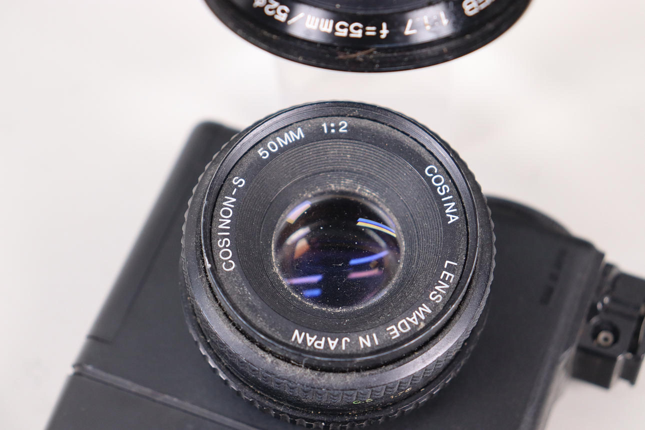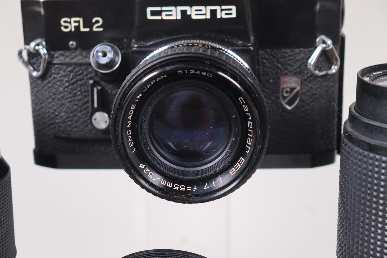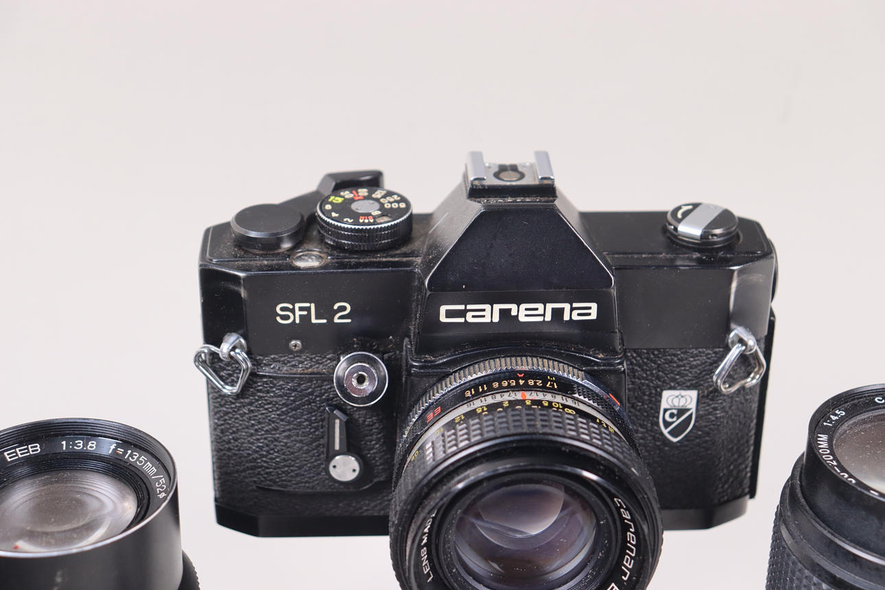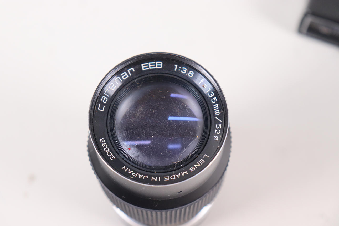 Kamera, jossa on objektiivi ja 3 lisäobjektiivia ja salama.