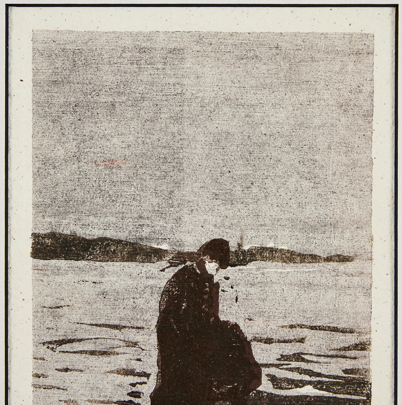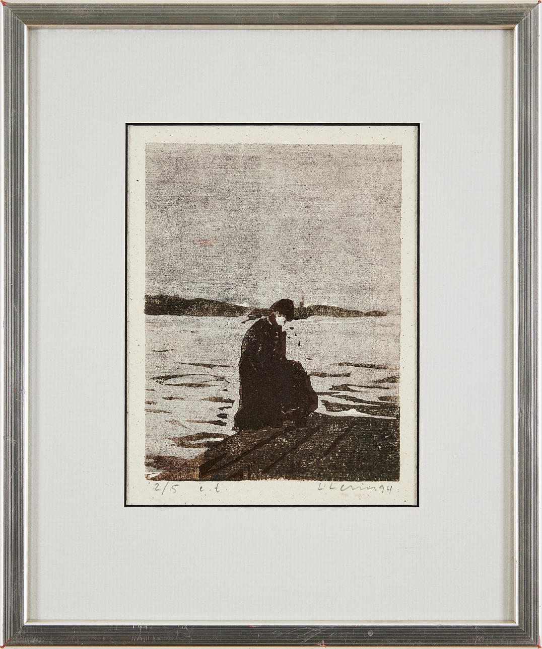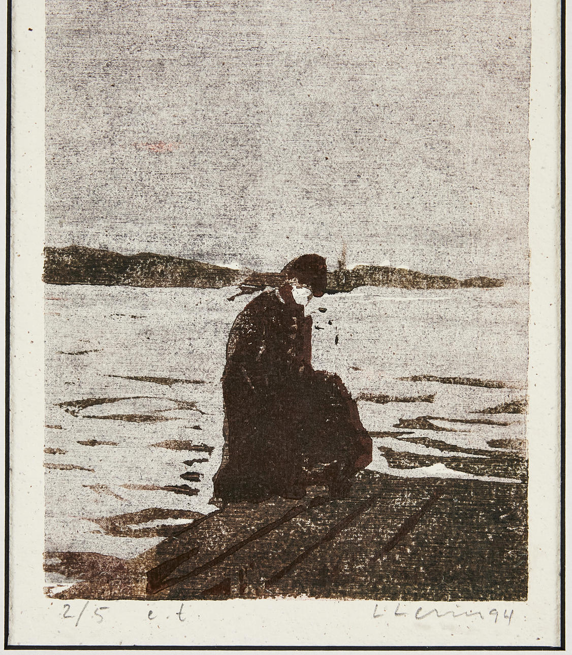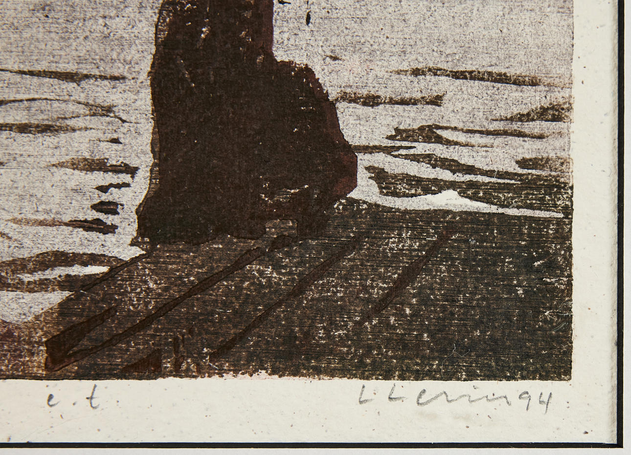 Puupiirros, kuvan mitat n. 19 x 14 cm, mukaan lukien kehys 32 x 27 cm. Oma printti numeroitu 2/5, signeerattu ja päivätty L Lerin 94.
