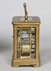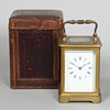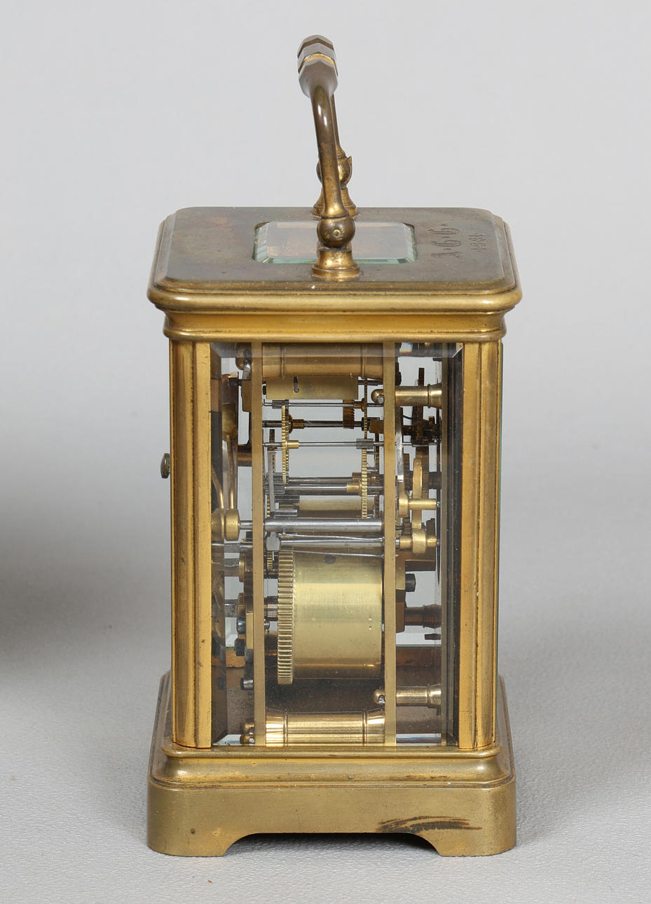 Parafoitu A.G.G. ja päivätty 1881, valkoinen kellotaulu mustilla roomalaisilla numeroilla, näkyvä pakopaikka, 12 cm korkea ilman kahvaa, ulompi nahkainen matkakotelo, korkeus 16 cm.