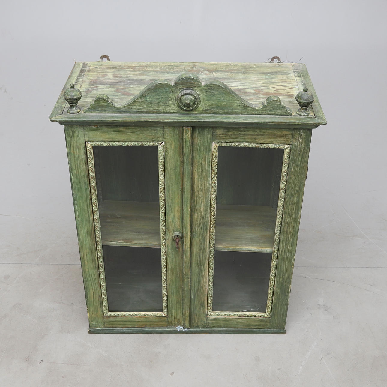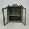 Maalattu. Lasitettu ovipari takana, irrotettava hylly. Pituus n. 64, leveys 34, korkeus 86 cm.