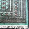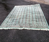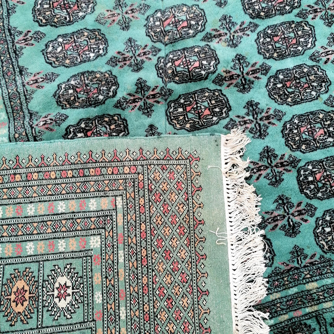 Suuri turkoosi maadoitettu matto mustilla yksityiskohdilla 290cm x 375cm.