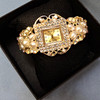 Mitat: kellon kotelo, n. 3,5 x 3 cm, kellon sisämitat, n. 1,5 x 1,2 cm, halkaisija, n. 5,5 x 4,8 cm, taitettava.