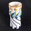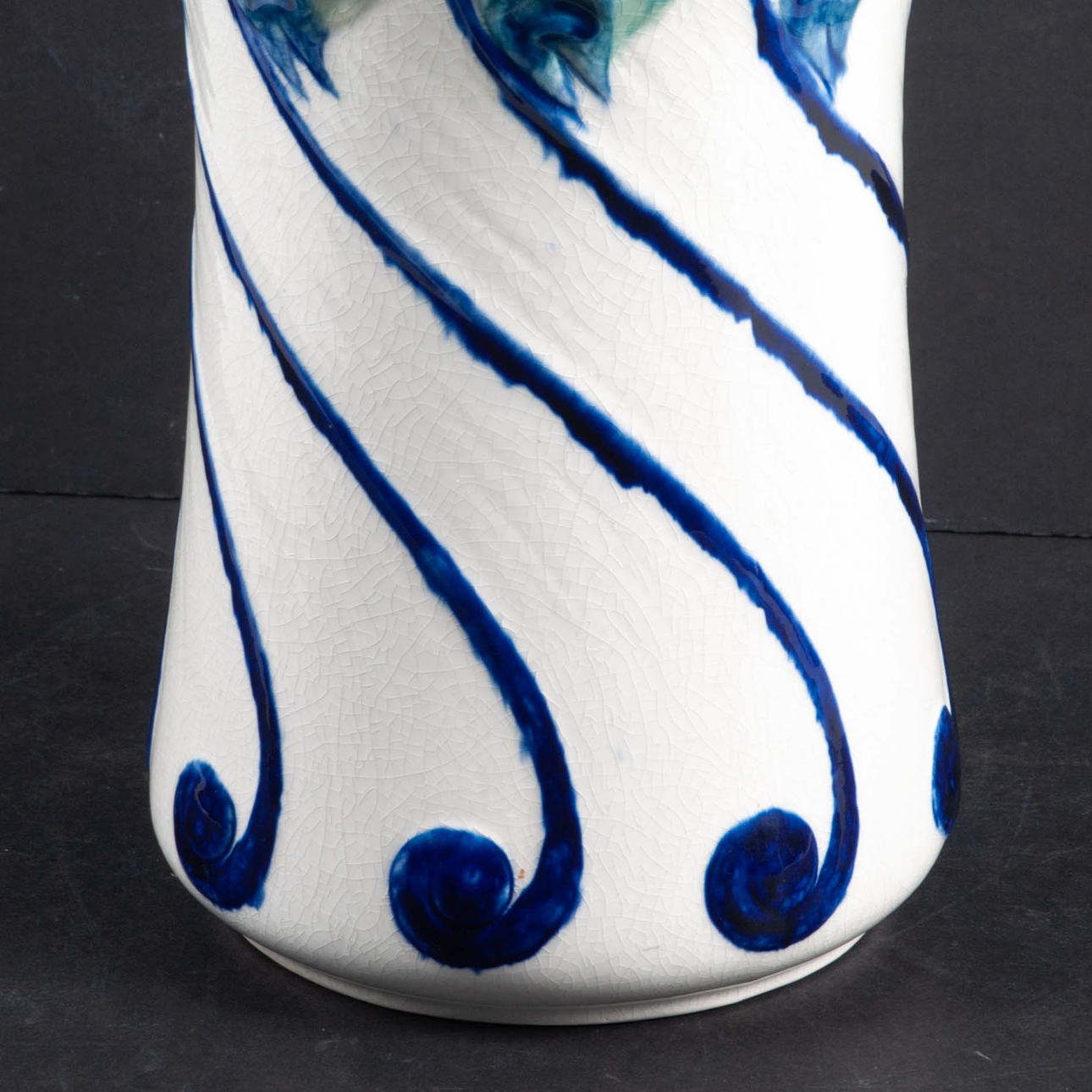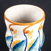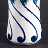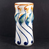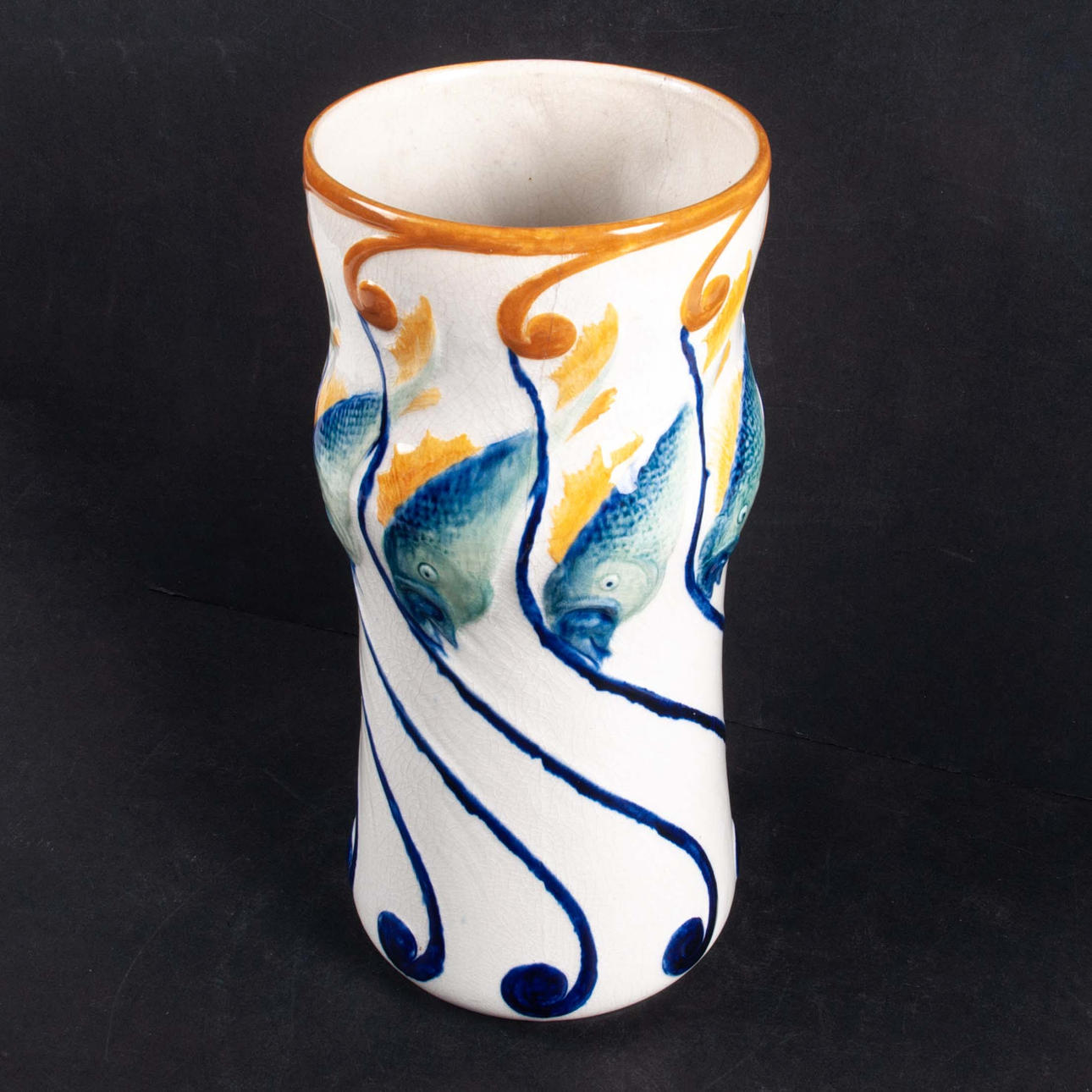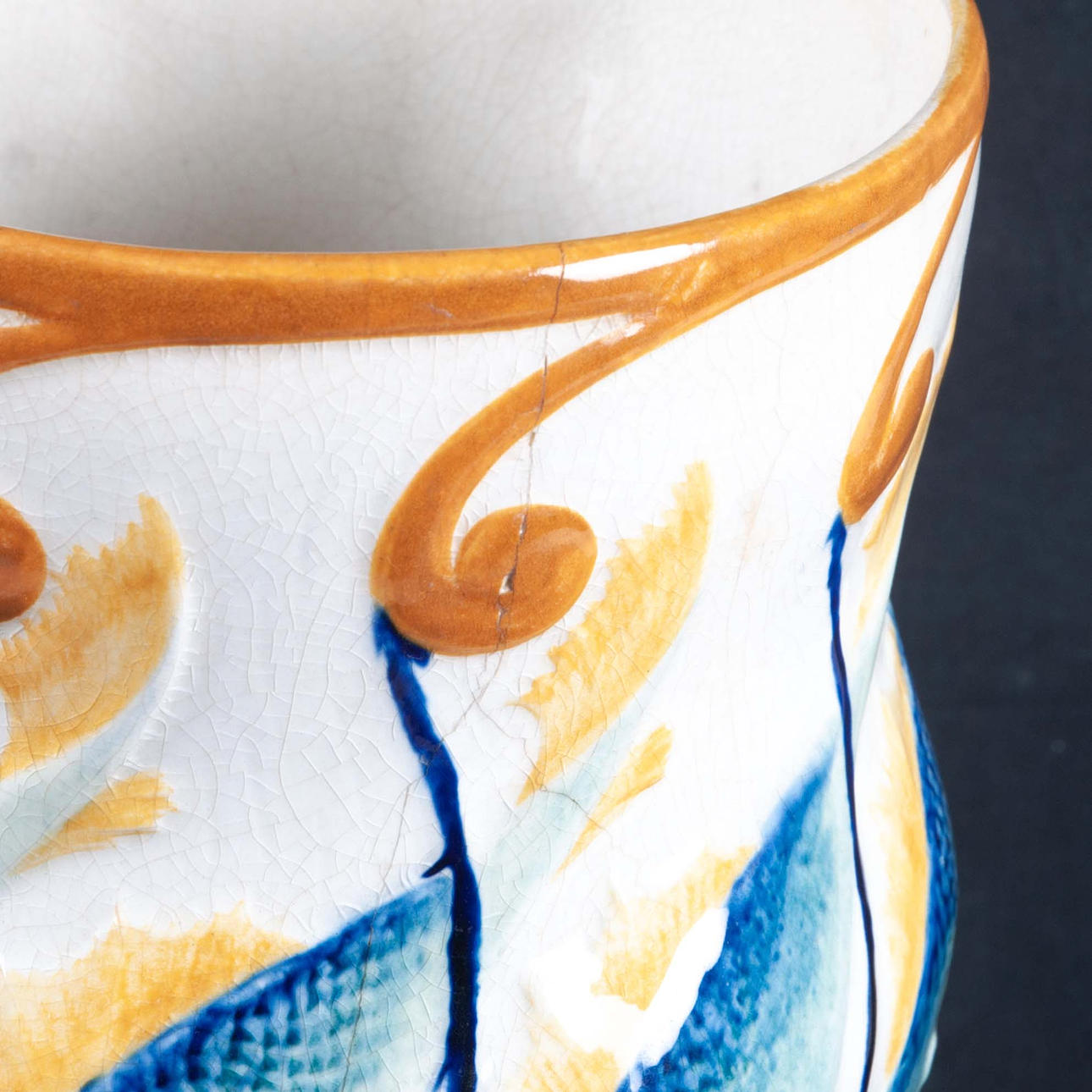 Maljakko lasitetulla kivitavaralla koristeltu reliefillä sinisen kalan muodossa ja tyyliteltyjen kasvimuotojen muodossa sinisenä, vihreänä, keltaisena ja oranssina halkeiltua valkoista pohjaa vasten. Alla on merkitty ”Dessin Alf Wallander” ja Rörstrandin sinisellä leimasimalla.