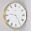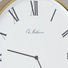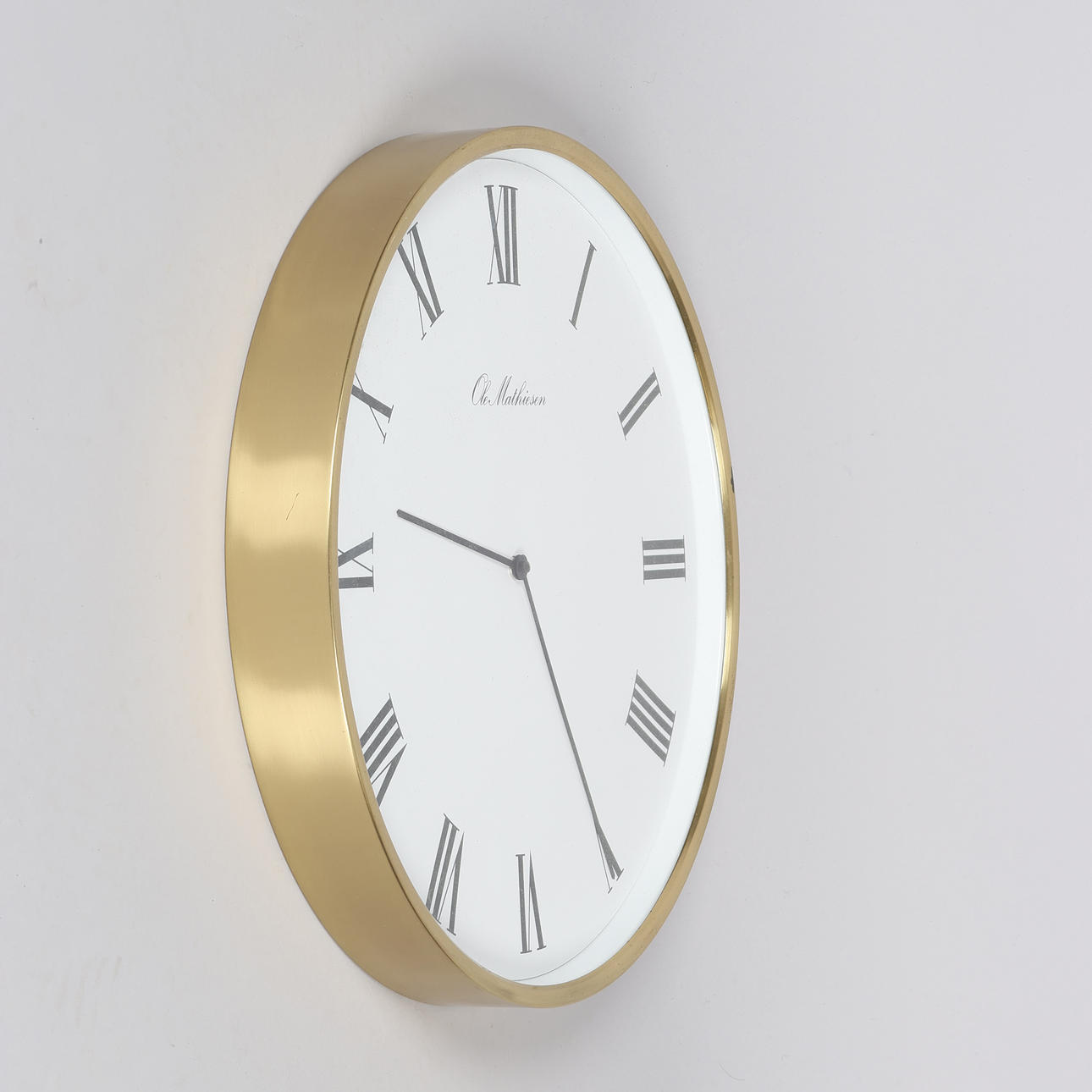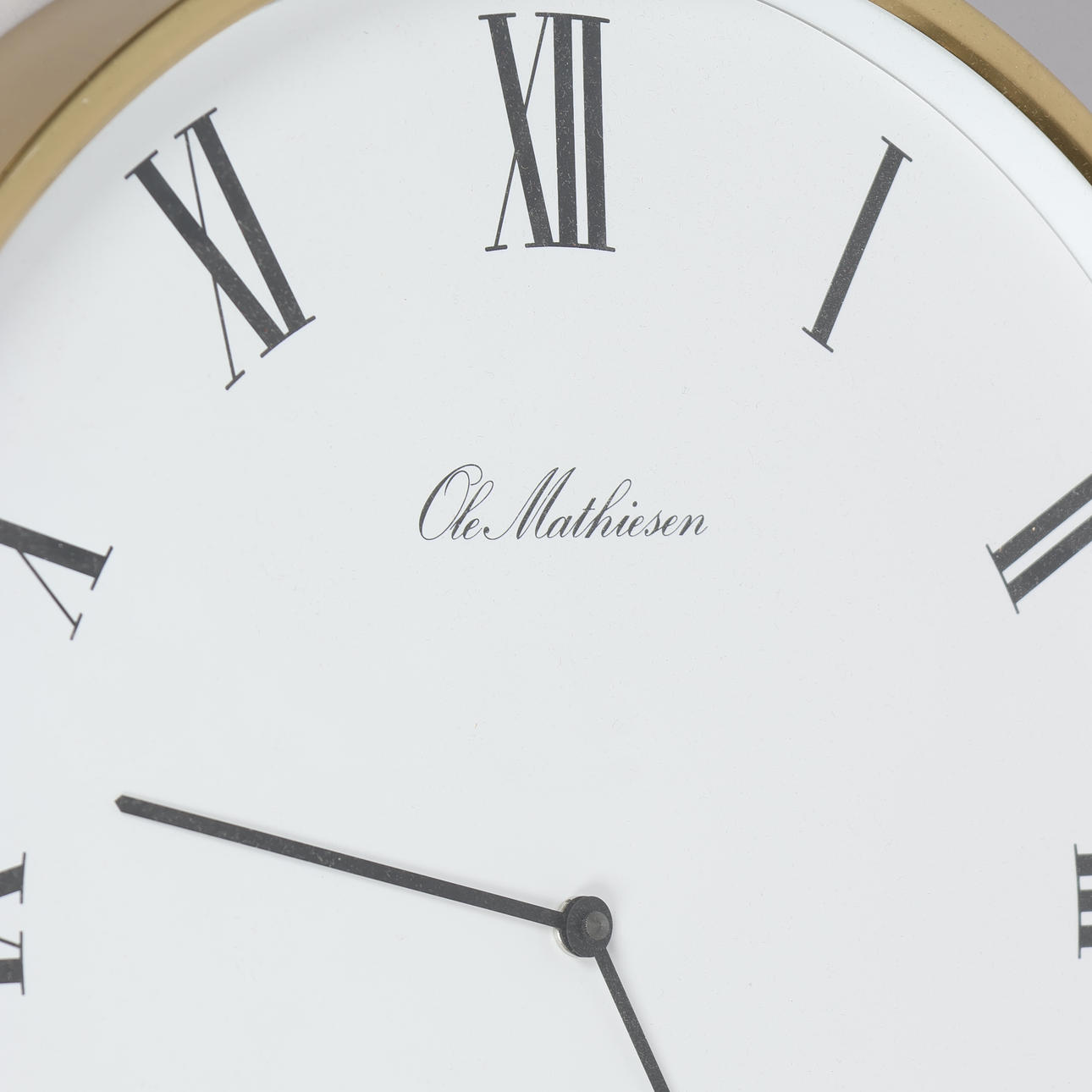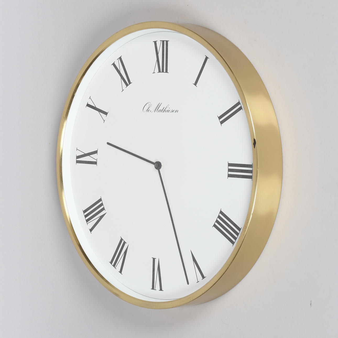 Ole Mathiesen seinäkello messinkistä metallikoteloa, valkoinen kellotaulu mustilla roomalaisilla numeroilla ja Ole Mathiesen -logo. Varustettu akkukäyttöisellä Junghans Quartz -liikkeellä. Halkaisija 44,5 cm.