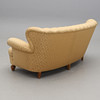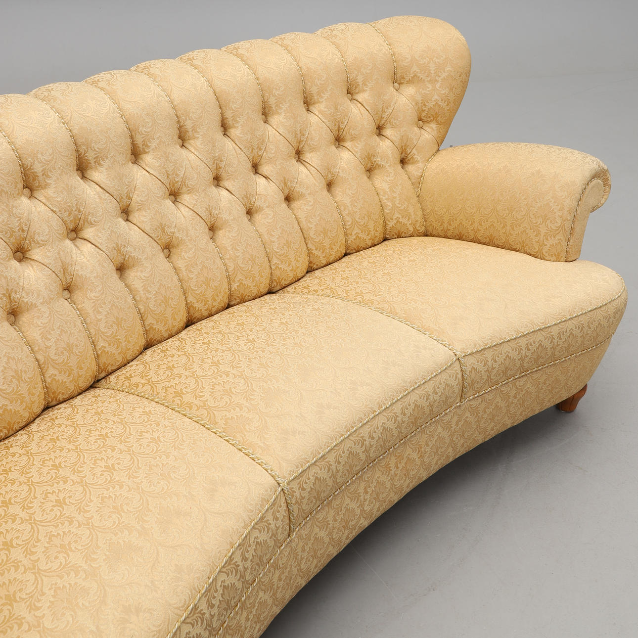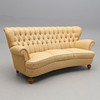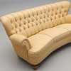 Kaareva muoto. Tekstiiliverhoilu koristenauhalla. Napilla nidottu selkä. Joustava istuin. Jalat luuttomasta koivusta. Pituus 185, syvyys n. 85, selkäkorkeus 85, istuinkorkeus 40 cm.
