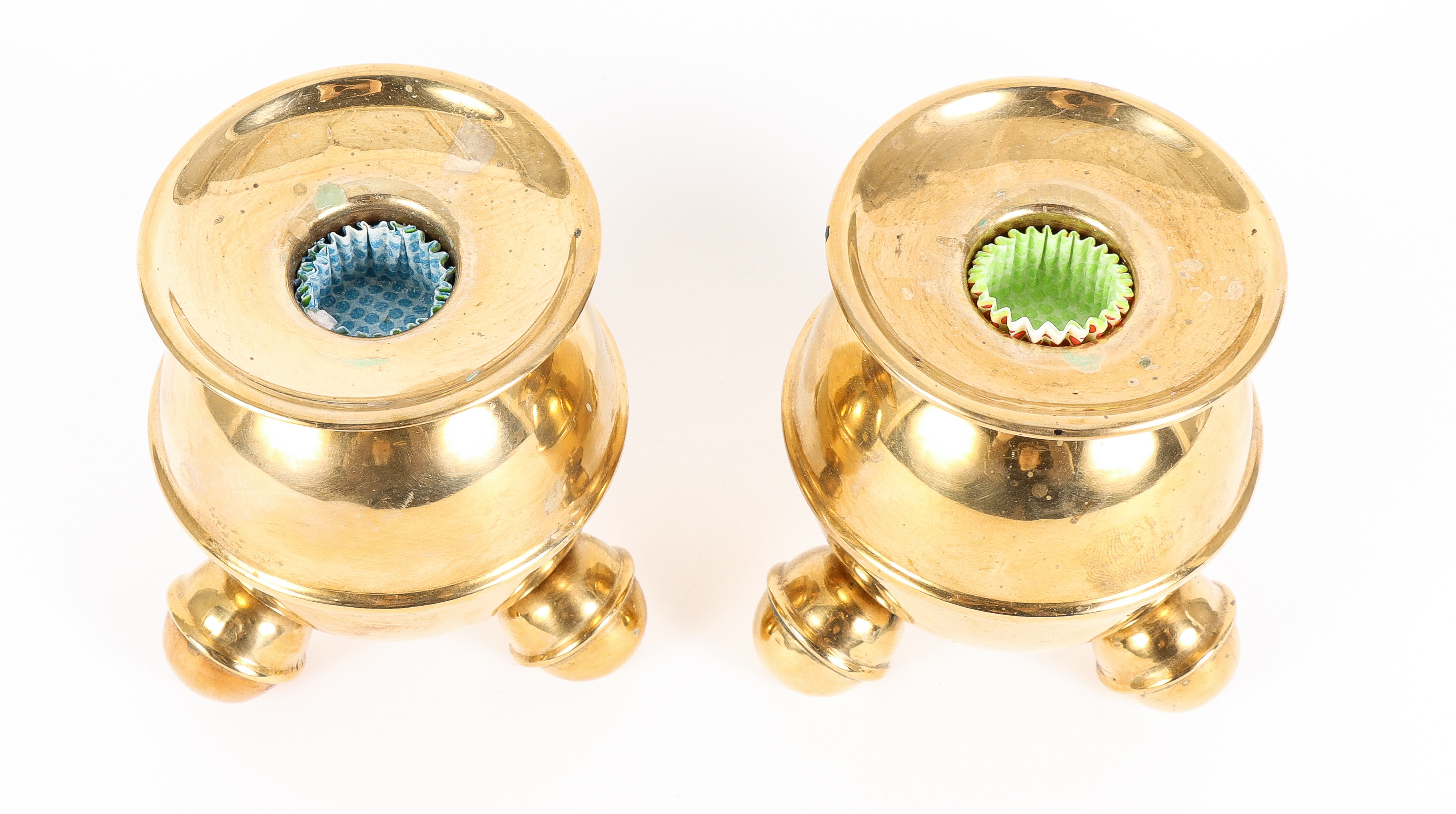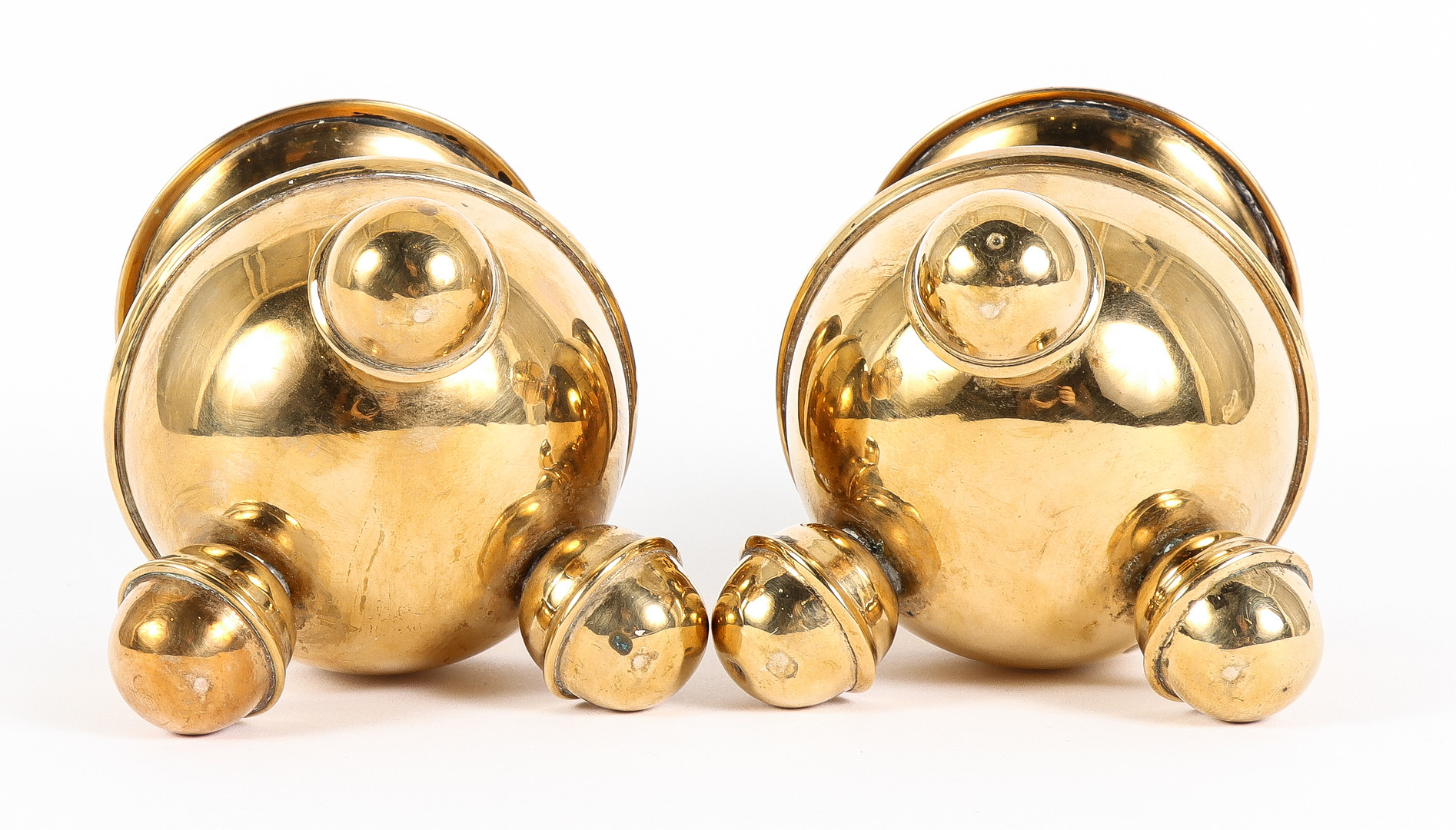 4339787. Kynttilänjalkapari, pallomalli, messinkiä.
