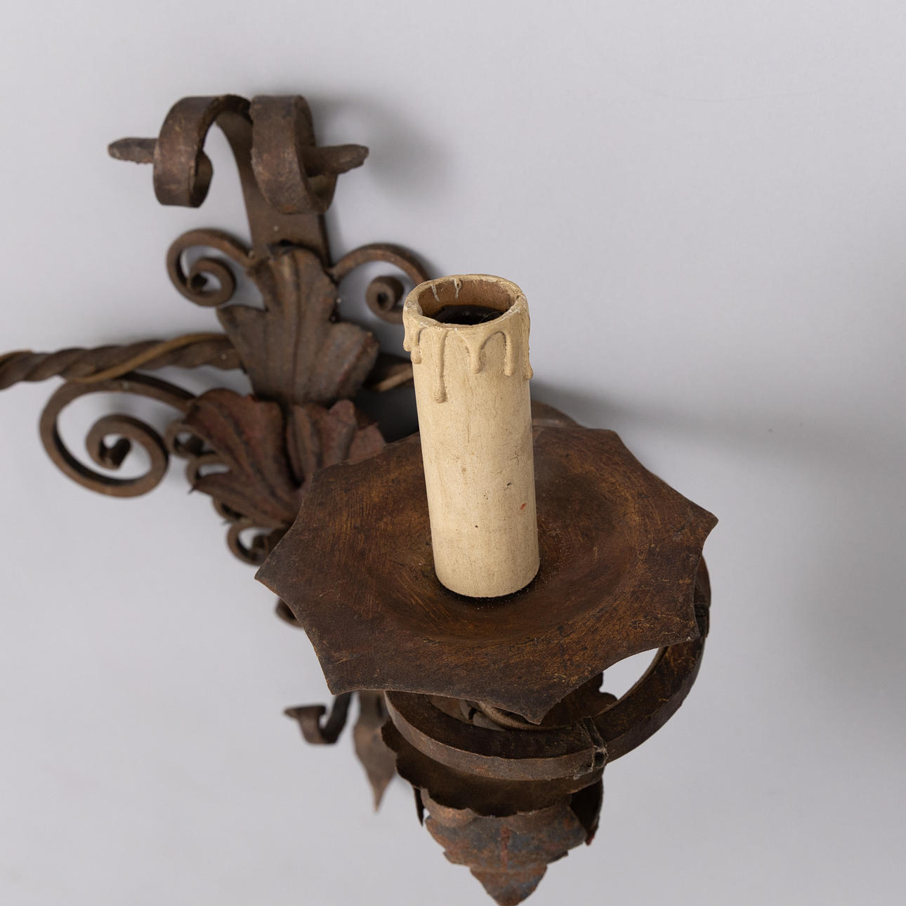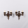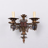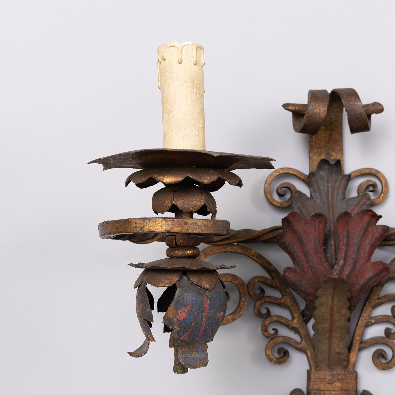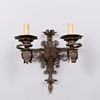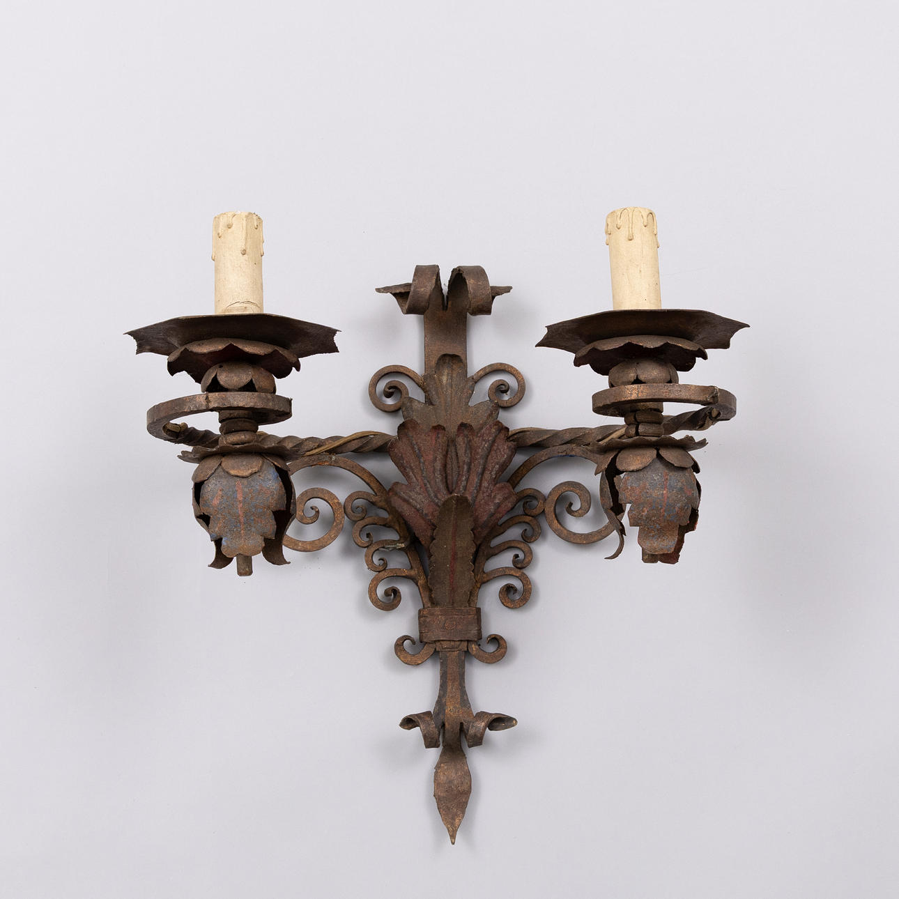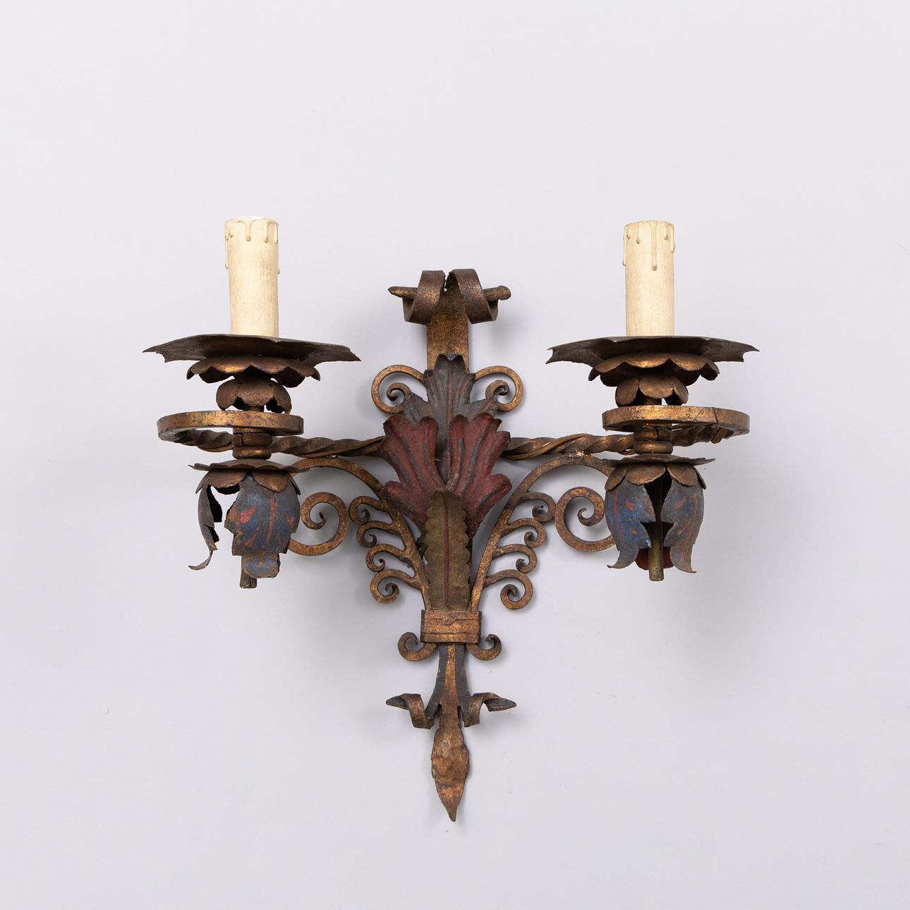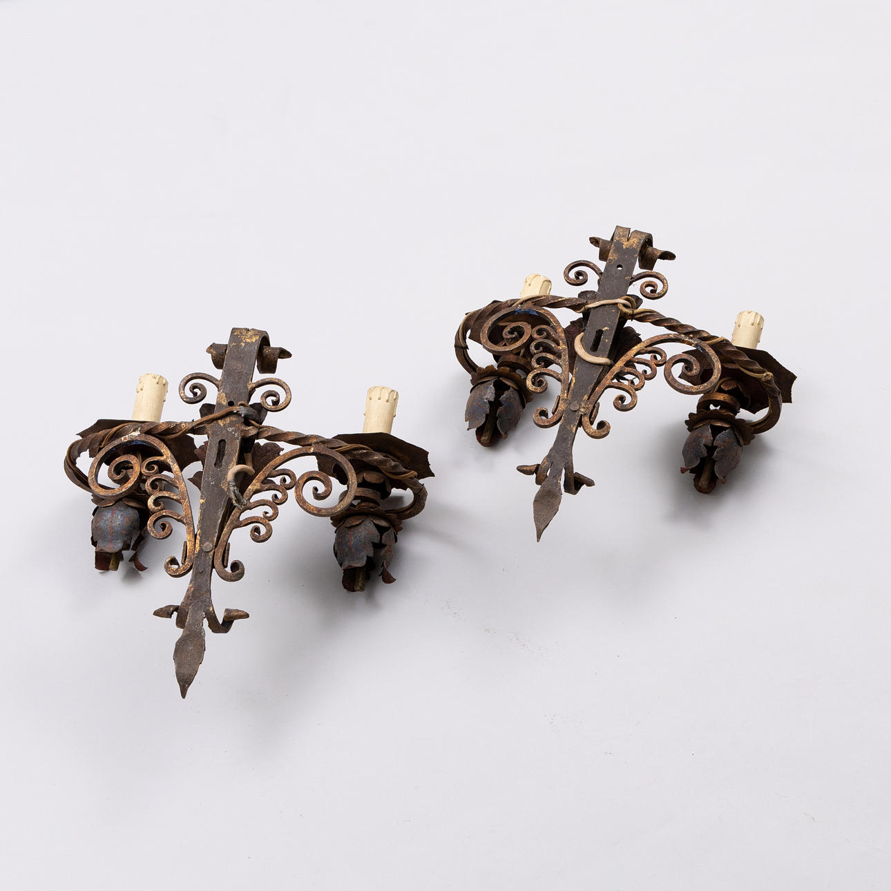 SEINÄLAMPUT, pari maalattua ja antiikkipatinoitua metallia. Kaksi sähkövalopistettä kumpikin. Mitat: korkeus 45 cm, leveys 43 cm.