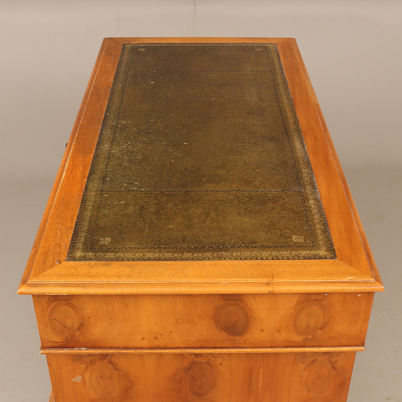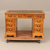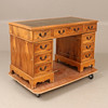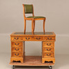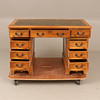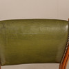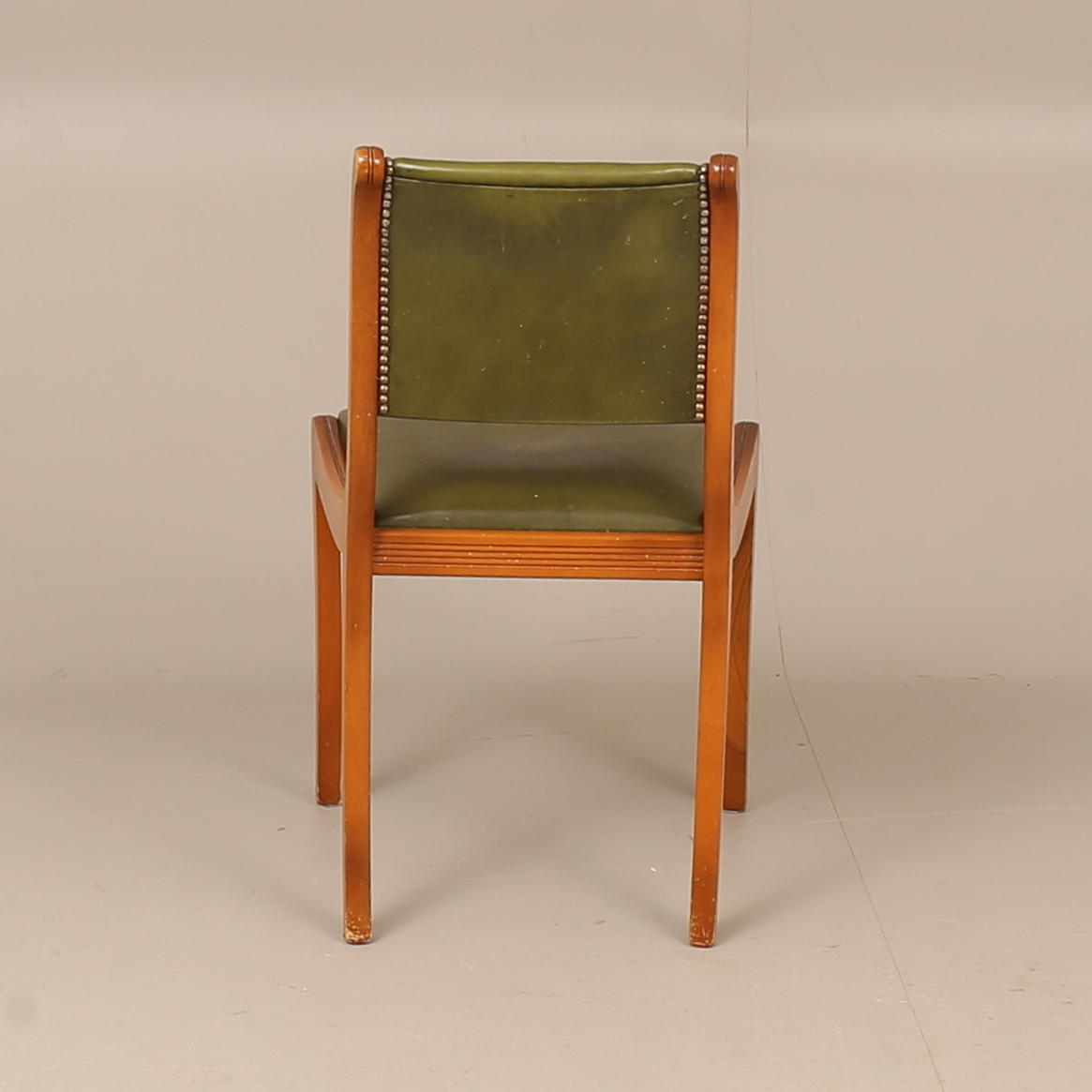 Pöydän korkeus n. 77 cm, n. 122 x 61 cm. Tuoli, nahka, korkeus n. 82 cm, istuinkorkeus n. 48 cm.