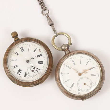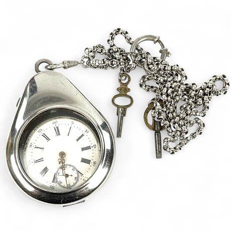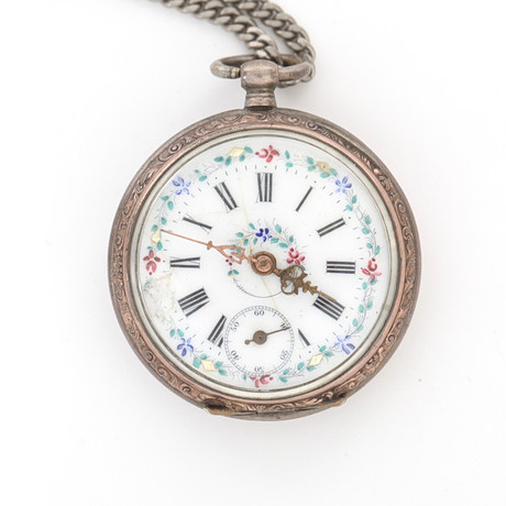 1 kpl naisten taskukello hopeaa, avaimenperä. Takana siselloitu sisustus. Emaloitu kellotaulu roomalaisilla numeroilla. Ketju avaimella ja viehätyksellä.