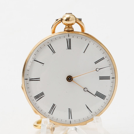 1 hopeinen taskukello, ankkurikäytävä, metallinen taskukellokotelo. Takana siselloitu sisustus. Emaloitu valitsin. Löysä lasi, valitsimen vaurioituminen.