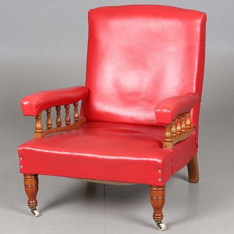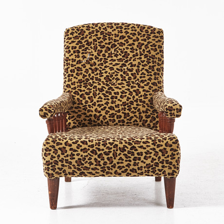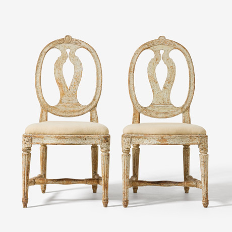 4344706. NOJATUOLI. Kustavilainen tukholmalainen 1700-luvun teos, leikattu sisustus ja pastellointi, tiukasti verhoiltu, selkä kaiteella, ylikaulus kapenevat kannelloidut jalat, merkitty Tukholman tuolintekijän sinetillä.
