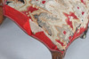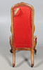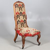 Pähkinäkehystetty tuoli, jossa veistetty koriste ja muotoillut jalat, brodeerattu selkä ja istuin. 103 cm korkea.
