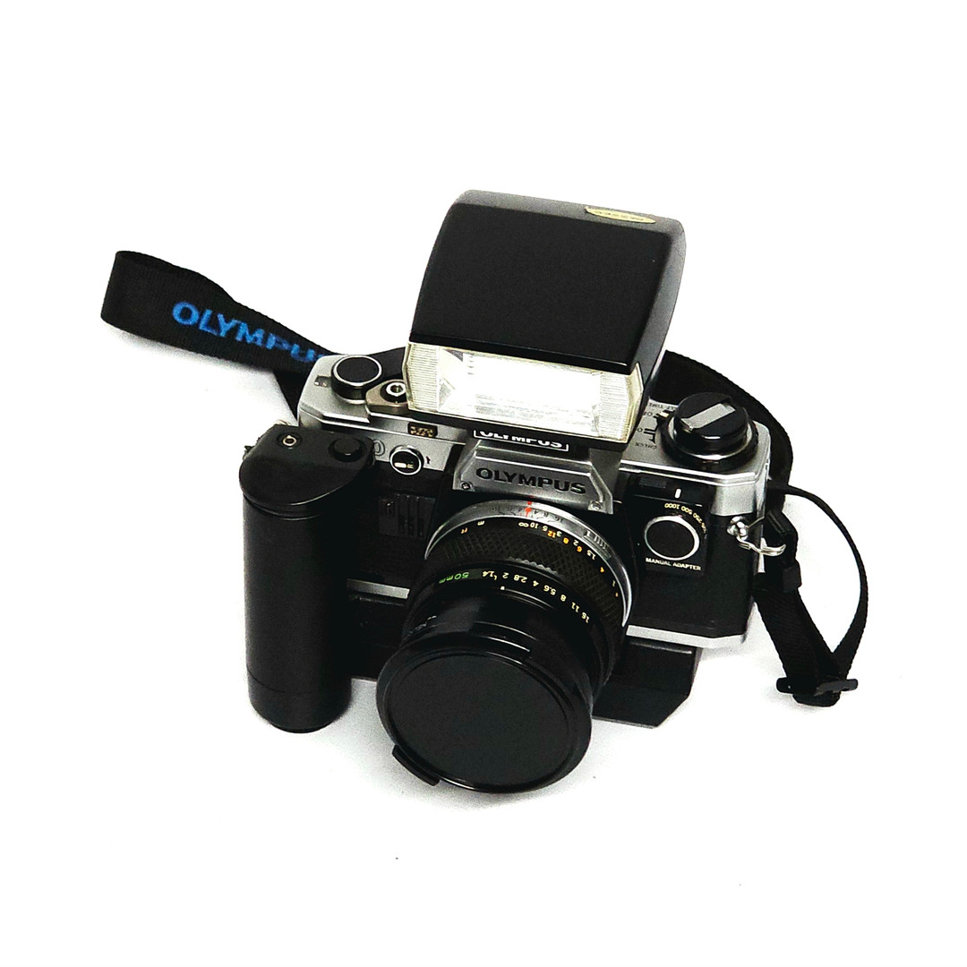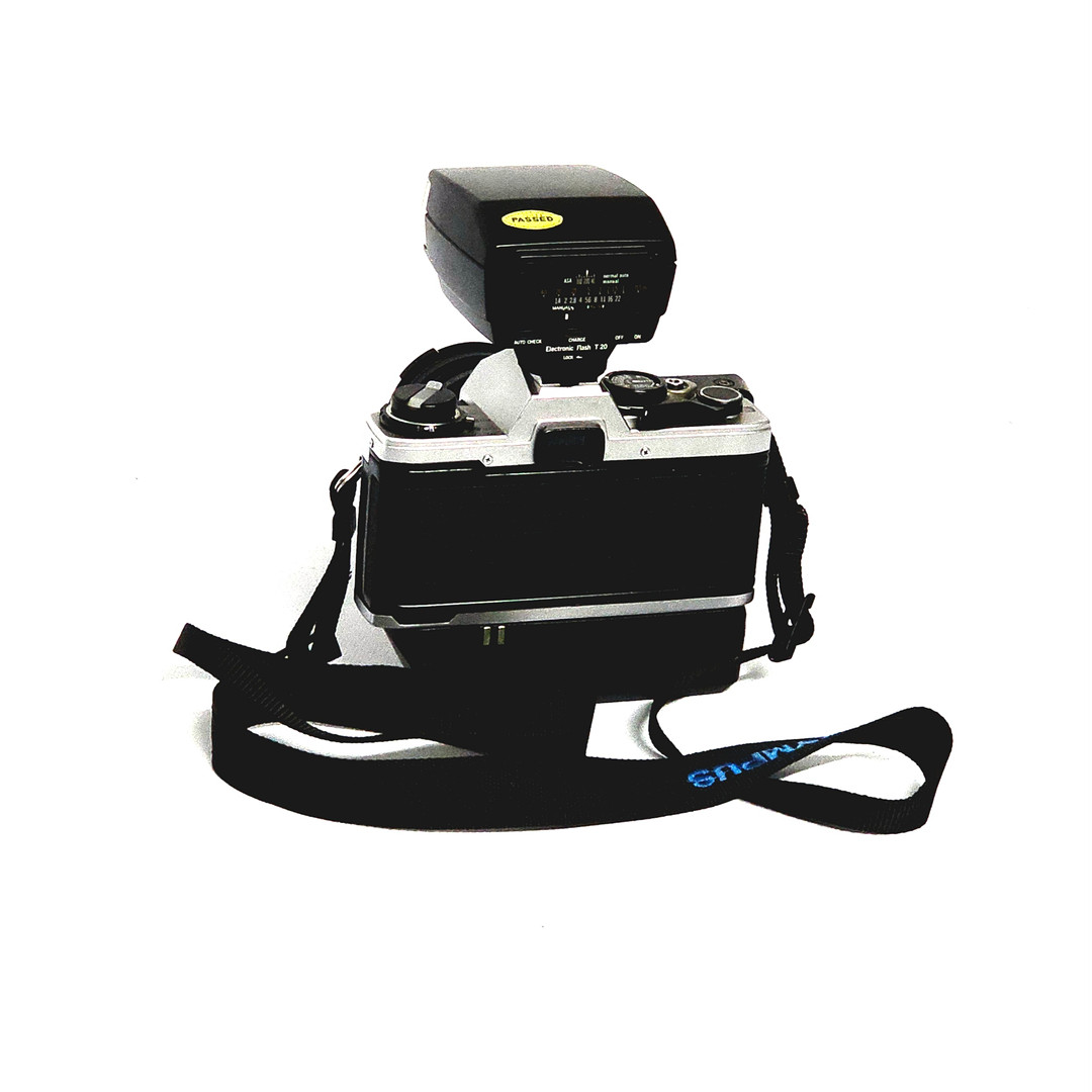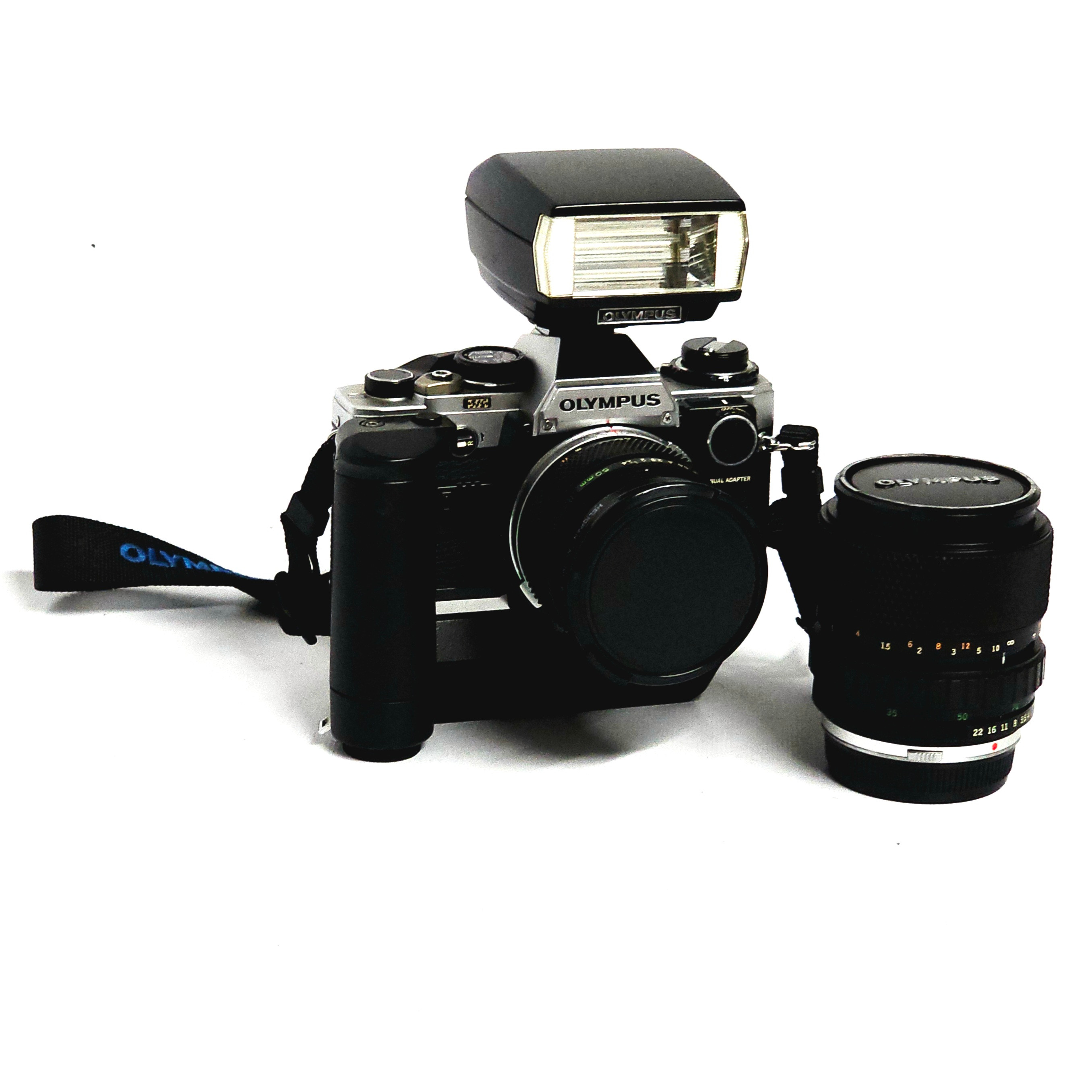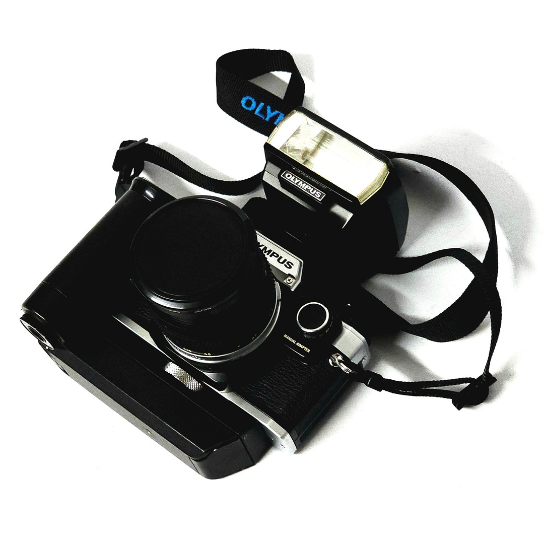 4347280. Olympus-kamera lisäobjektiivilla ja salamalla.