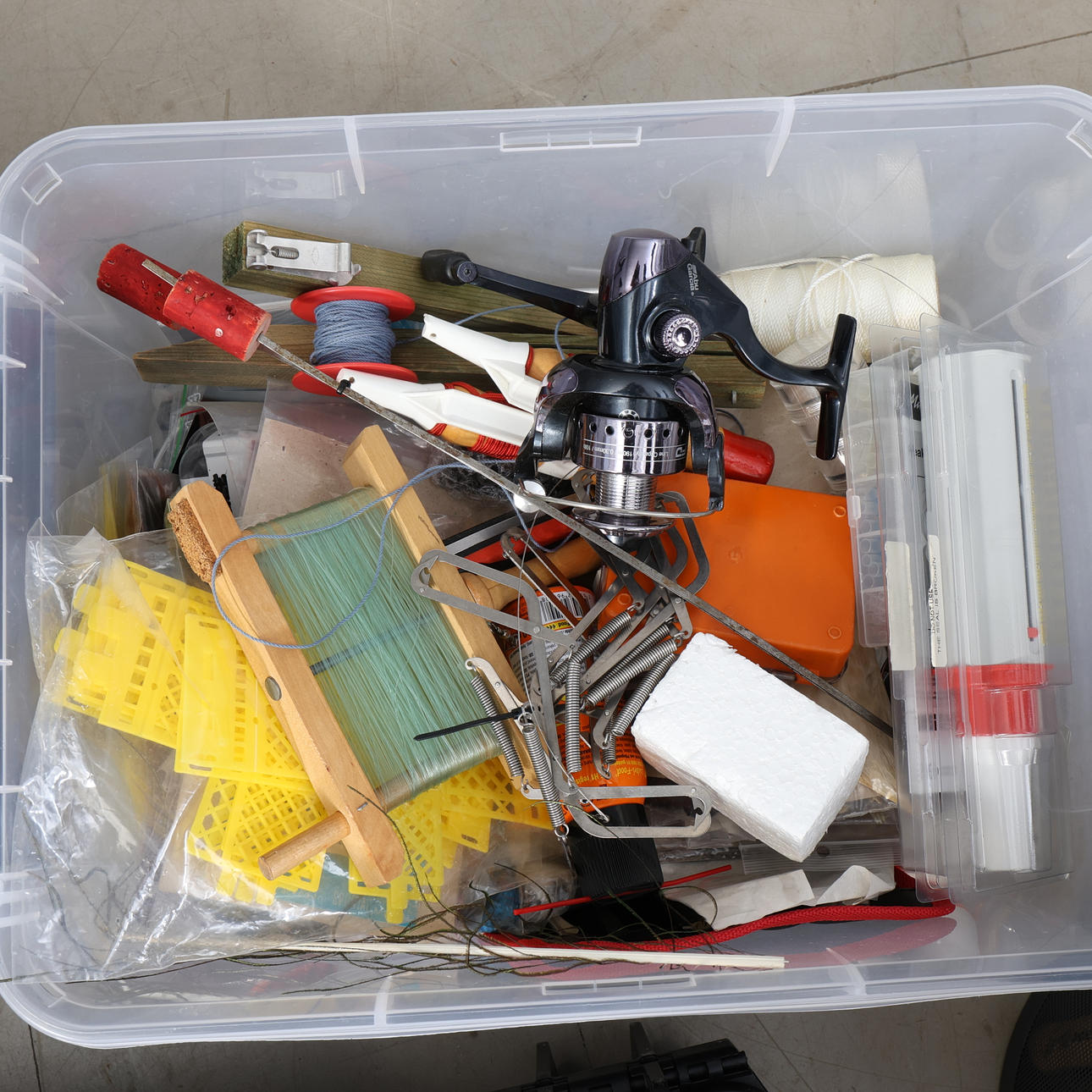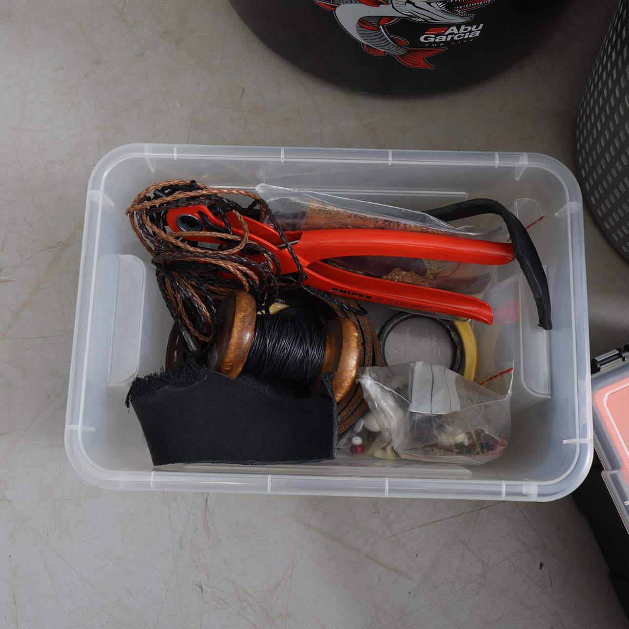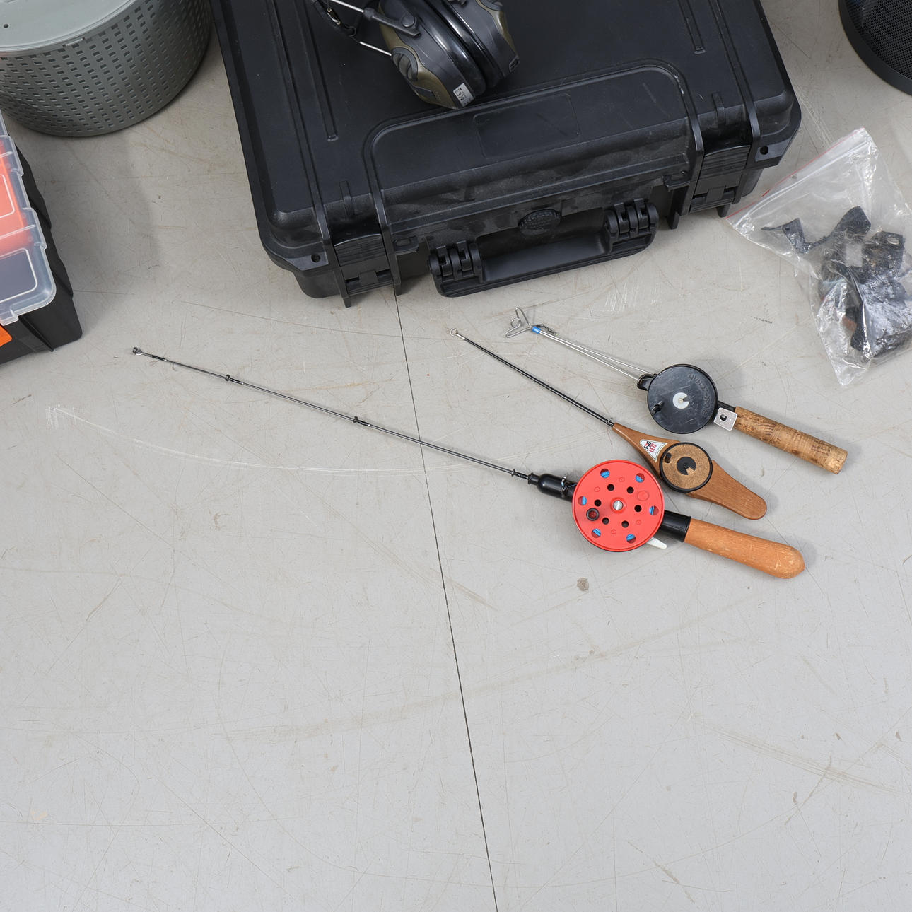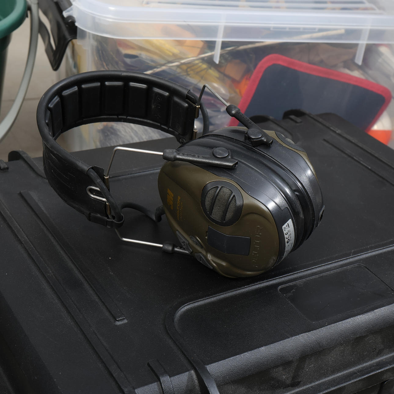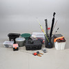 Muun muassa Daiwa, Junior, Bon Thompson, kuulonsuojain Peltor jne. 60x60x90 cm.