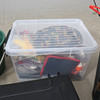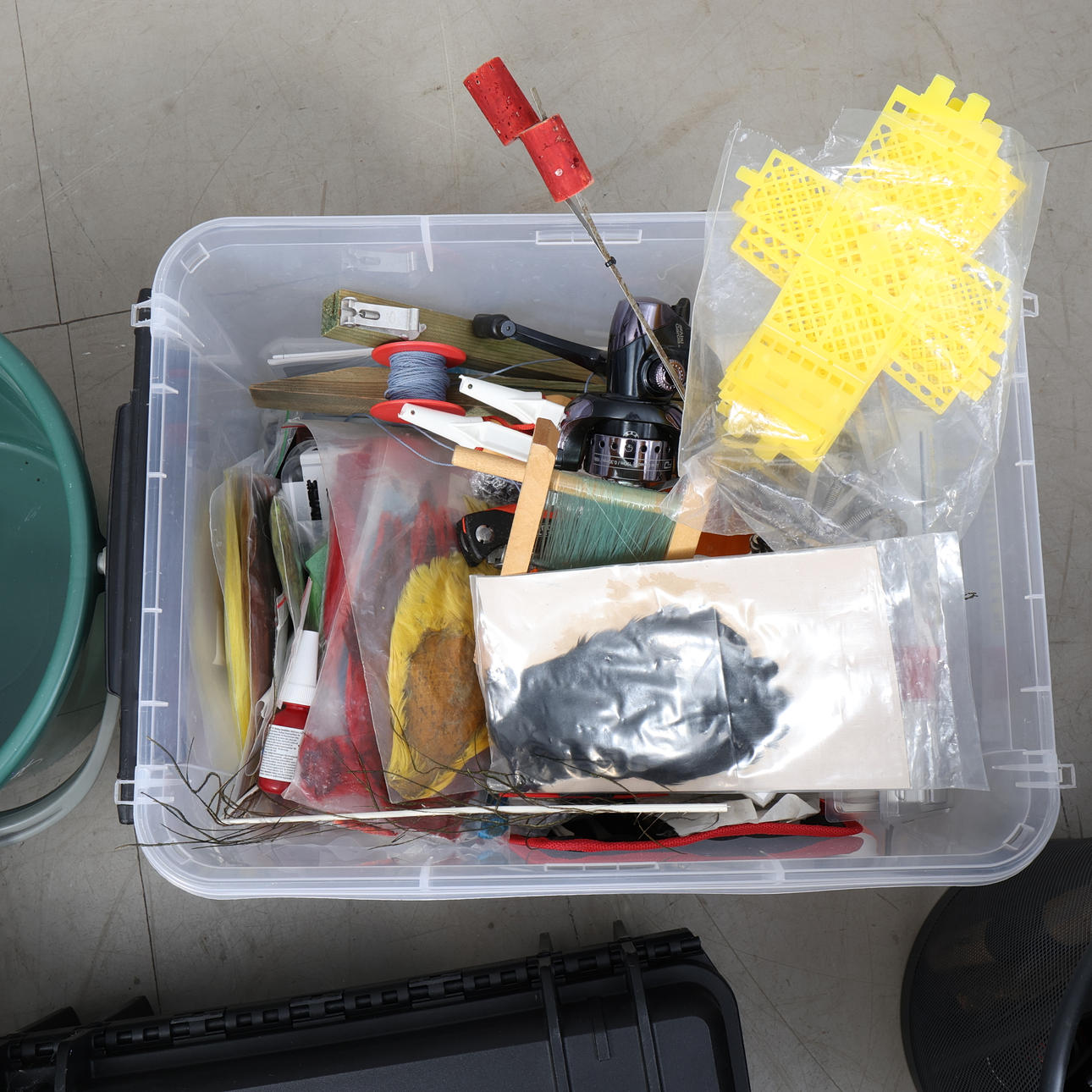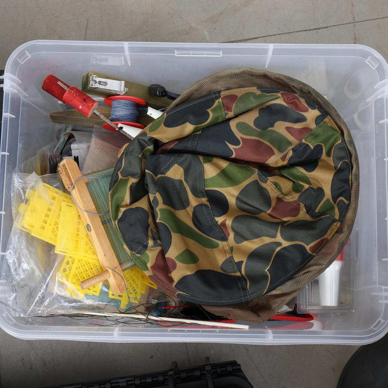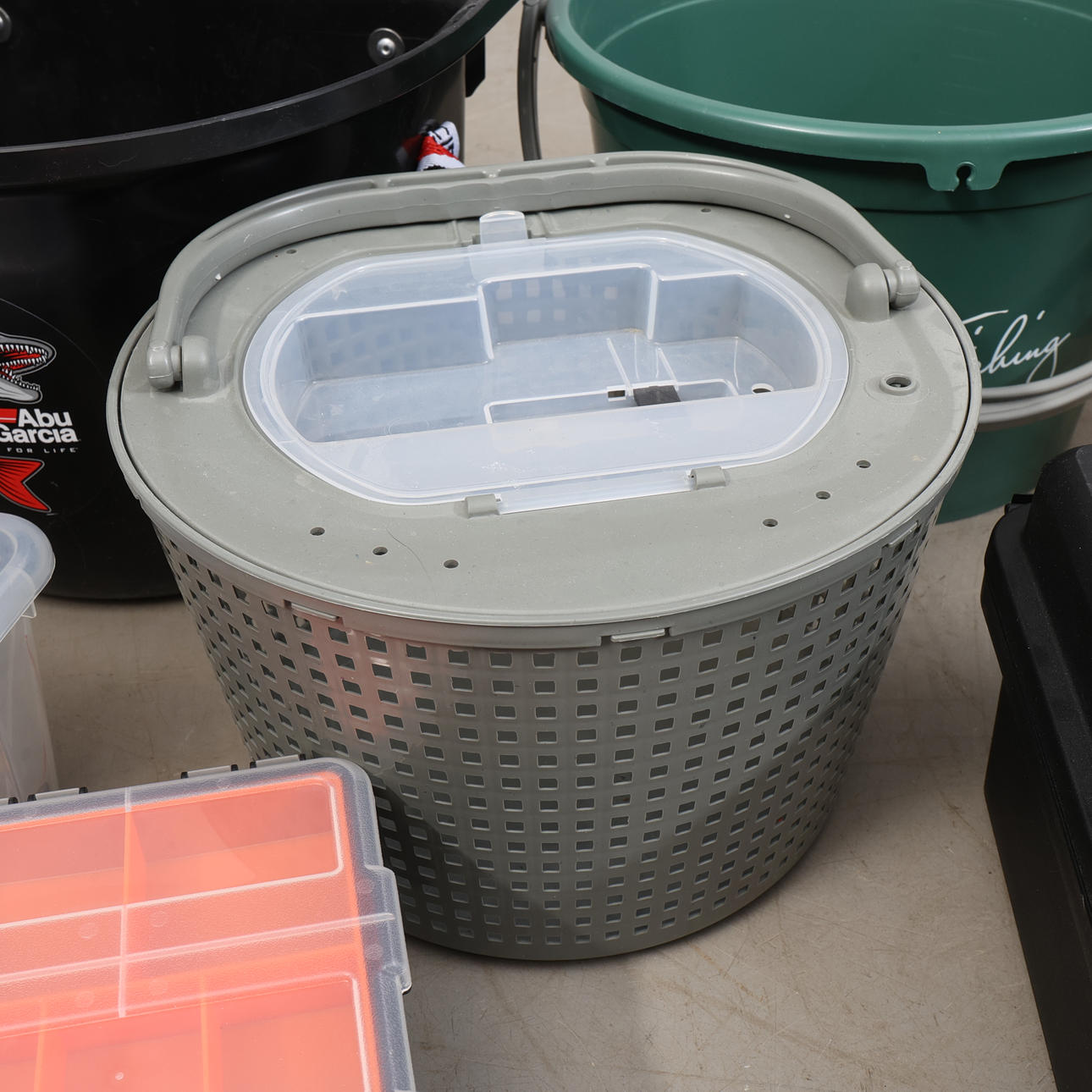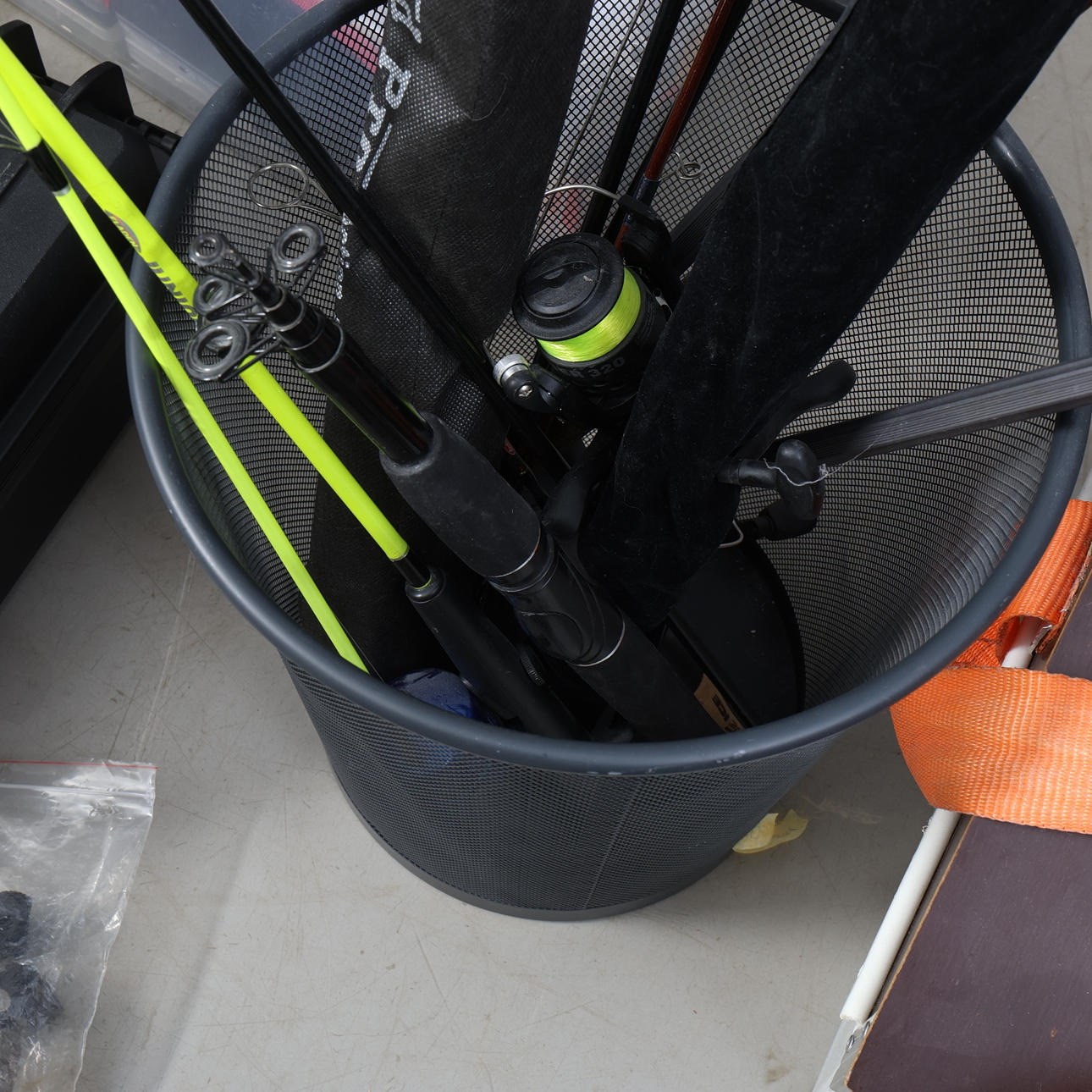 Muun muassa Daiwa, Junior, Bon Thompson, kuulonsuojain Peltor jne. 60x60x90 cm.