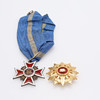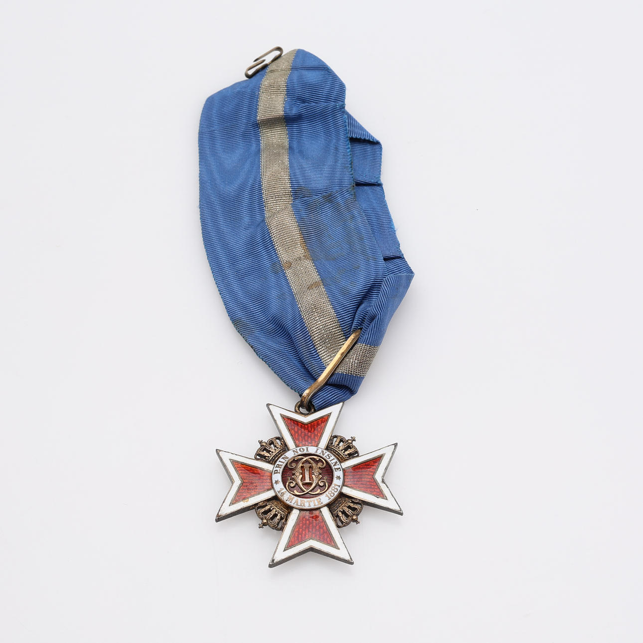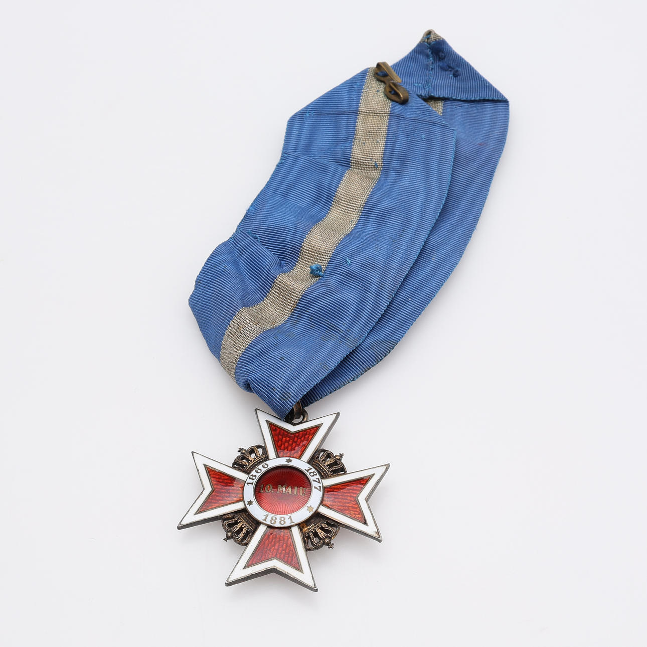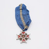 Romanian kruununritarikunta, ”Corona Romania”, hopeaa ja emalia, sinivalkoisella nauhalla, ca 4,5x5 cm.