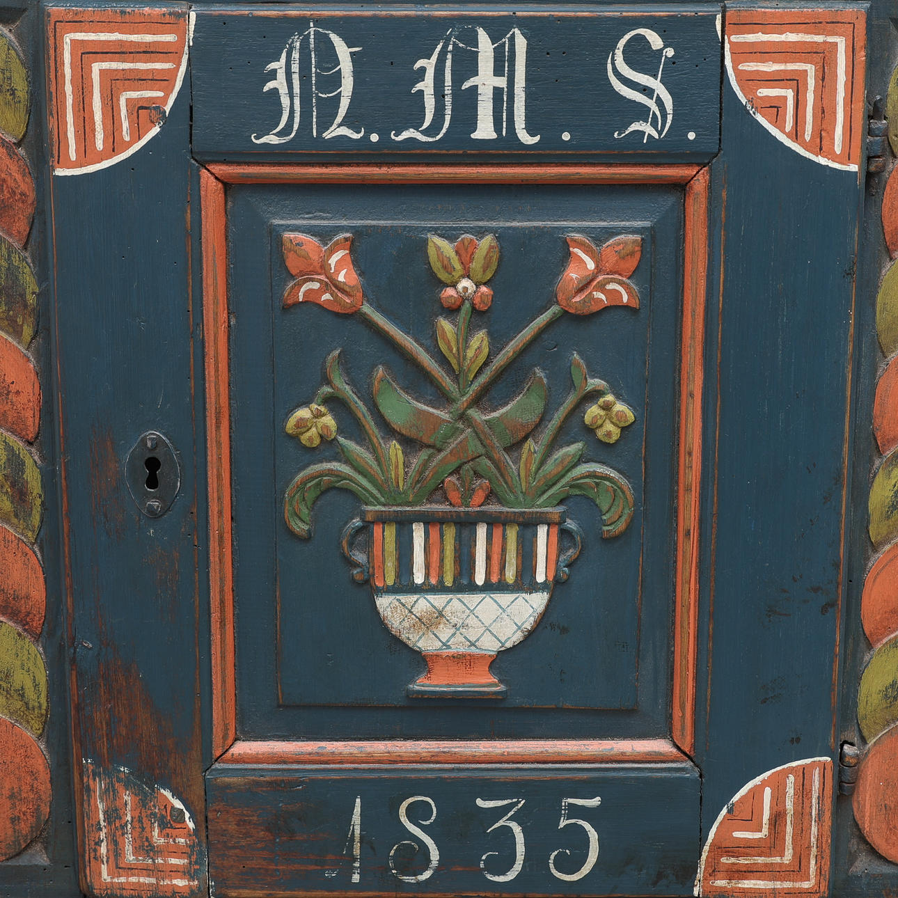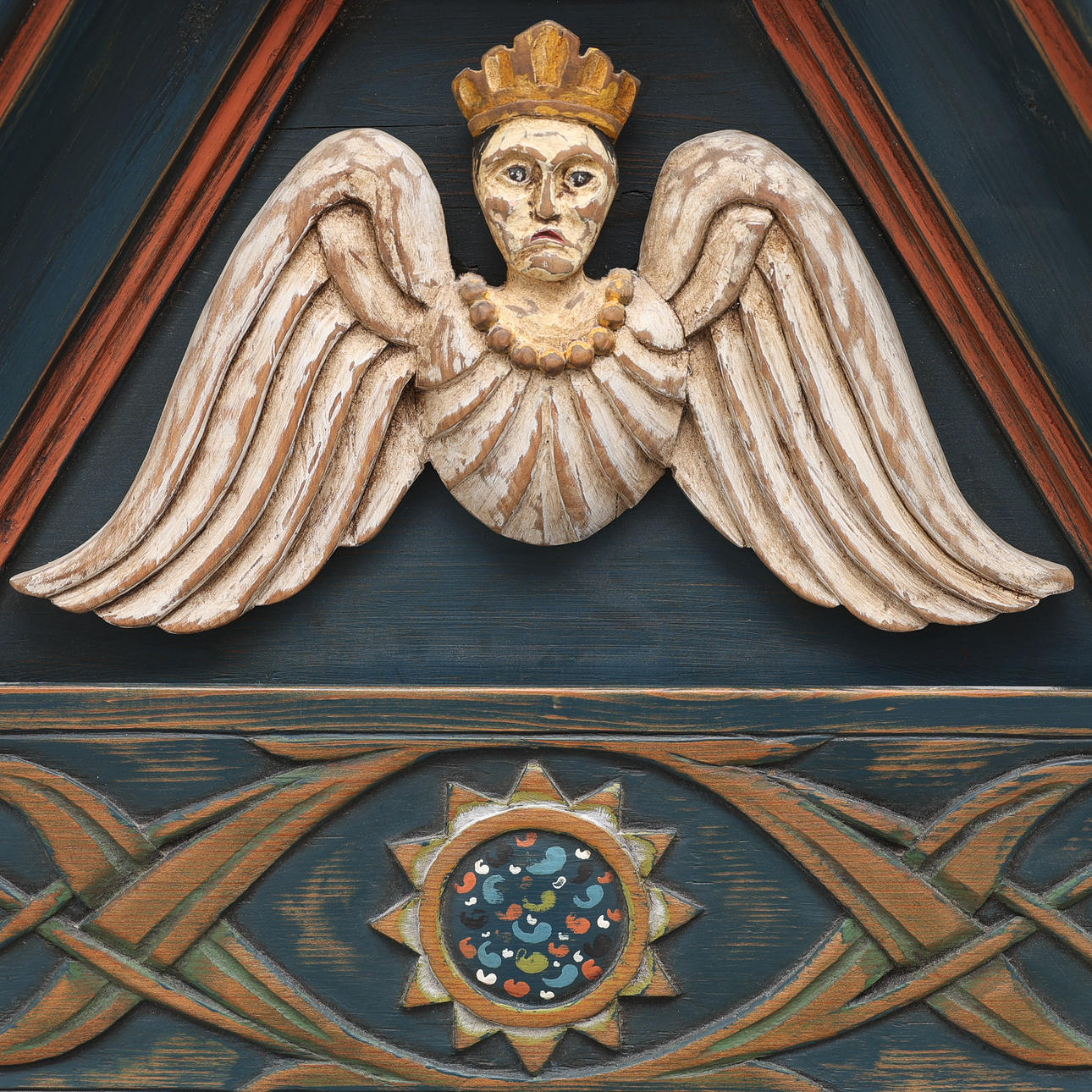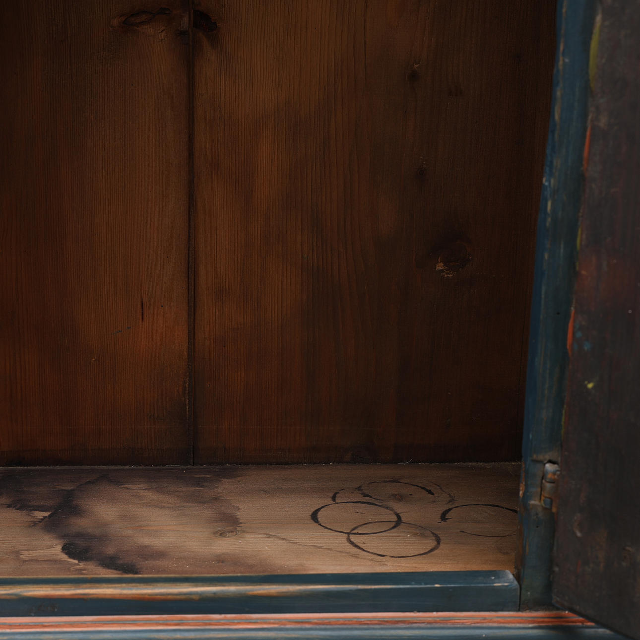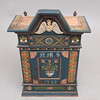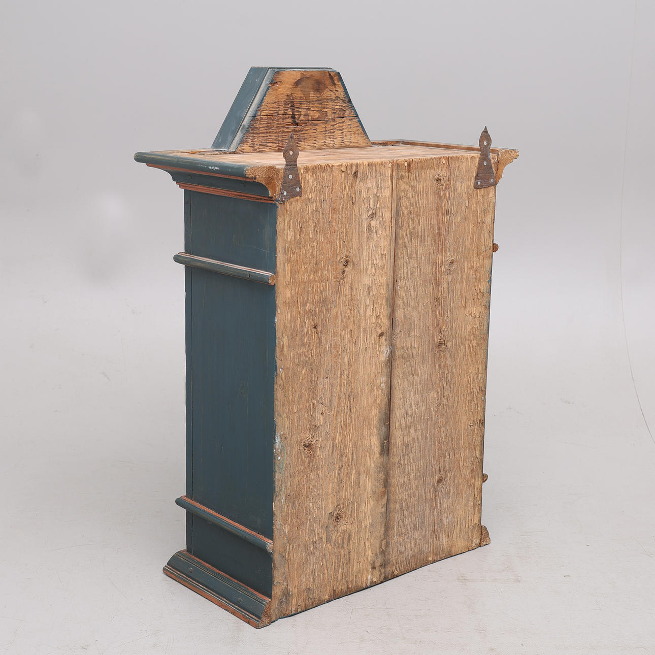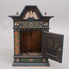 Maalattu, koostettu eri-ikäisistä osista, korkeus 97,5 cm, leveys 68 cm, syvyys 33 cm.