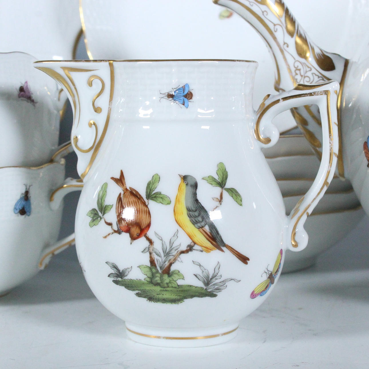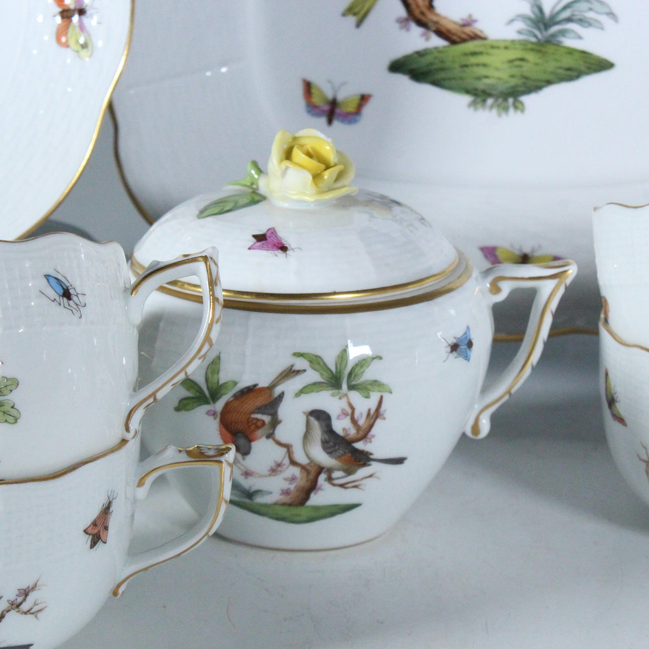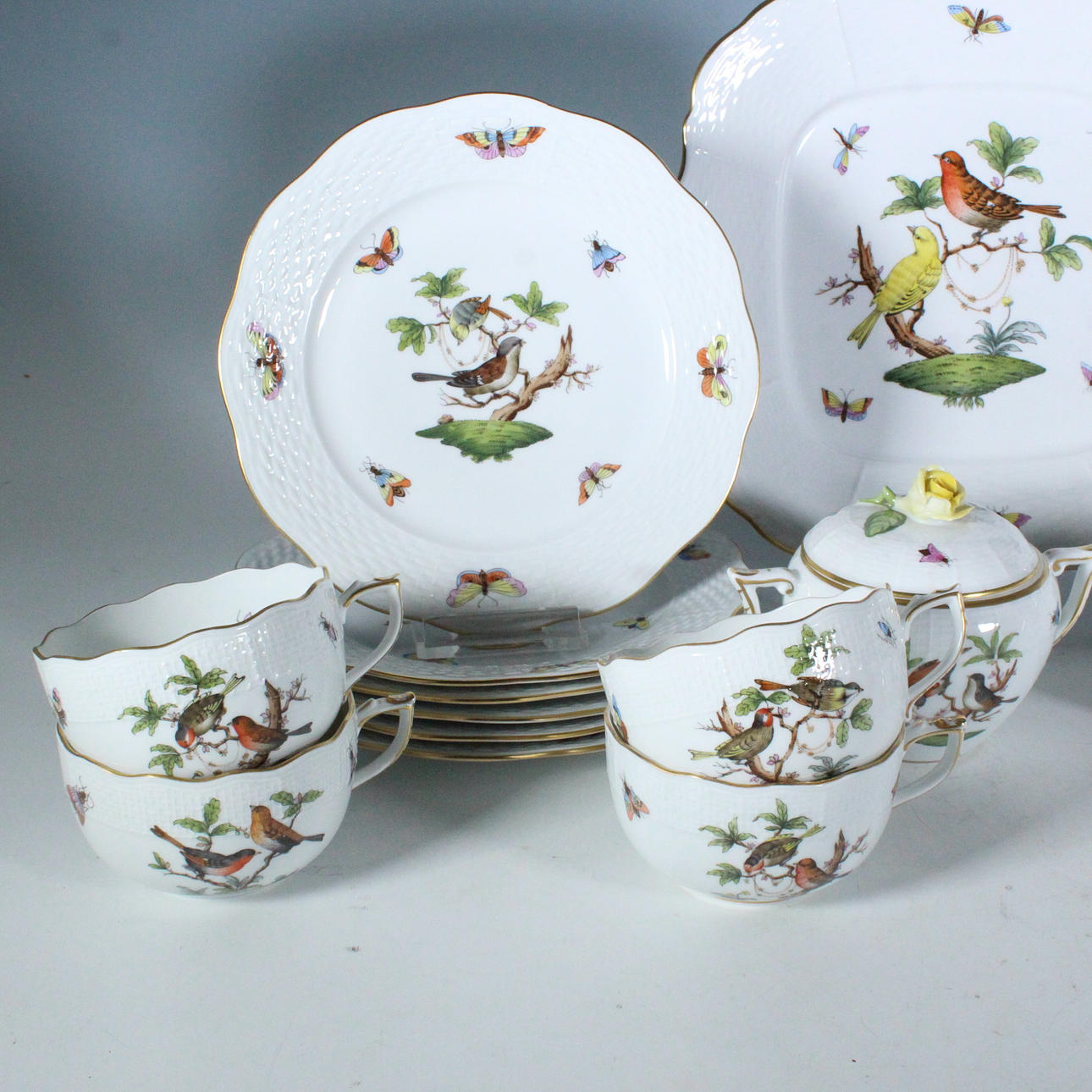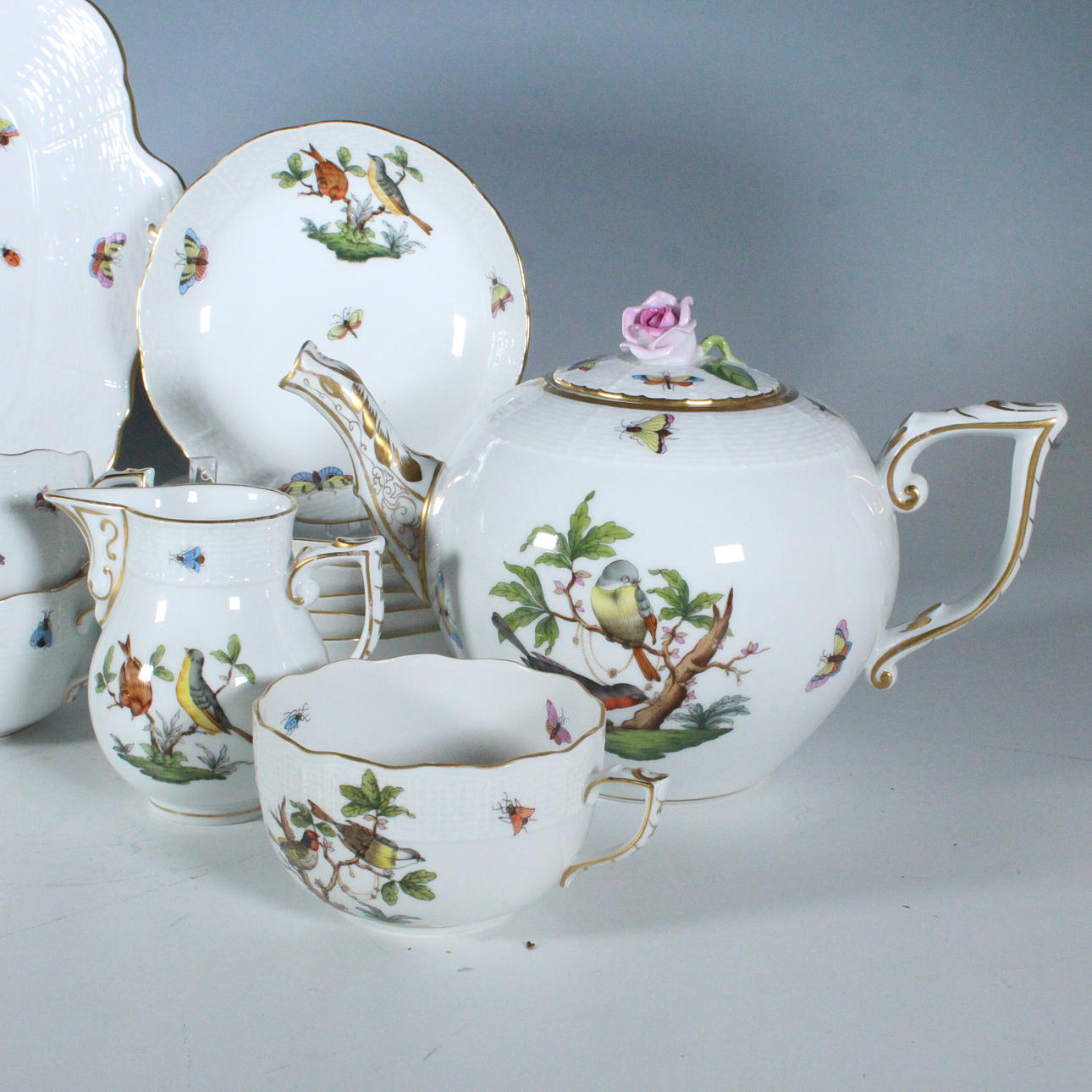 Herend, Unkari, 'Rothschild' teesetti, posliini, 23-osainen, palvelu on koristeltu monikromisilla esityksillä erilaisista kukista, oksista, linnuista ja hyönteisistä sekä kultaisilla reunoilla, osittain koristeltu filigraanilla, kukkakoristeella, kaikki esineet on maalattu käsin ja jokaisella on valmistajan merkki,