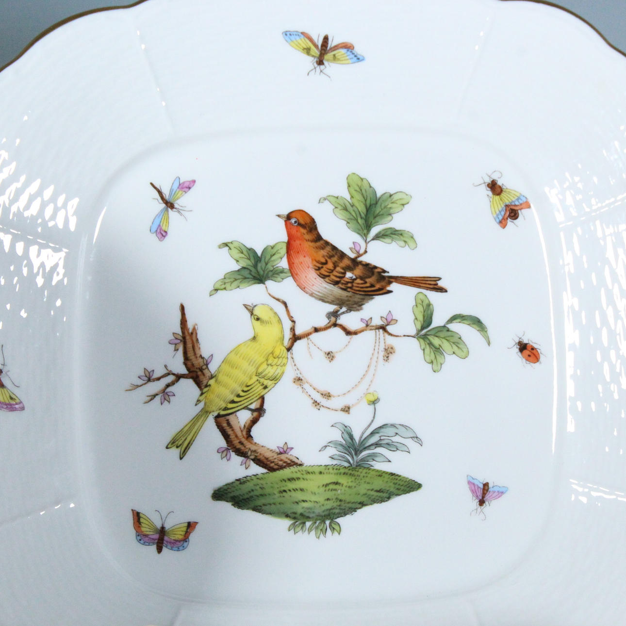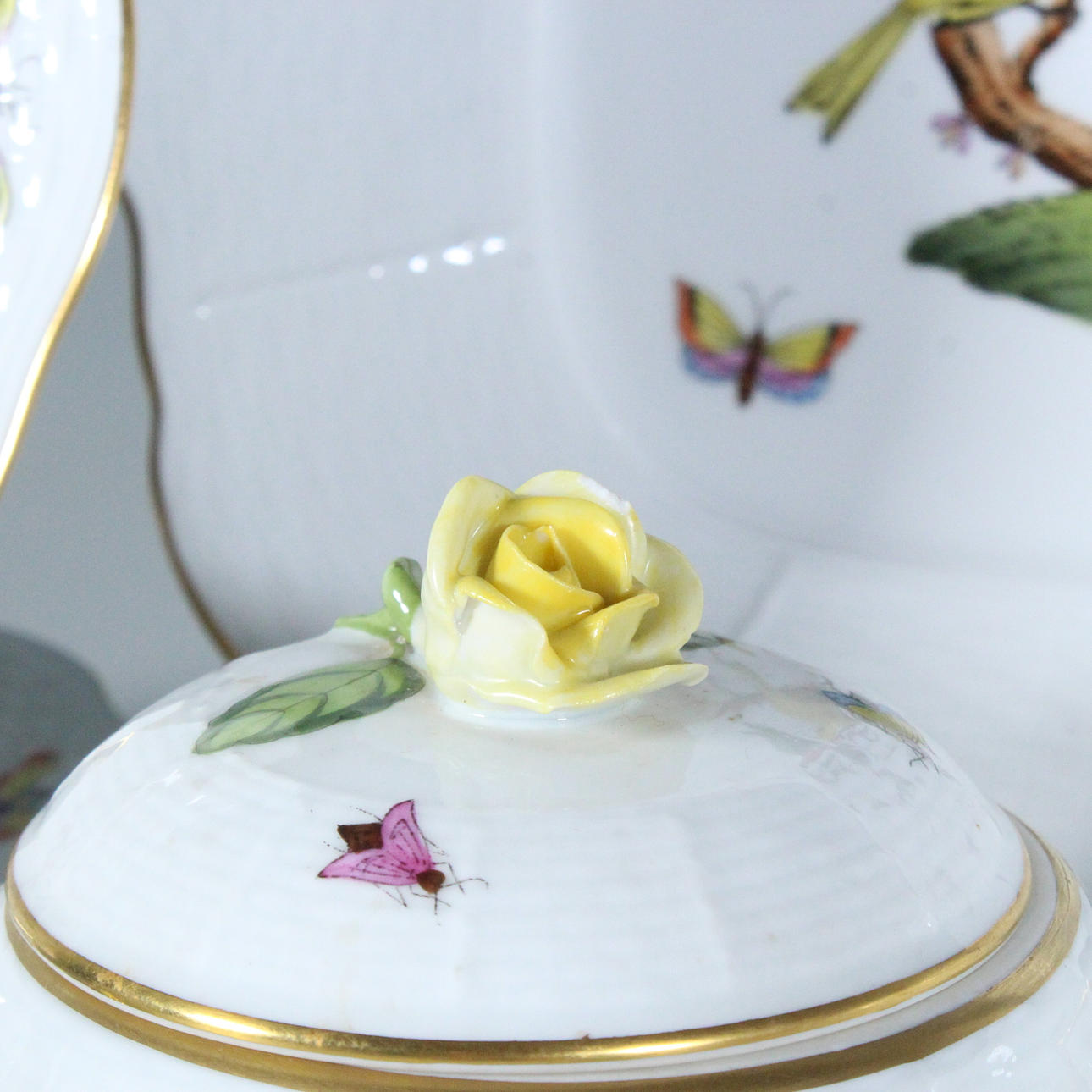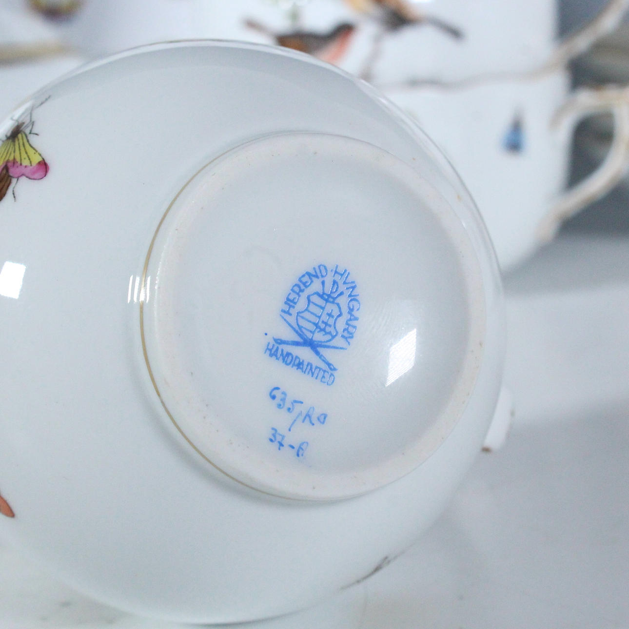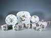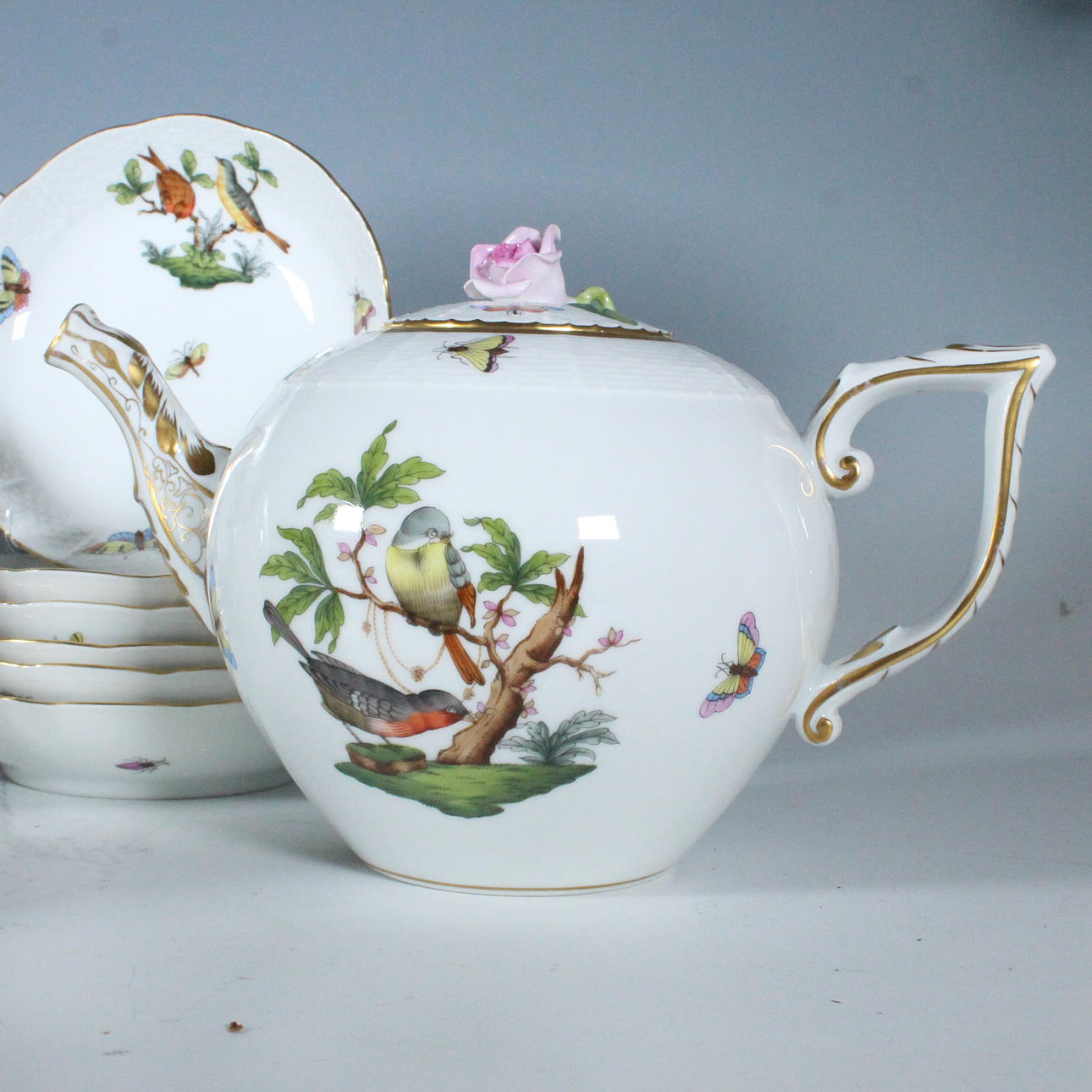 Herend, Unkari, 'Rothschild' teesetti, posliini, 23-osainen, palvelu on koristeltu monikromisilla esityksillä erilaisista kukista, oksista, linnuista ja hyönteisistä sekä kultaisilla reunoilla, osittain koristeltu filigraanilla, kukkakoristeella, kaikki esineet on maalattu käsin ja jokaisella on valmistajan merkki,