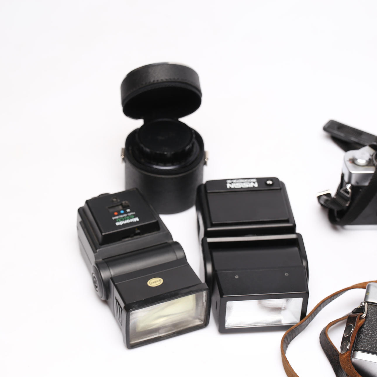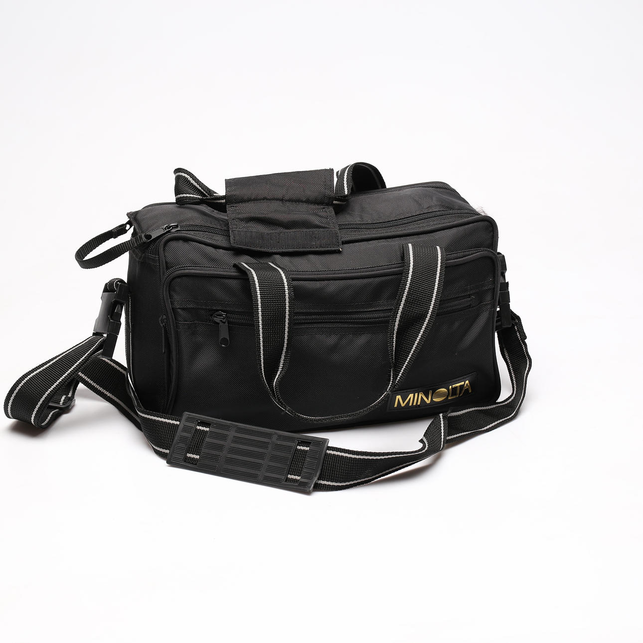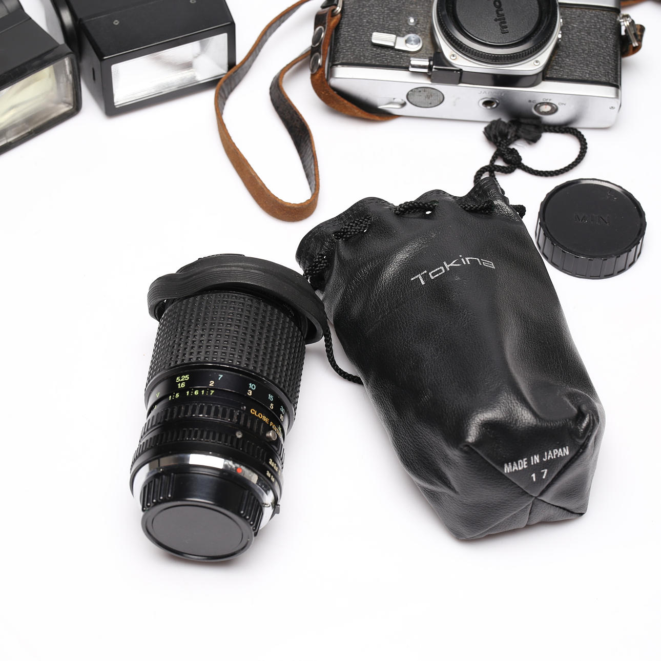 Yashican ministeri D, Minolta SRT 101b, Minolta XD 5. Tokinan linssit. Laukku n. 35x19x19cm.
