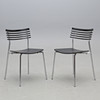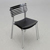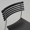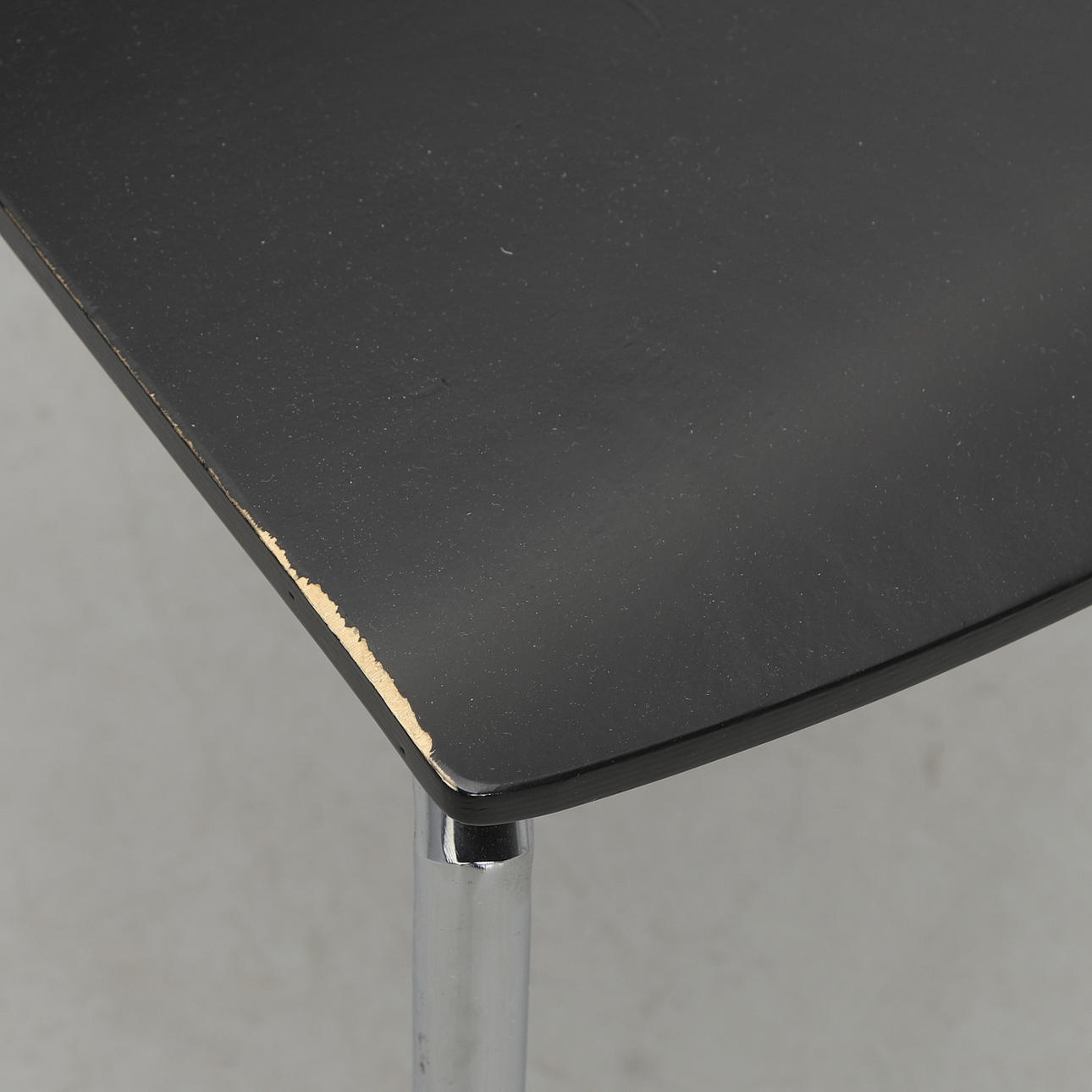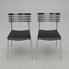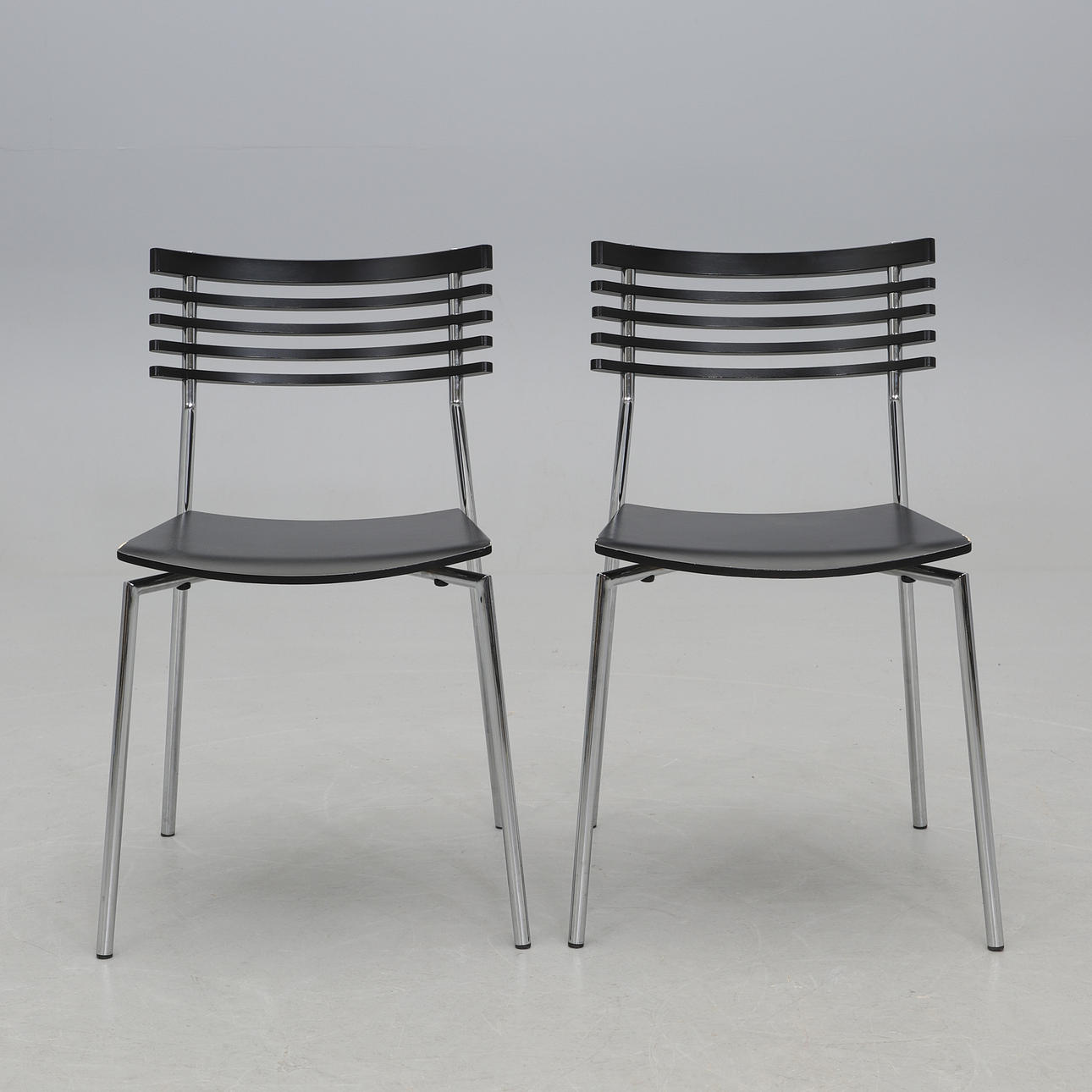 Kromattu teräsputkirunko mustalla lakatulla puuistuimella ja selkänojalla. Pinottava. Etiketillä merkitty. Leveys 43, syvyys 50, selkäkorkeus 80, istuinkorkeus 47 cm.