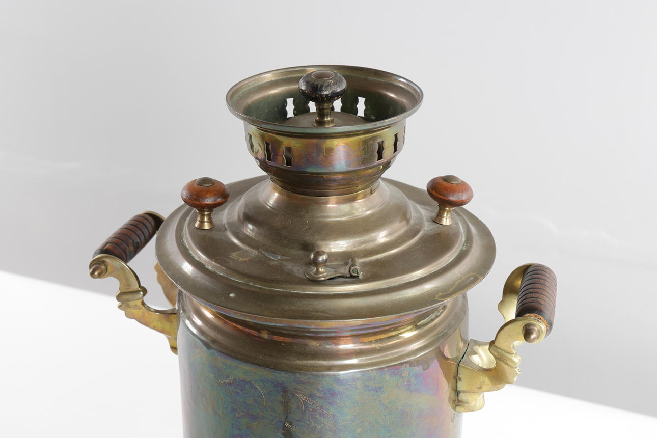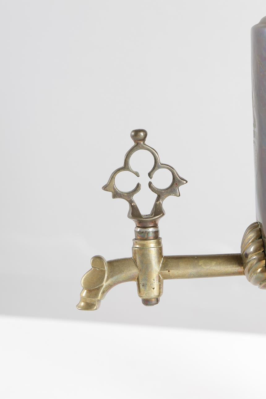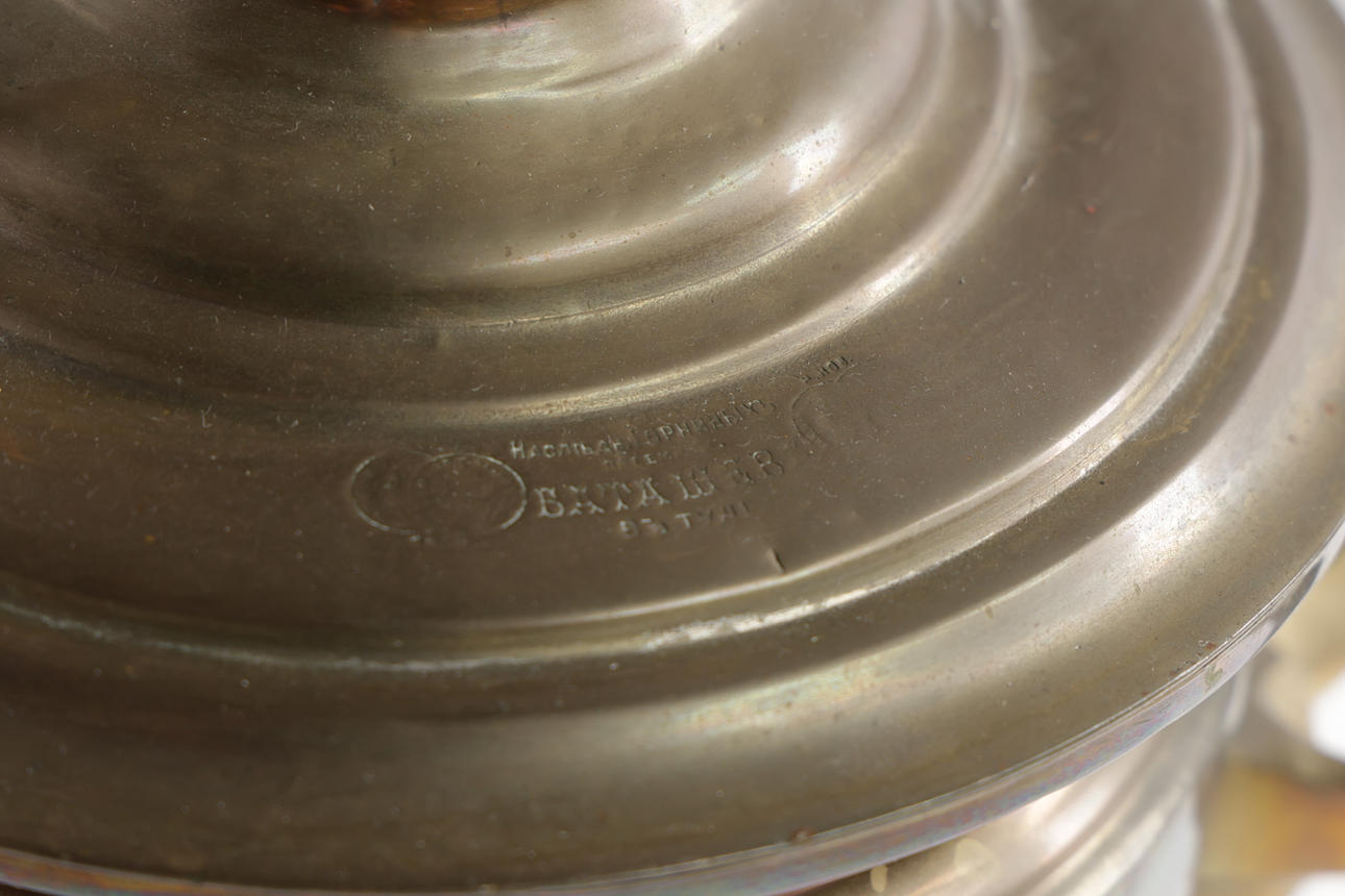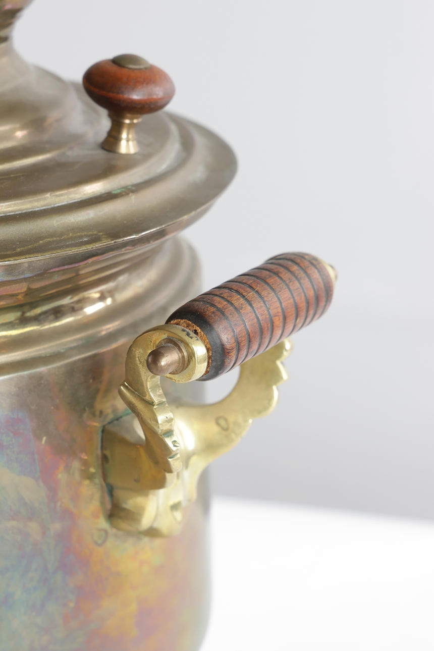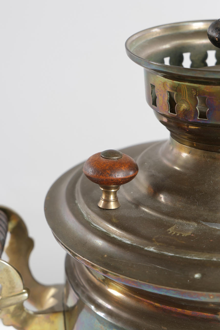 Leimattu edessä ja kannessa. Kahvan kansi ja sivut sorvattua puuta. Korkeus: n. 45 cm.