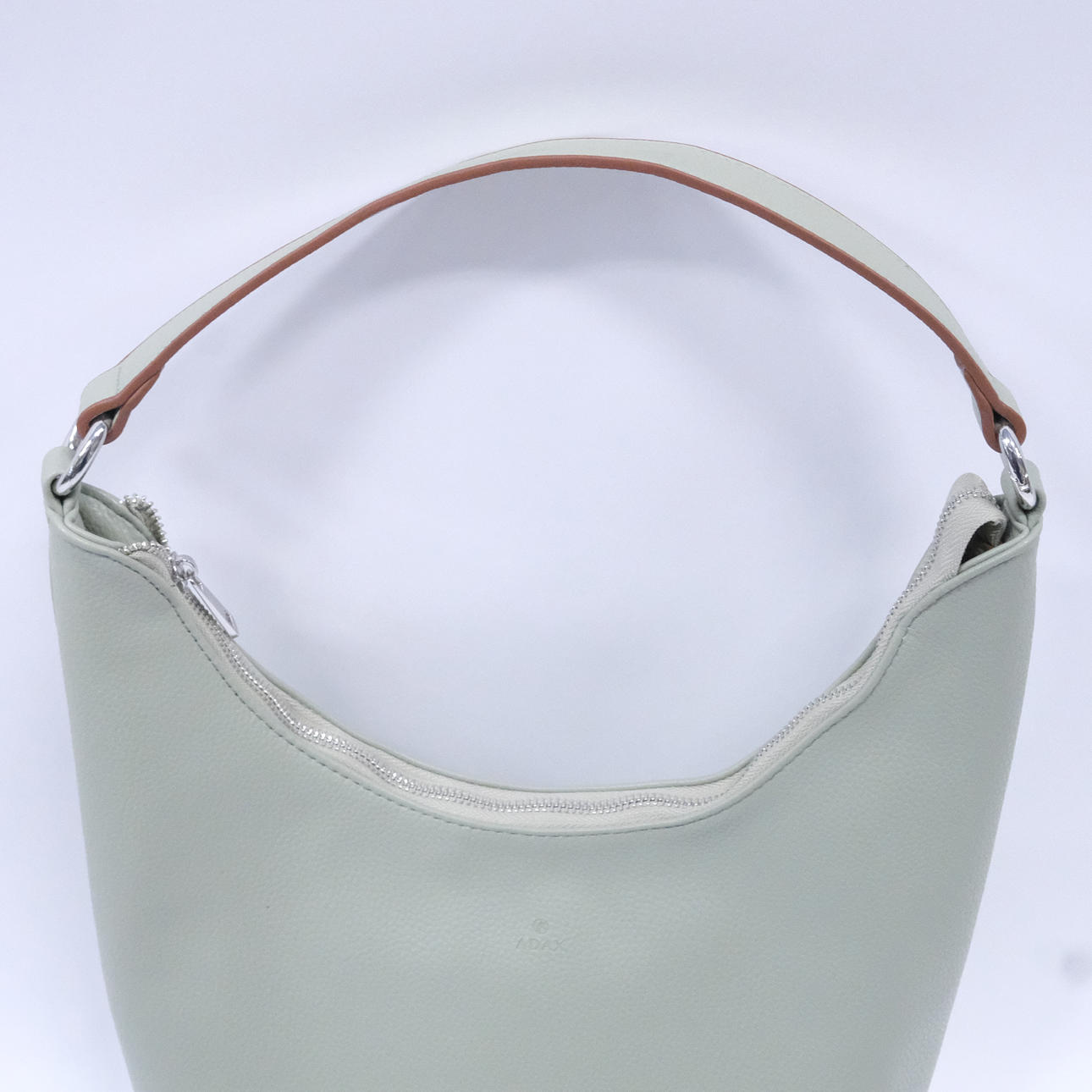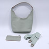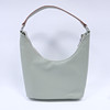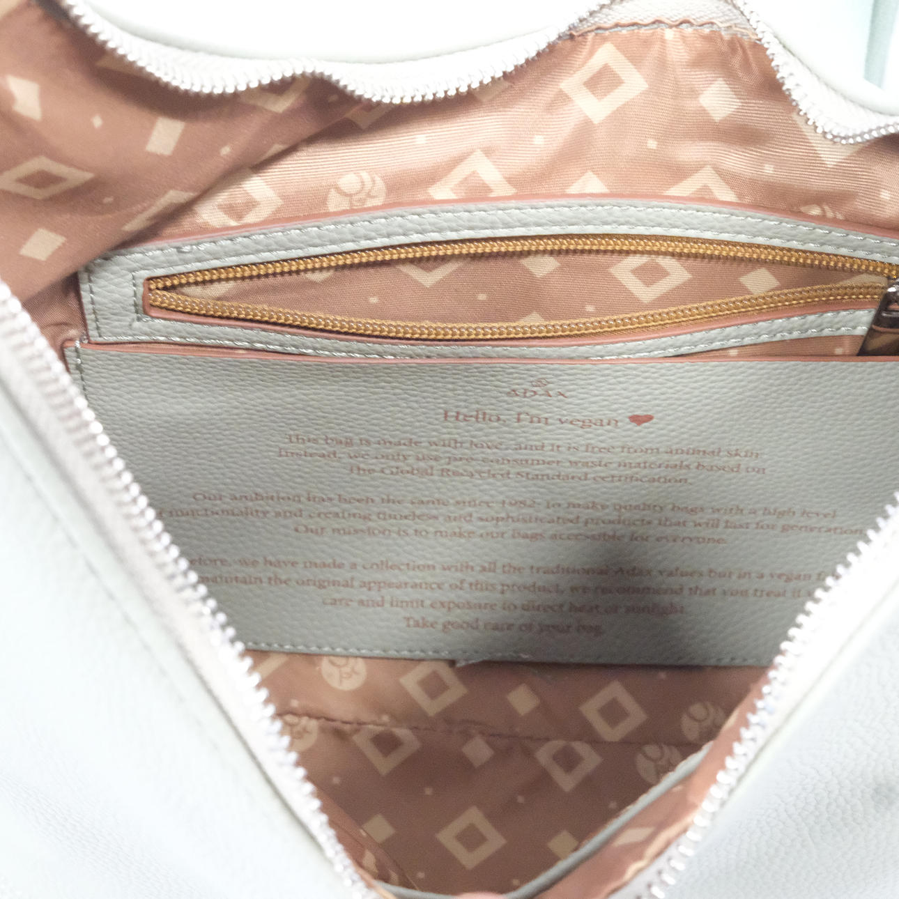 Vaaleanvihreä tekonahka, ”Hello, I'm vegan”, sisältää lompakon ja ristihihnan, leveys n. 27 cm, korkeus n. 30 cm.
