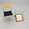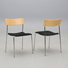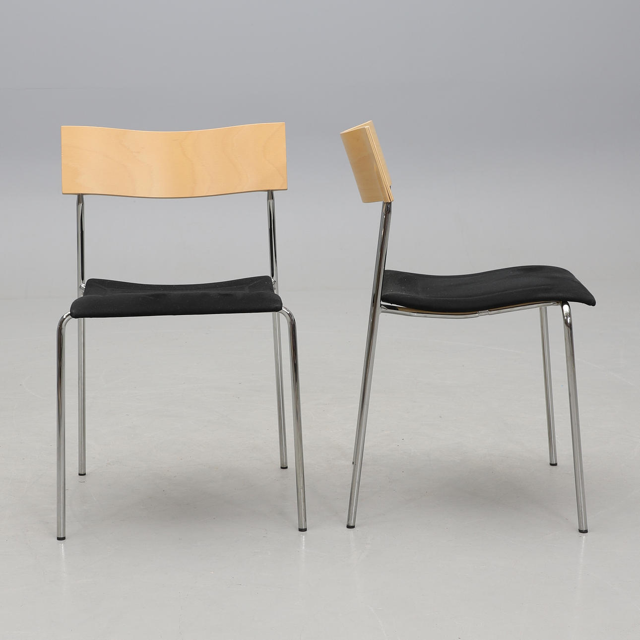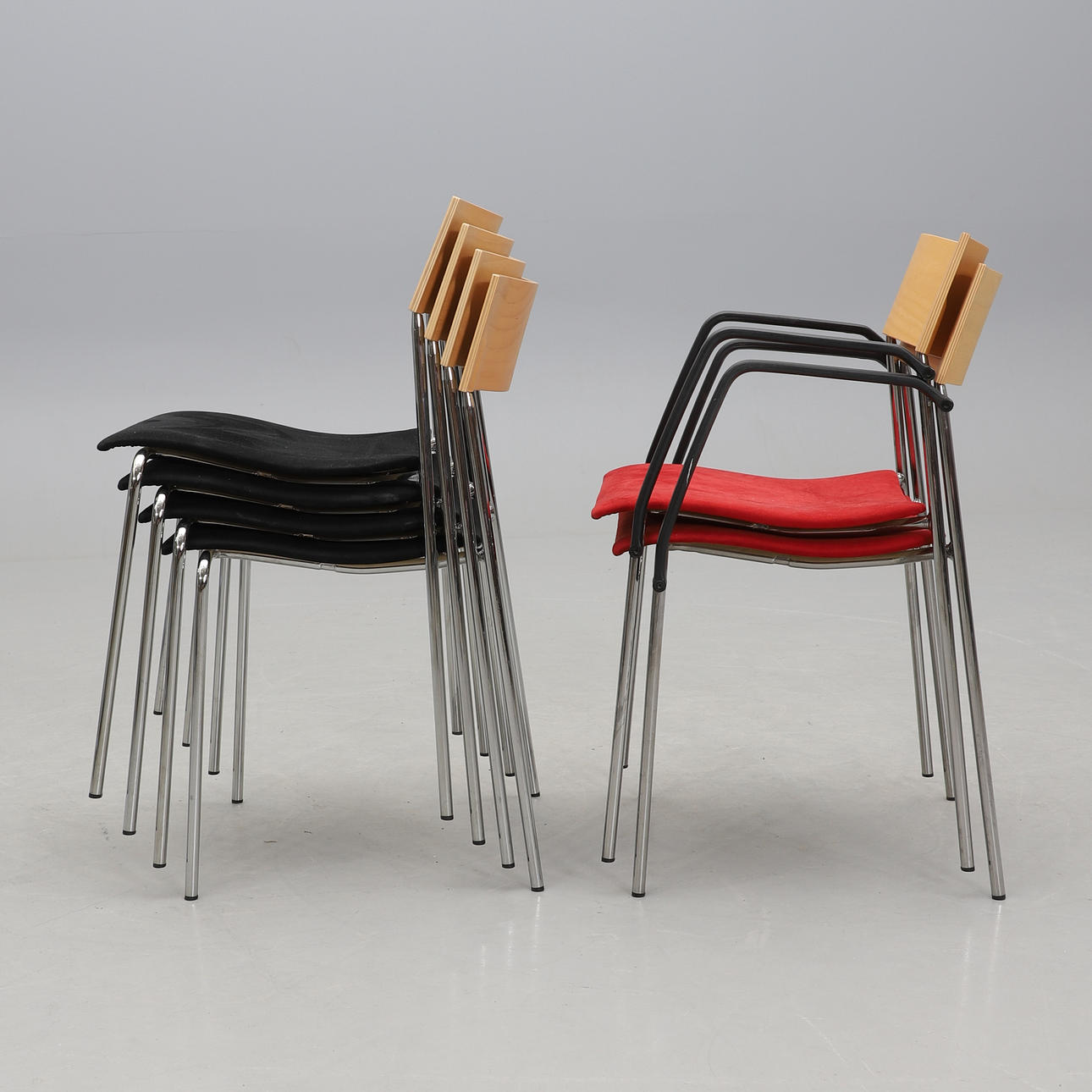 2 nojatuolia ja 4 tuolia. Kromattu teräsputkirunko. Takana pyökkivaneria. Tekstiiliverhoiltu istuin. Ne on merkitty. Pinottava. Nojatuolien leveys n. 54, syvyys 42, selkäkorkeus 76, istuinkorkeus 44,5 cm.