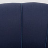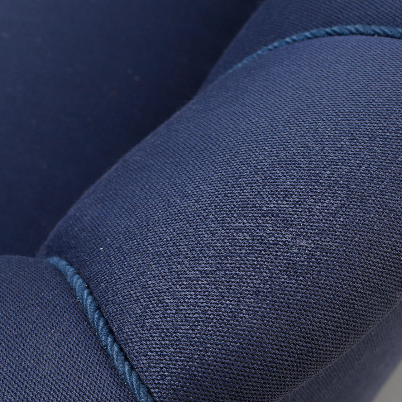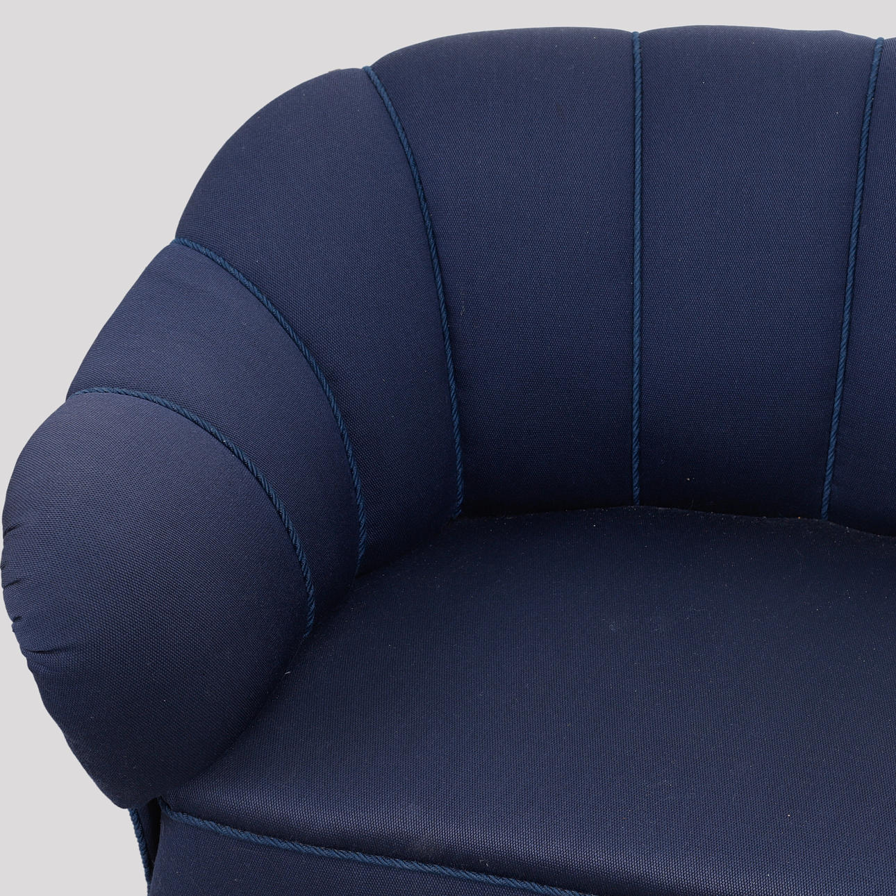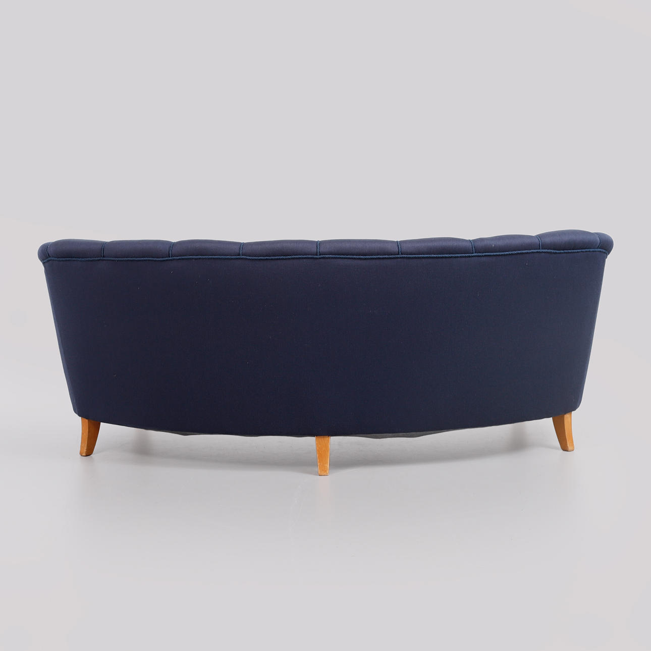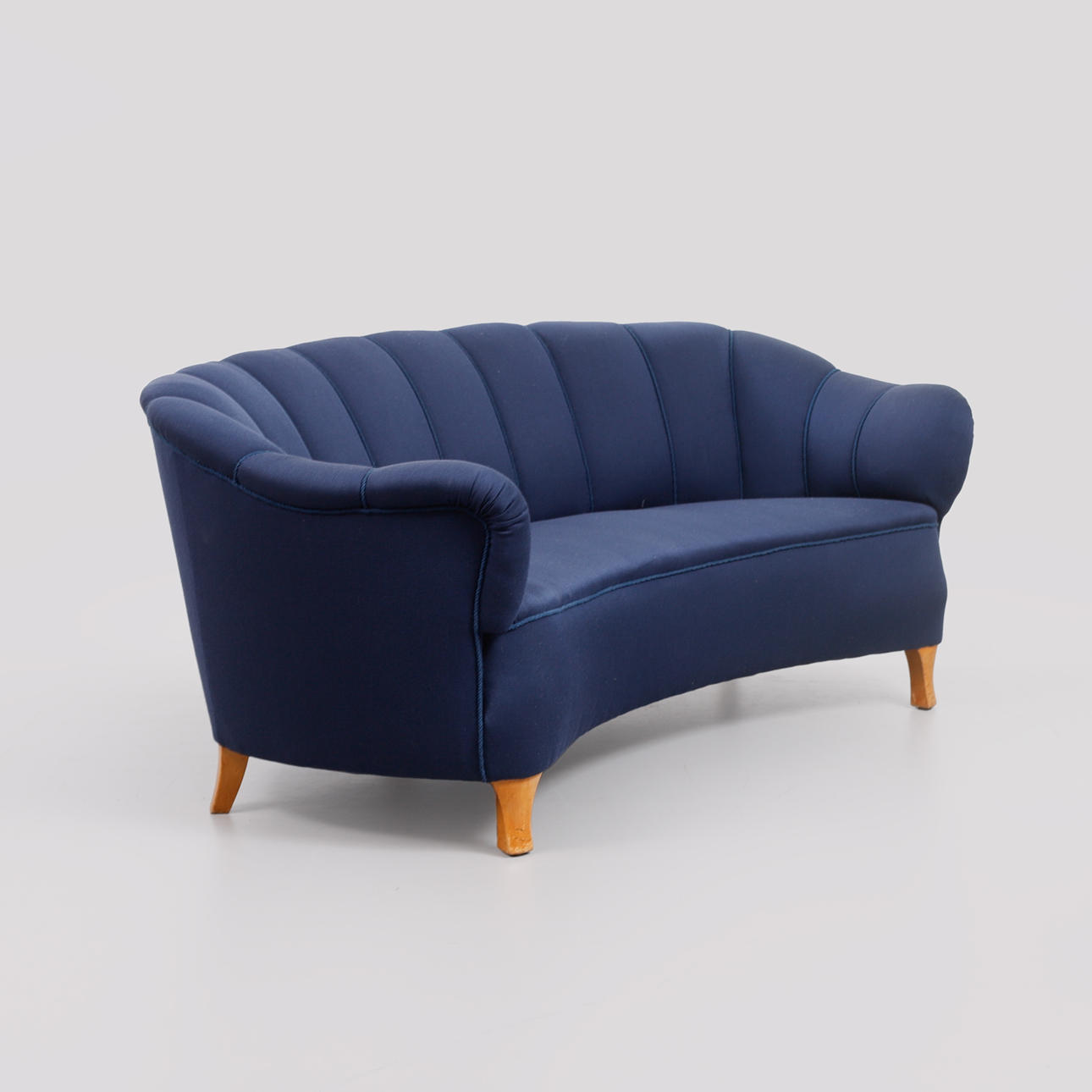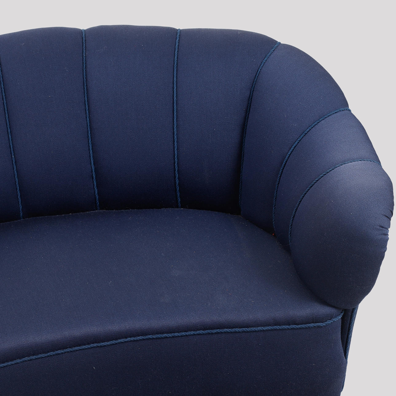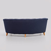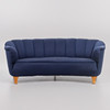 Pukeutunut siniseen kankaaseen. Pituus 185, istuinkorkeus 42, syvyys 75, korkeus 72 cm.