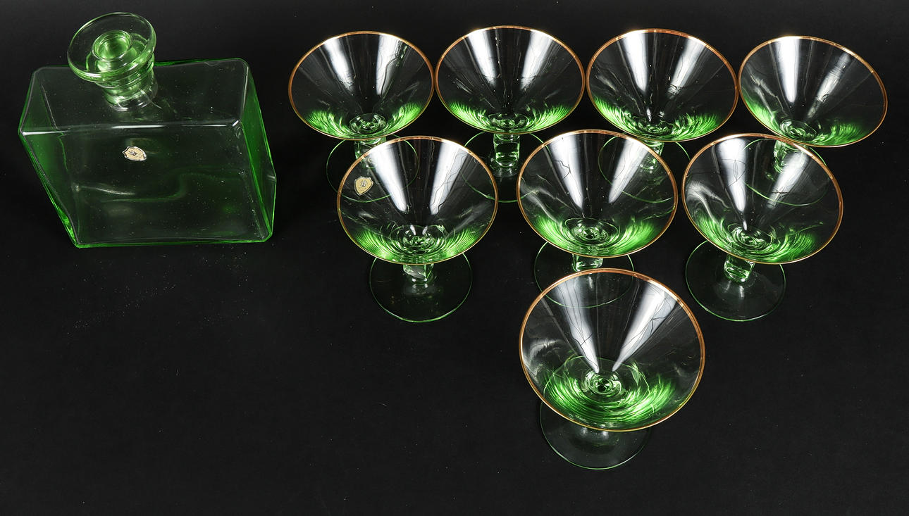 Karahvin korkeus 15 cm. 8 lasin korkeus 8 cm, halkaisija 8,5 cm.