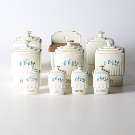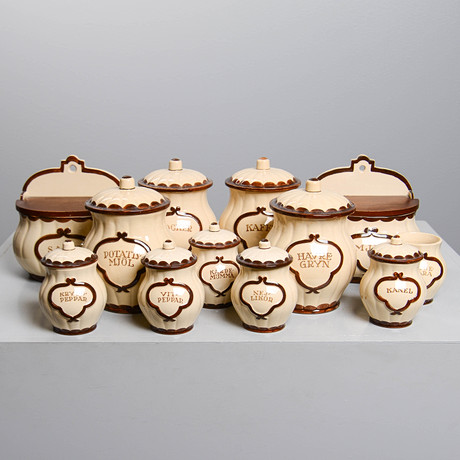 Maustepurkit malli ”Kryddgränden” nro 7 ja 9. Flintware, jossa on tiikkilukko. Leveys 16,5, syvyys n. 10, korkeus 14,5 cm ja vähemmän. Figurien/kynttilänjalkojen korkeus n. 15,5 cm.