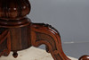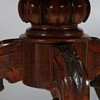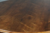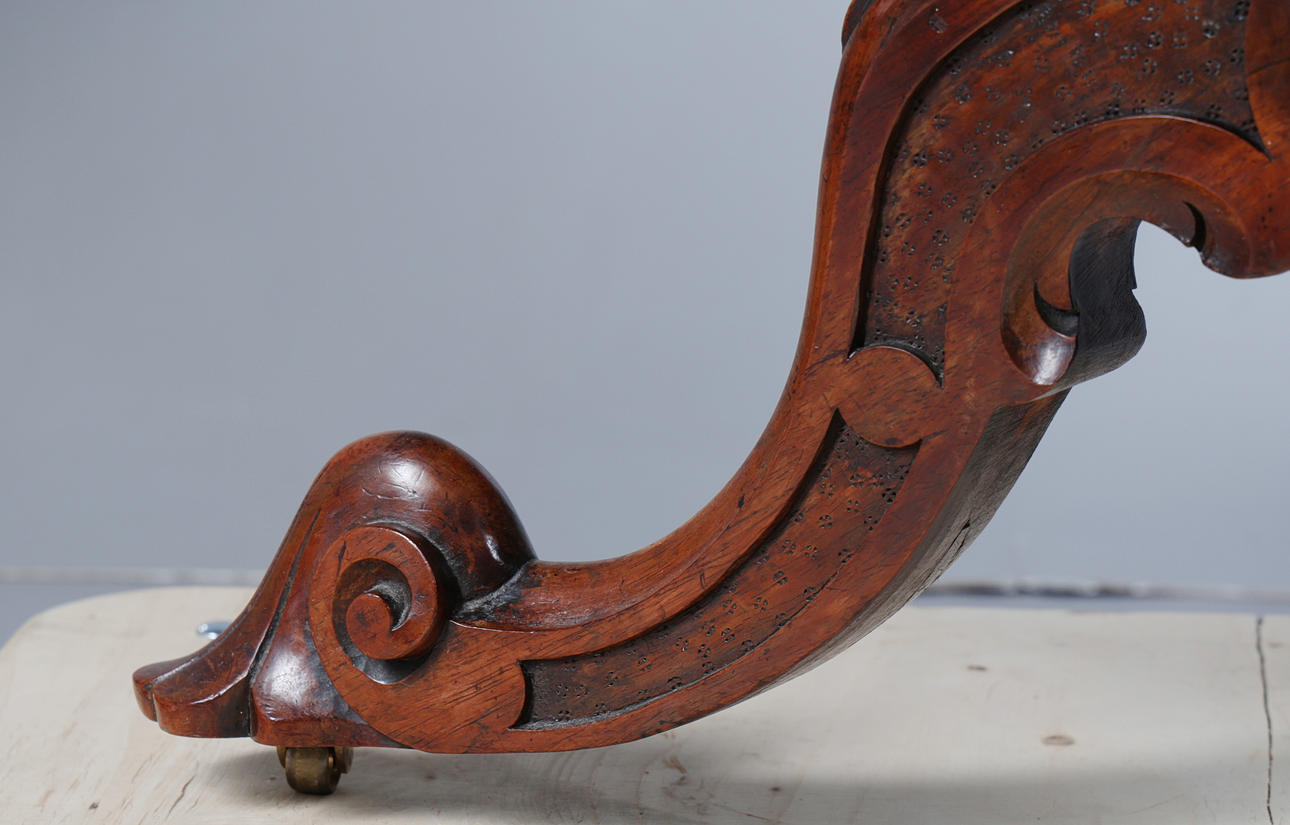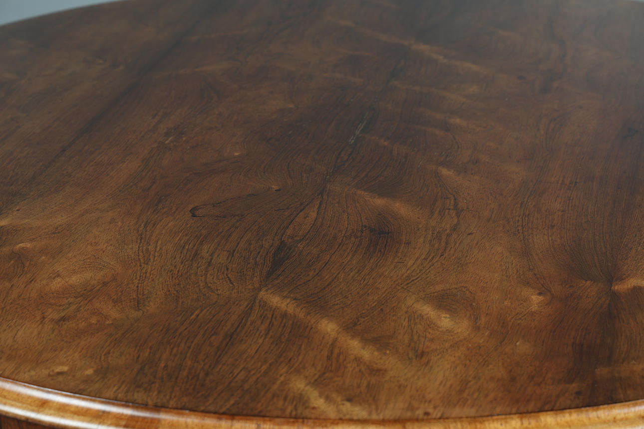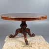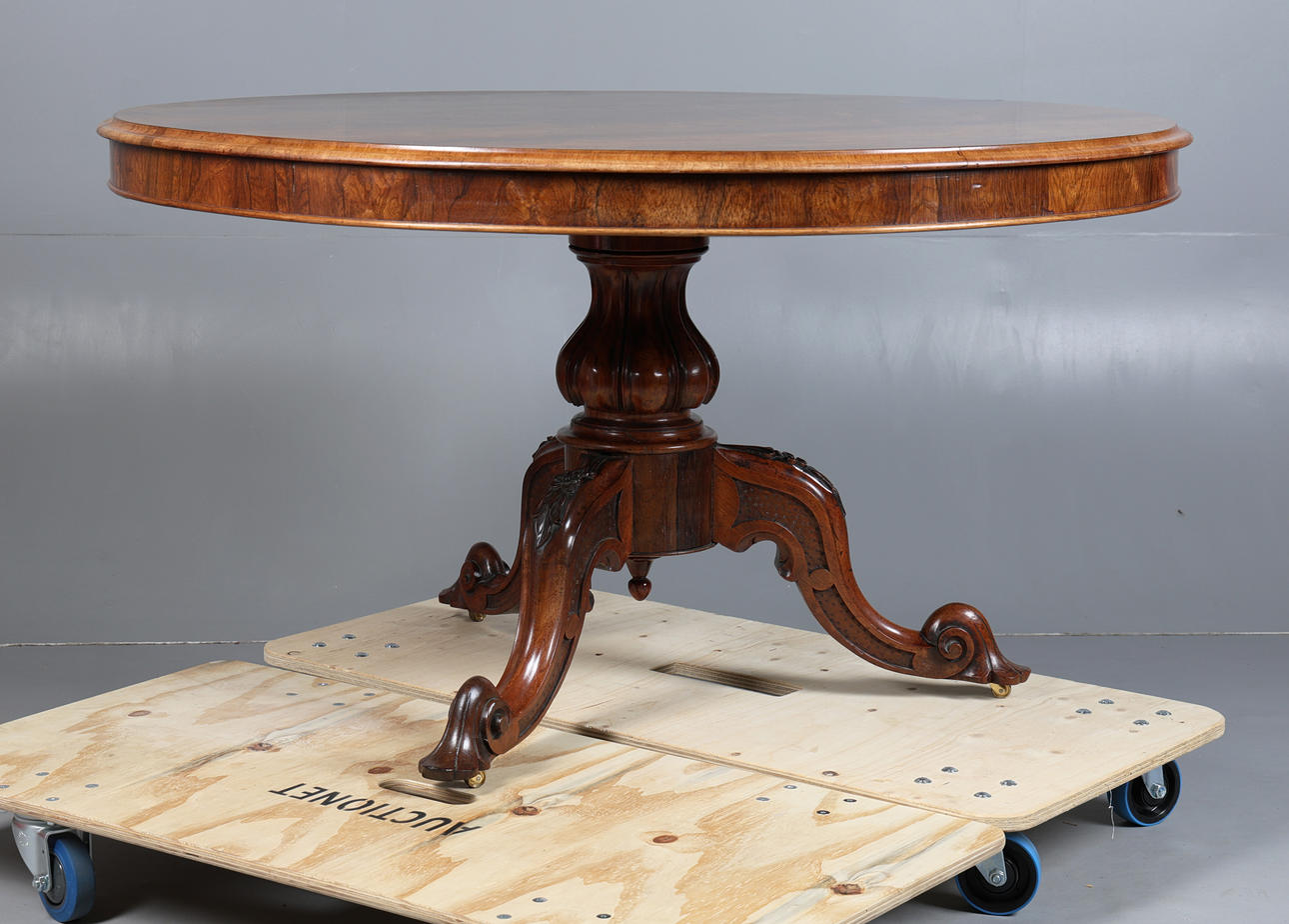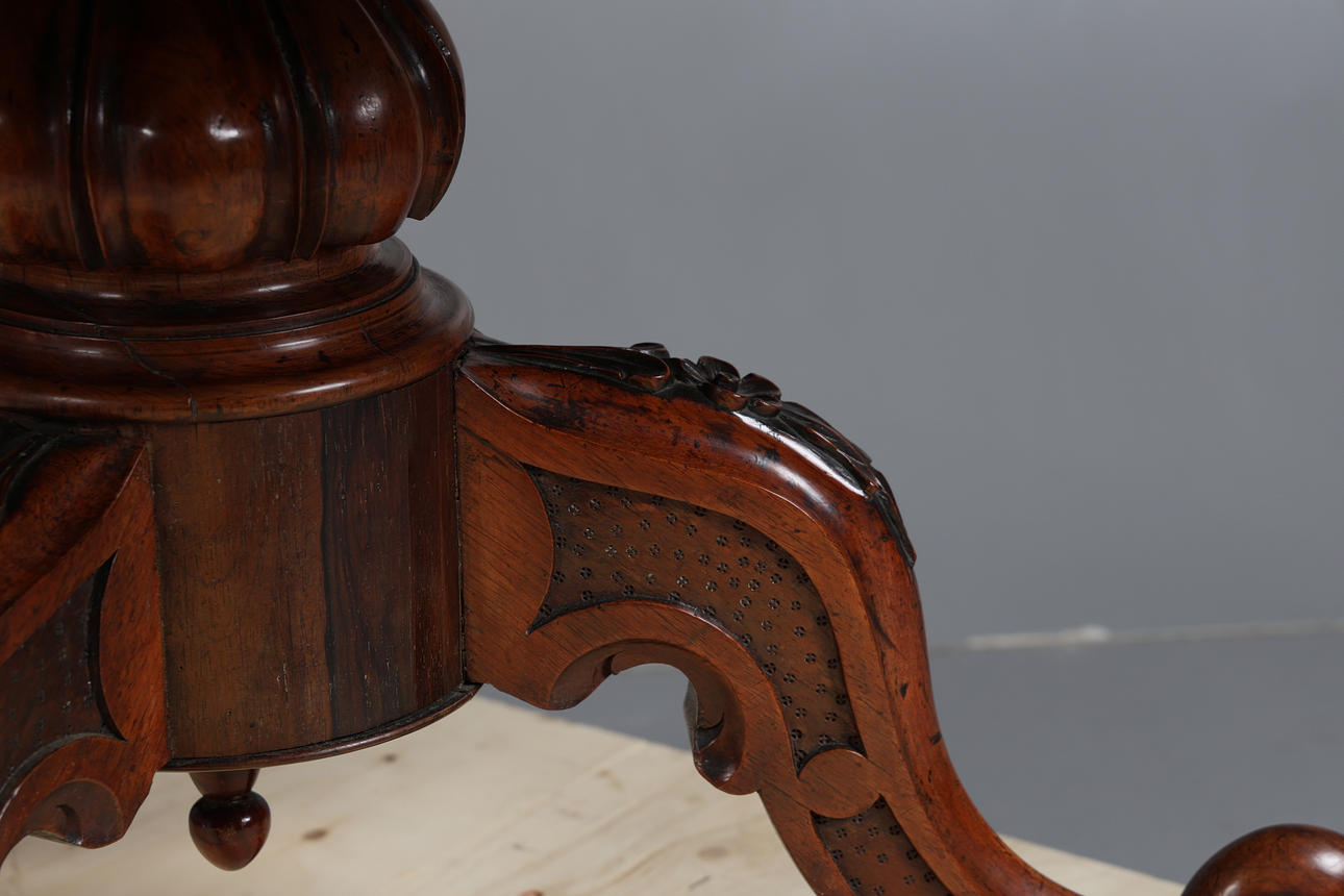 Pyöreä yläosa, jossa on muovattu reuna kiristetyn pylvään yläpuolella ja jalustalla pyyhkäistyt jalat pyörillä, korkeus 75 cm, halkaisija 132 cm.