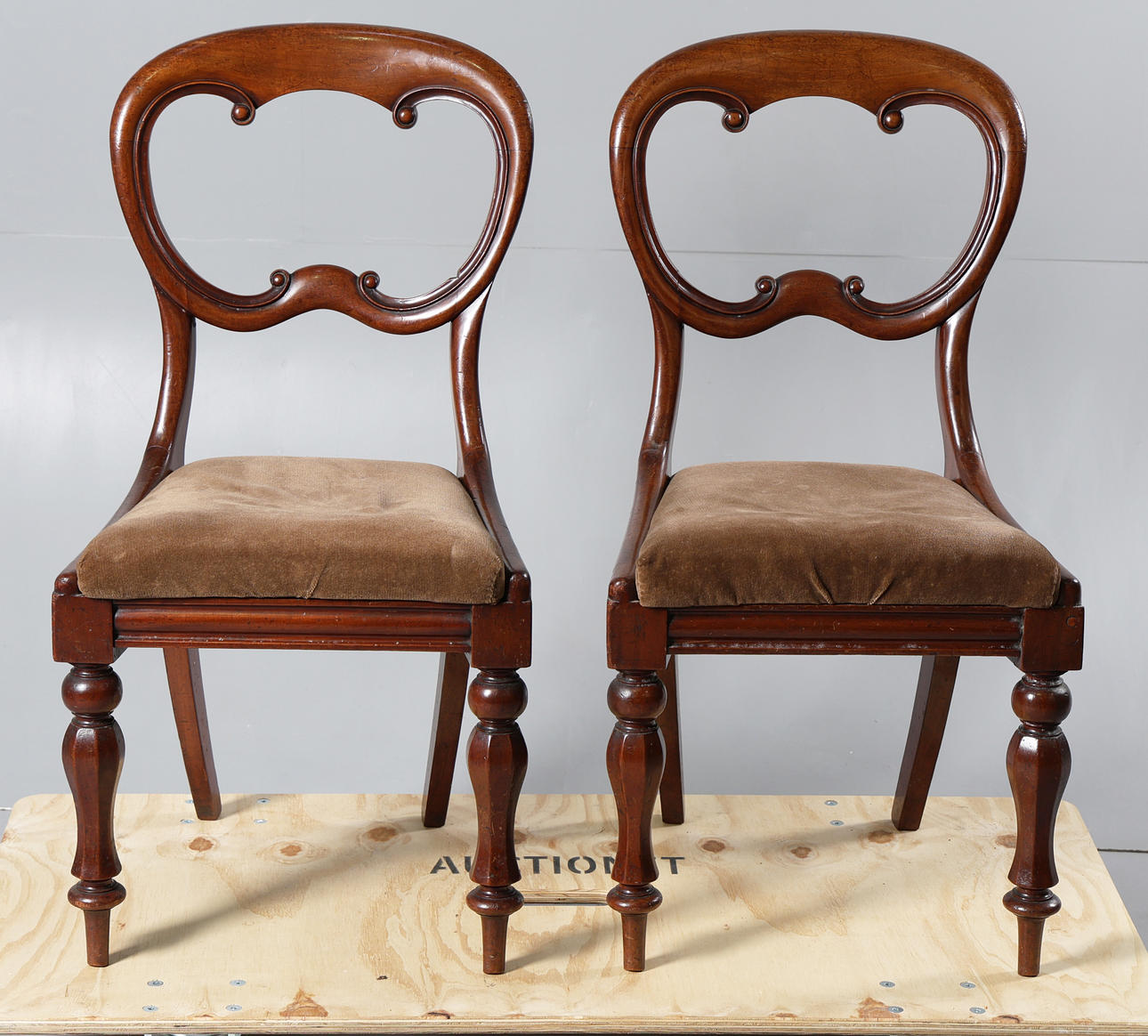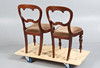 Siinä on pari kaarevaa ilmapalloselkänojaa, joissa on rullalla veistetyt kuviot, nostettu verhoiltuihin istuimiin, nostettu kahdeksankulmaisiin jaloihin, 87 cm korkea 46 cm leveä.