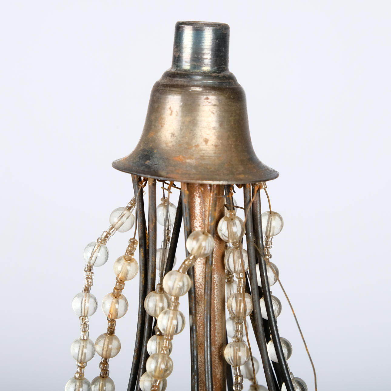 Lasihelmillä koristeltu lankakaruselli. Metallirunko puulevyllä
